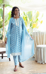 The Blue Serenity Kurta Set brings calm, airy elegance to your everyday ethnic wardrobe. Crafted in a soft blue hue, the kurta features delicate white embroidered motifs that add a touch of handcrafted charm while keeping the aesthetic light and soothing.