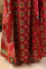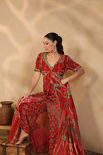 The Crimson Royal Ensemble is designed for moments that demand grandeur. Crafted on a luxurious red silk base, it features intricate floral and vine motifs that shimmer with heritage richness. The flowing, front-open overlay creates a graceful cascade, paired with coordinated flared pants that add contemporary ease.