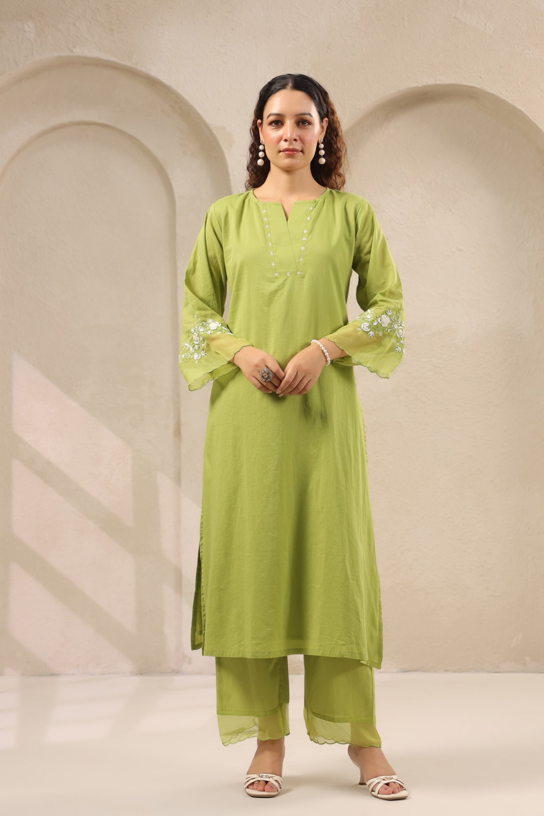 The kurta features delicate embroidery along the neckline and sleeves, adding just the right amount of sophistication without overwhelming its gentle charm. Paired with relaxed straight pants, the silhouette stays clean, refined, and comfortable throughout the day.