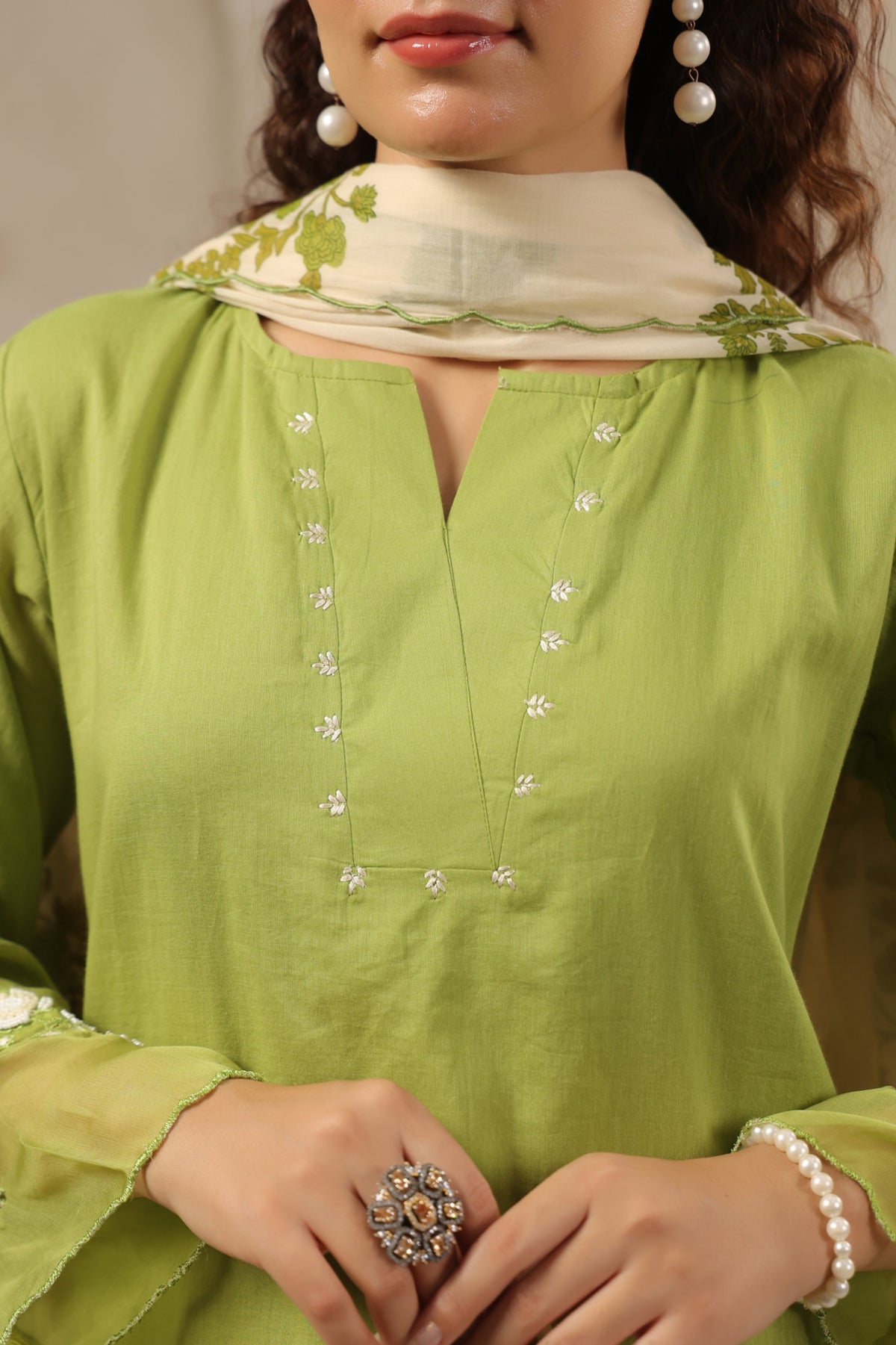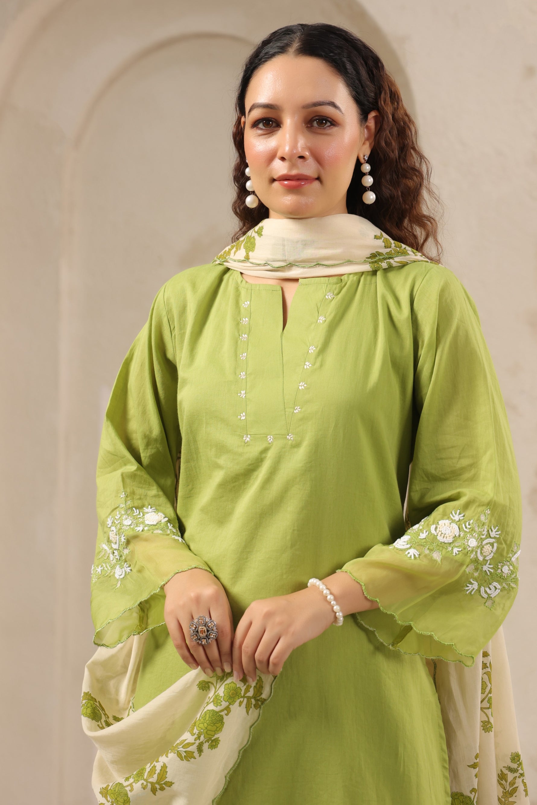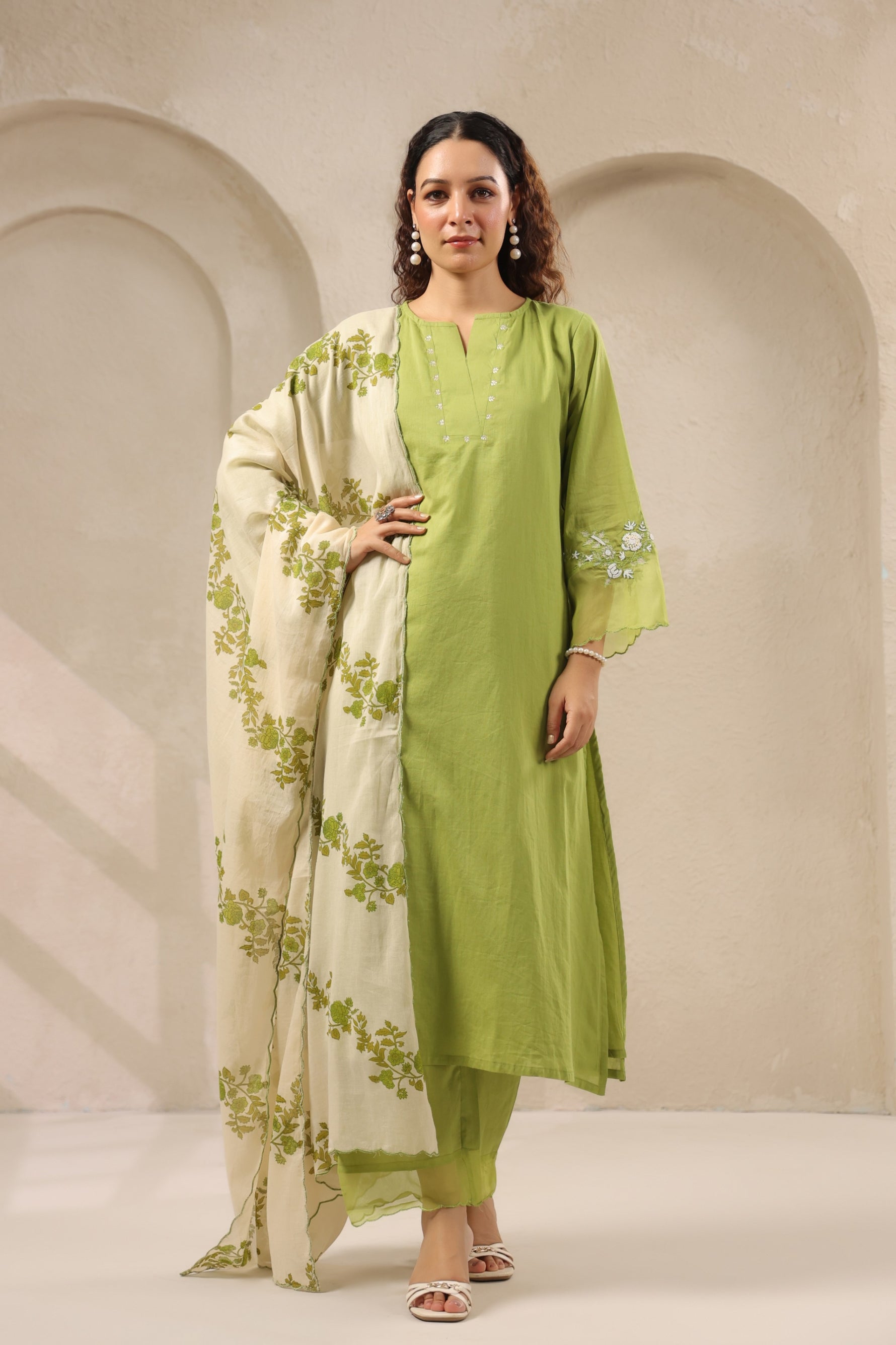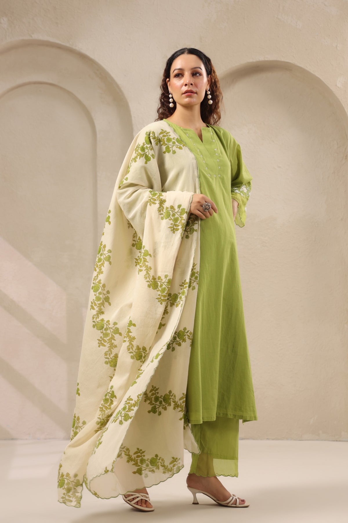 To complete the look, the contrasting ivory dupatta is adorned with green floral embroidery, bringing harmony and grace to the ensemble. Fresh, feminine, and effortlessly stylish — this set is ideal for festive brunches, daytime gatherings, or casual celebrations where comfort meets timeless beauty.