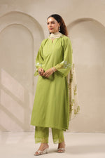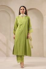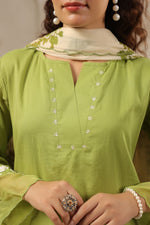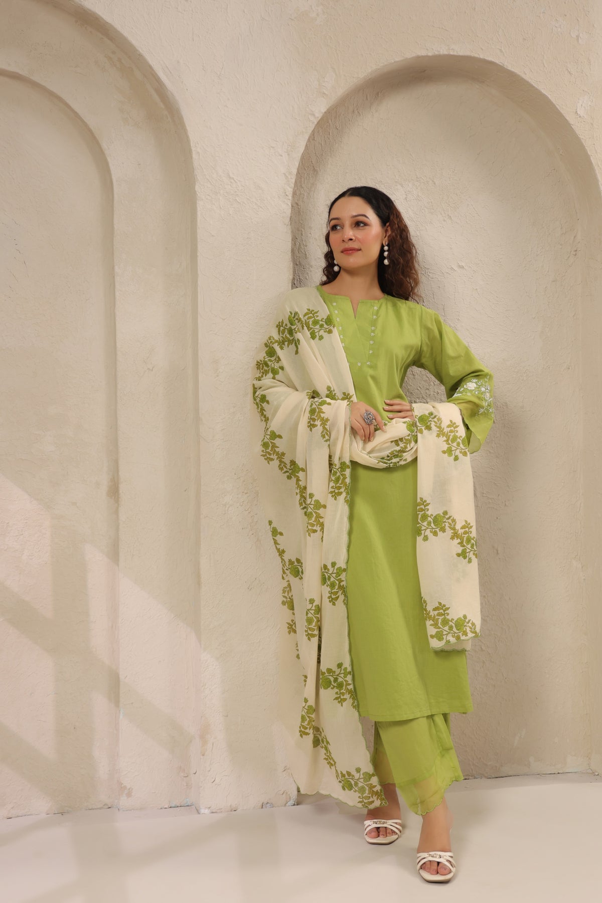 The Lime Whisper Ensemble brings refreshing elegance to your festive and daytime wardrobe. Crafted from soft, breathable cotton, this three-piece set feels feather-light and airy — perfect for warm days and easy celebrations.