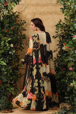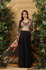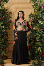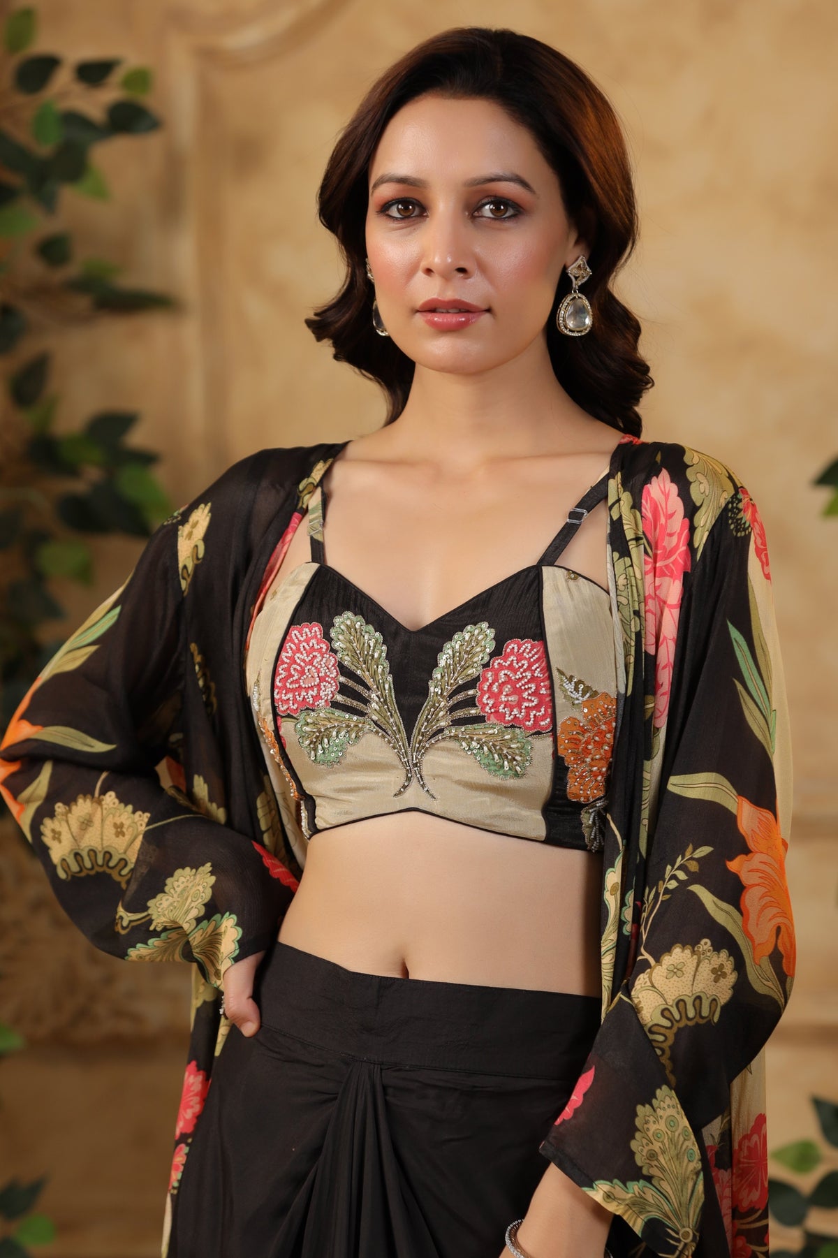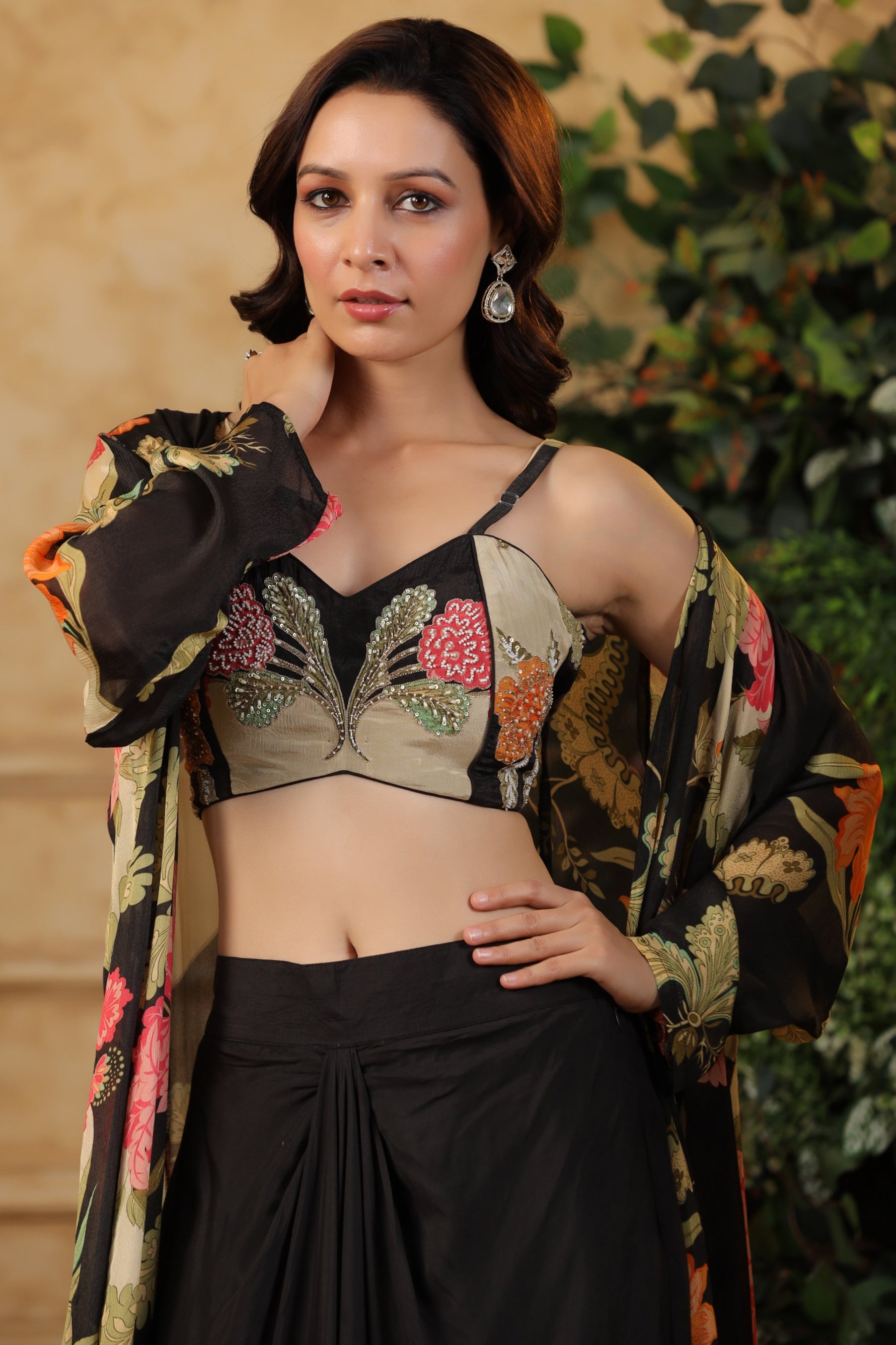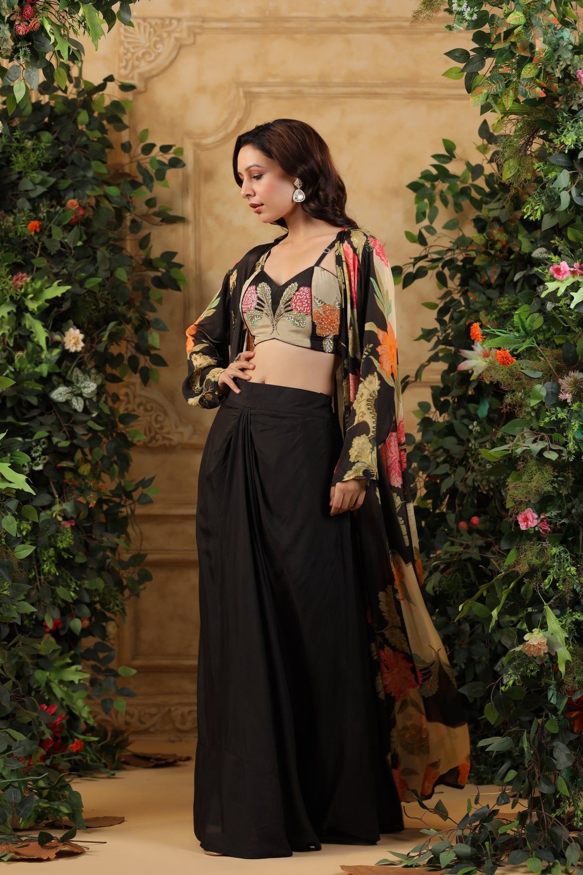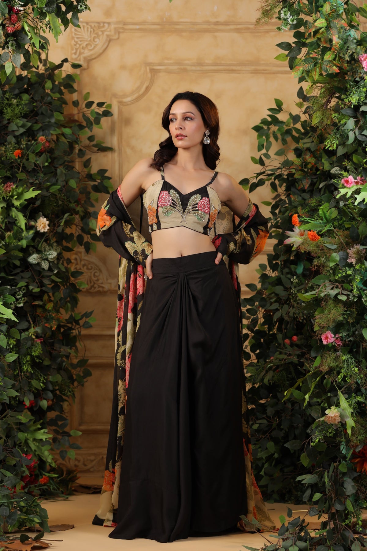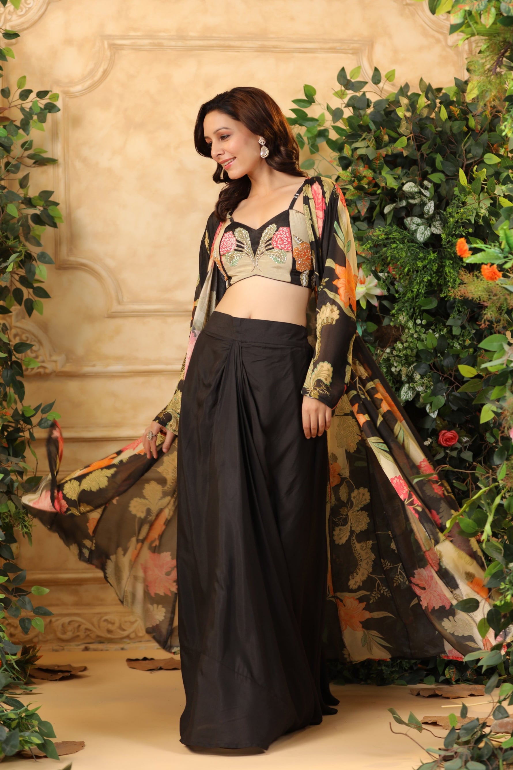 Paired with a flowy black draped skirt, the set creates graceful movement with every step, offering a sculpted yet effortless silhouette. Completing the ensemble is the breathtaking floral-printed cape — a dramatic trailing piece that elevates the outfit into pure runway glamour.