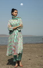 The Mint Blossom Kurta Set is a refreshing burst of summer charm — crafted in a soothing mint-green base and adorned with vibrant pink and green floral prints that feel lively, elegant, and perfect for sunlit days. Designed in a breezy A-line silhouette, the kurta offers effortless movement and all-day comfort while maintaining a polished, feminine shape.