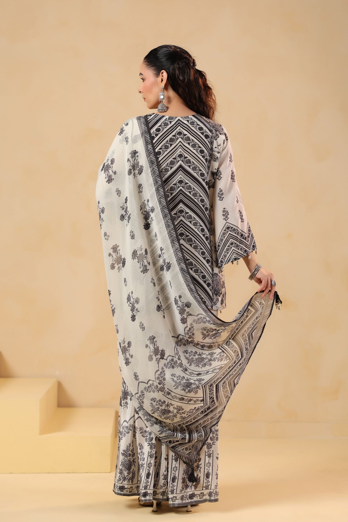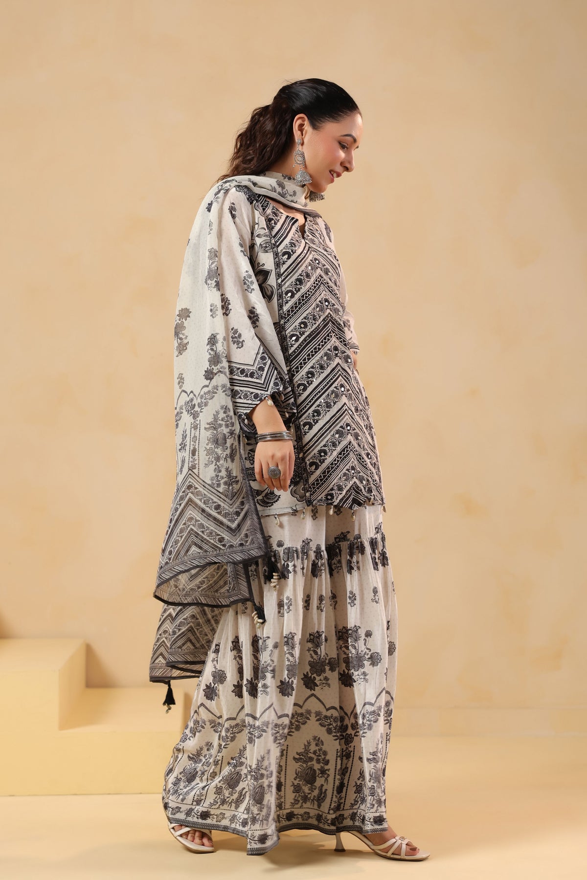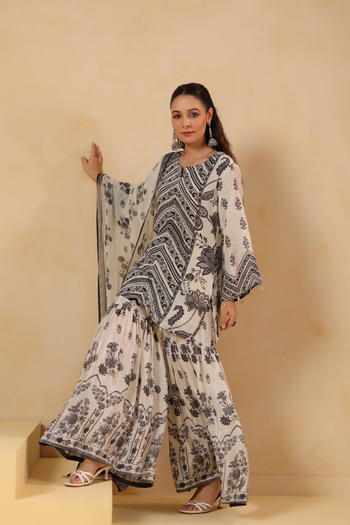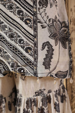 The Noir Bloom Sharara Set brings together classic charm and modern elegance in the most effortless way. Its elegant ivory base is elevated with intricate black floral prints, creating a striking yet timeless contrast. The kurta features beautifully detailed chevron embroidery that subtly enhances the silhouette, adding depth and artisanal finesse.