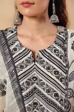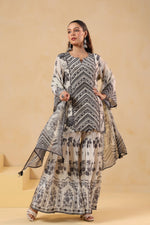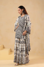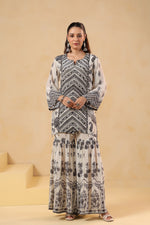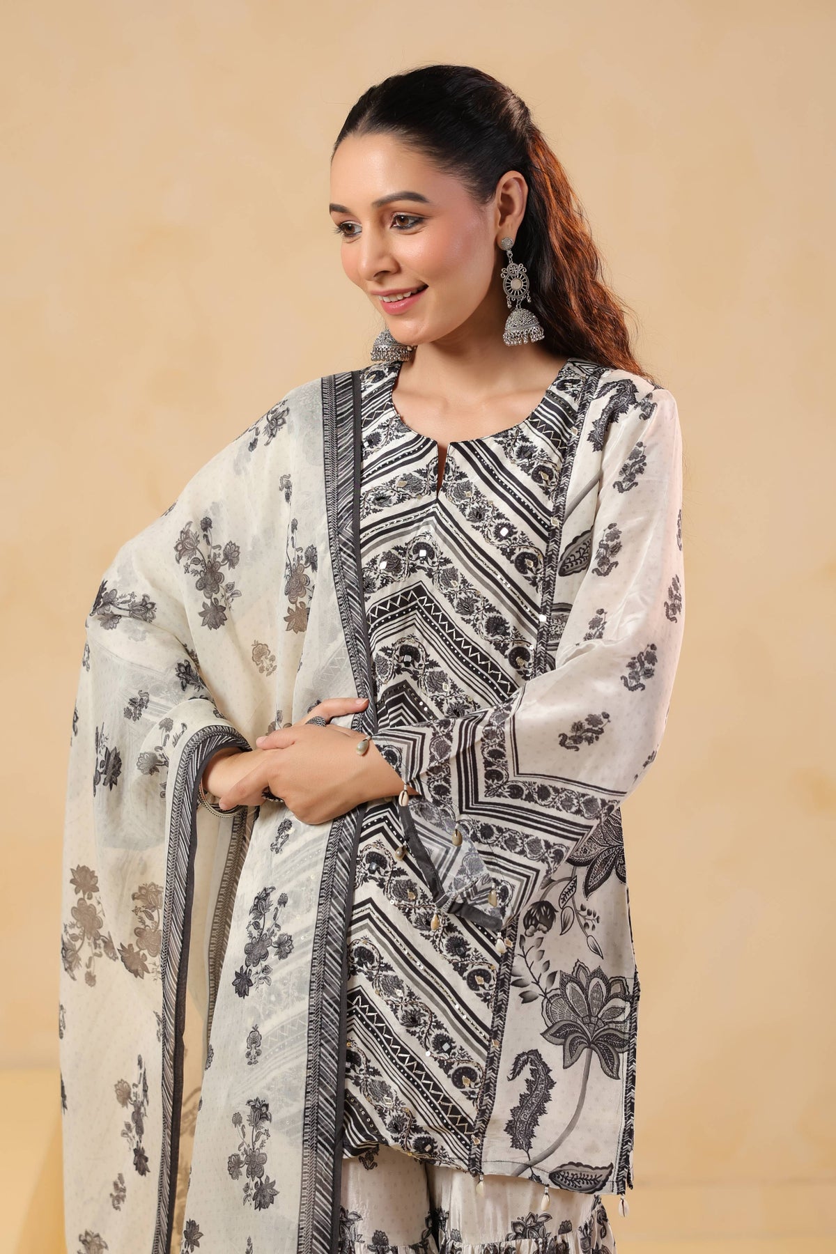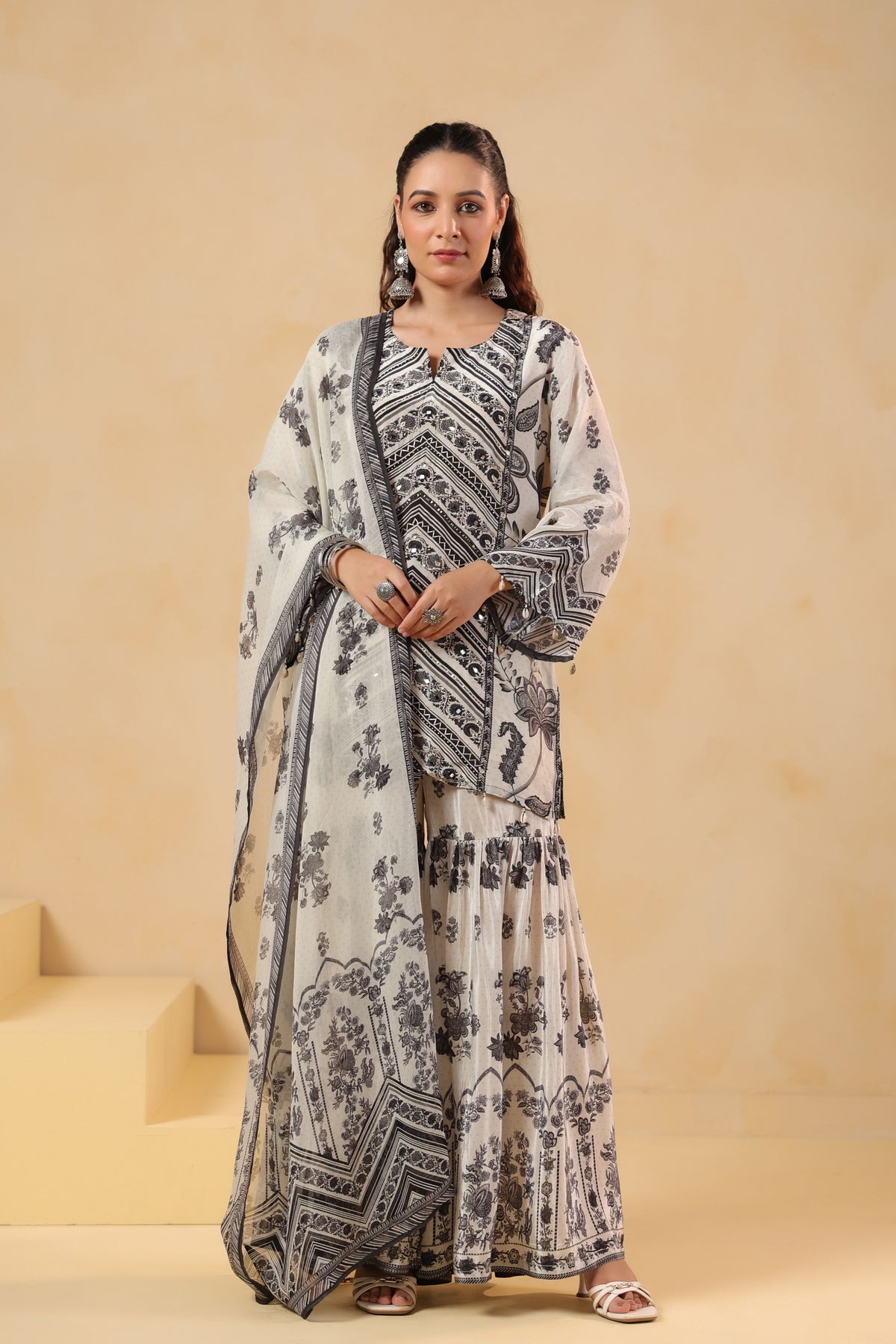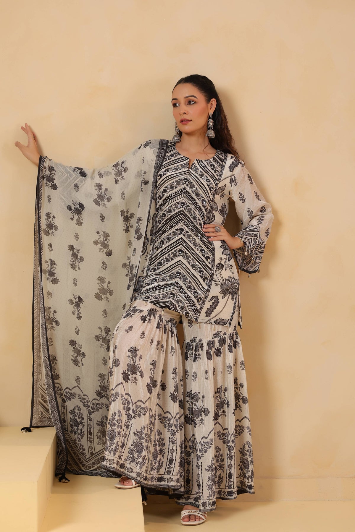 The Noir Bloom Sharara Set brings together classic charm and modern elegance in the most effortless way. Its elegant ivory base is elevated with intricate black floral prints, creating a striking yet timeless contrast. The kurta features beautifully detailed chevron embroidery that subtly enhances the silhouette, adding depth and artisanal finesse.