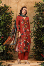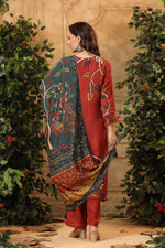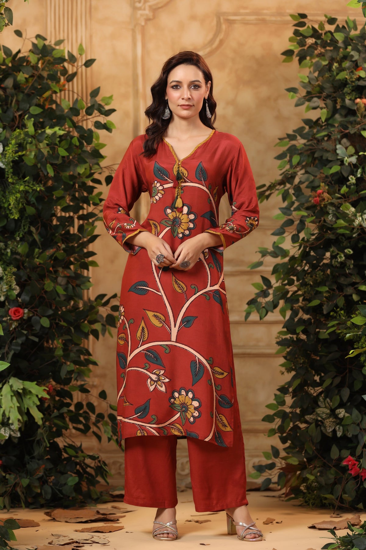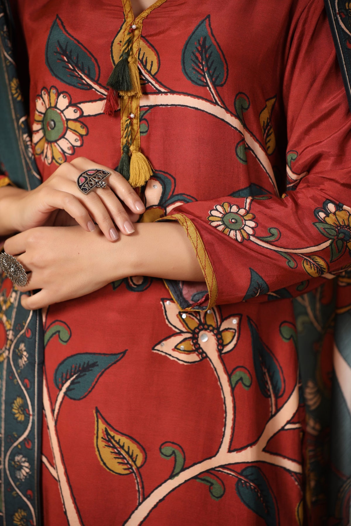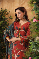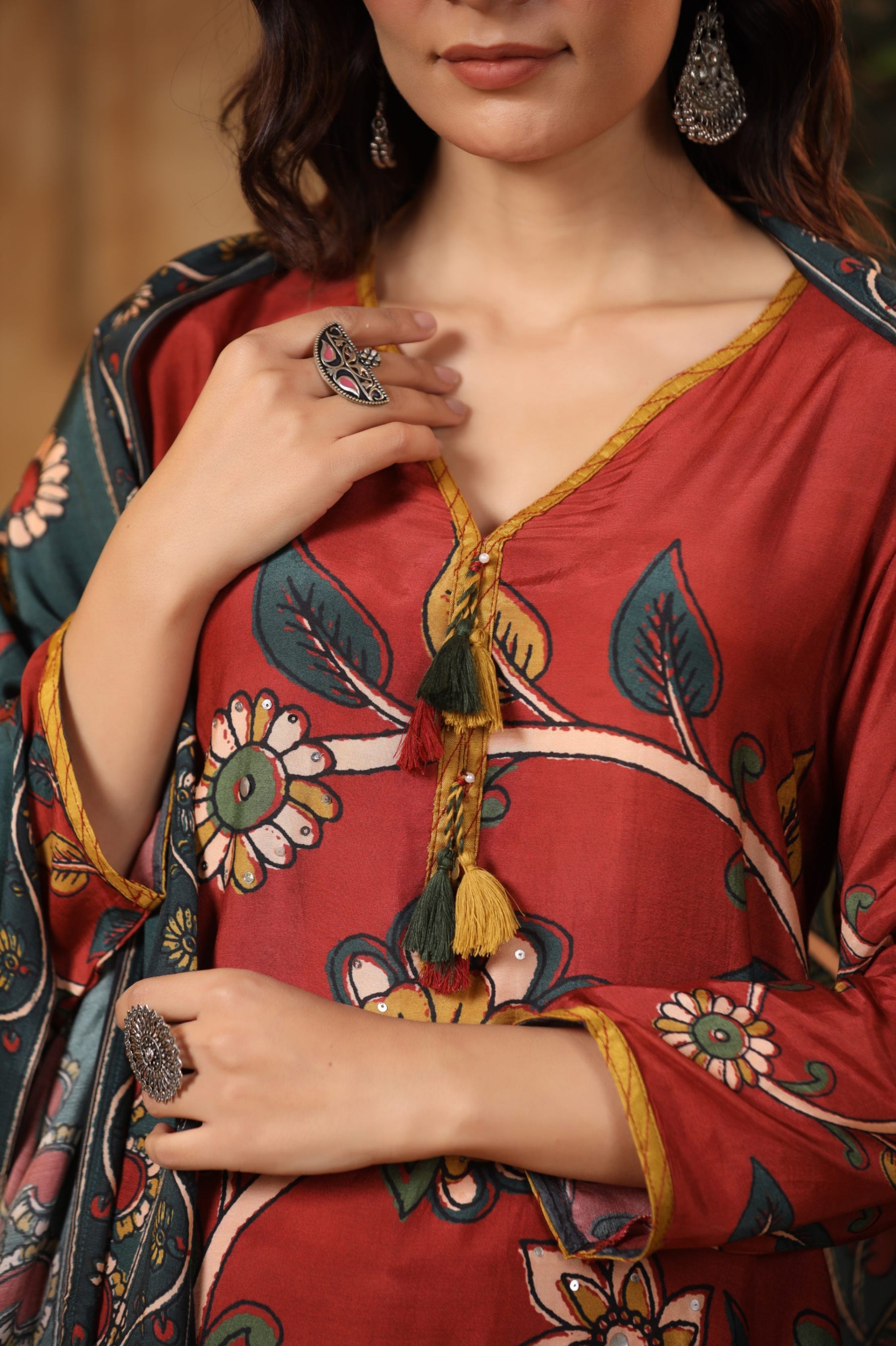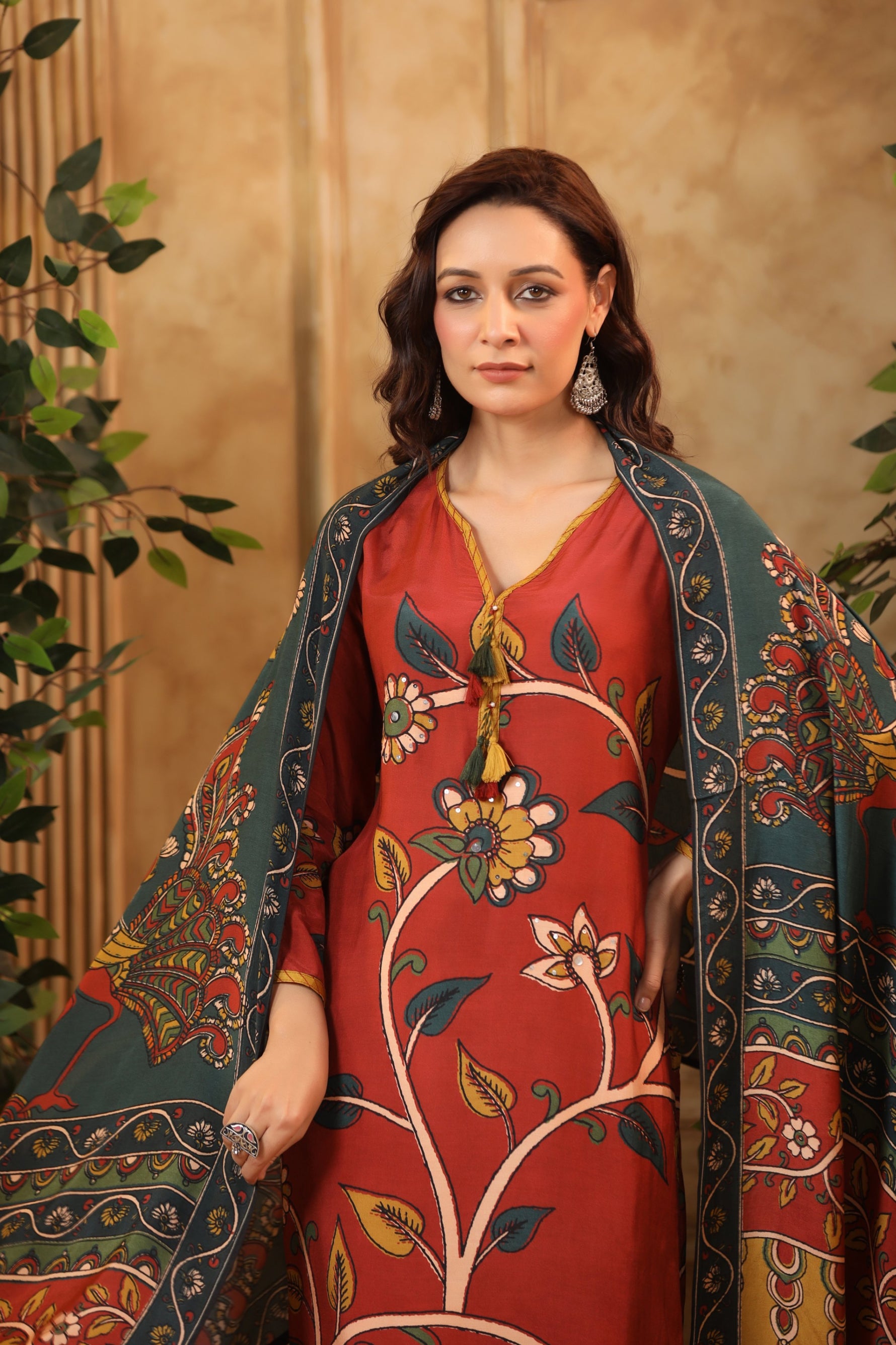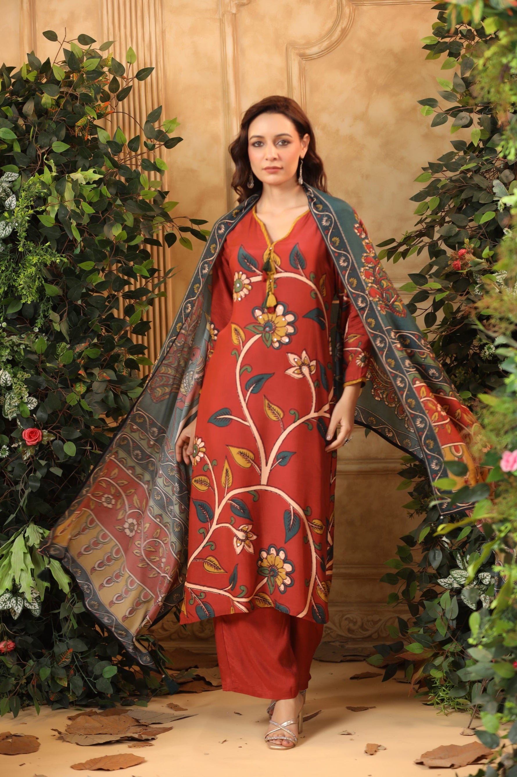 Paired with solid rust trousers, the ensemble maintains a refined balance — allowing the vivid prints and colours to shine without overwhelming. Perfect for festive gatherings, cultural events, or elegant daytime soirées, this three-piece set blends tradition and artistry with bold sophistication.