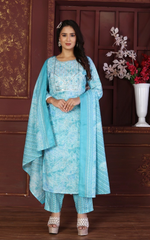 Coordinated printed straight pants keep the outfit cohesive and stylish, while the matching printed dupatta with detailed borders adds a complete, polished ethnic finish. Crafted from soft, breathable fabric, this ensemble feels light, airy, and comfortable, making it ideal for festive days, casual gatherings, or serene everyday elegance.