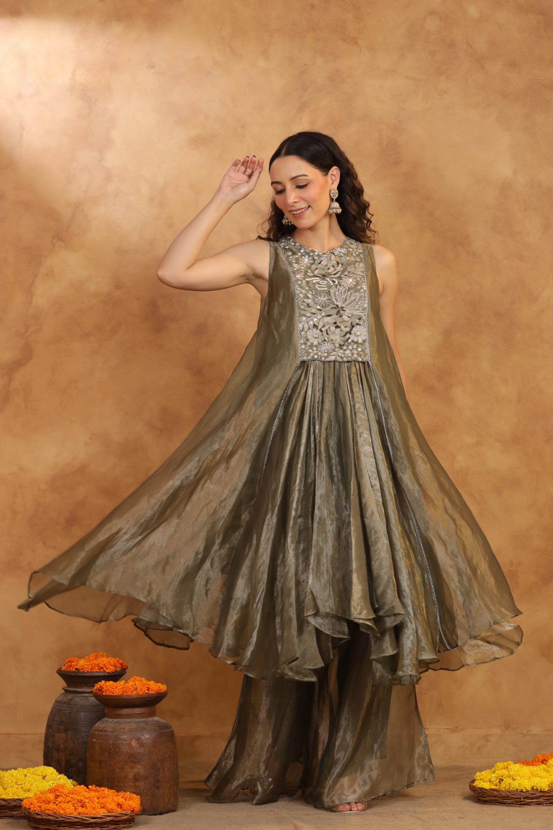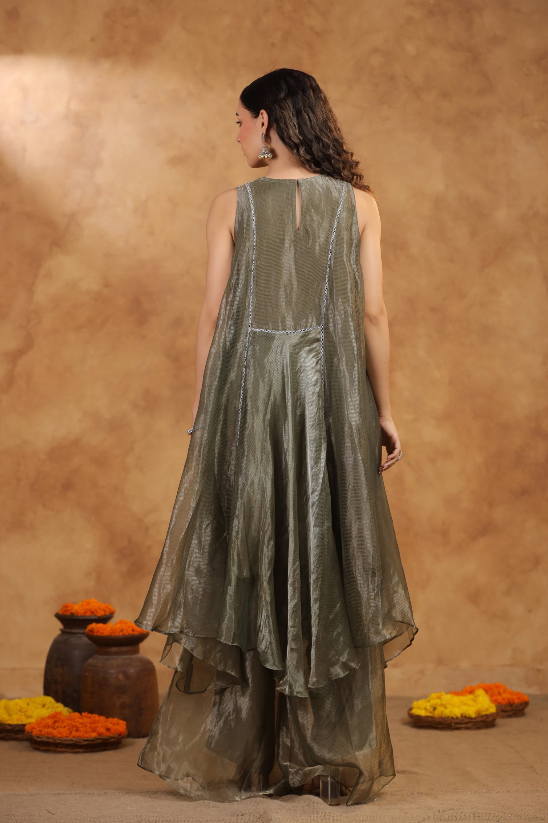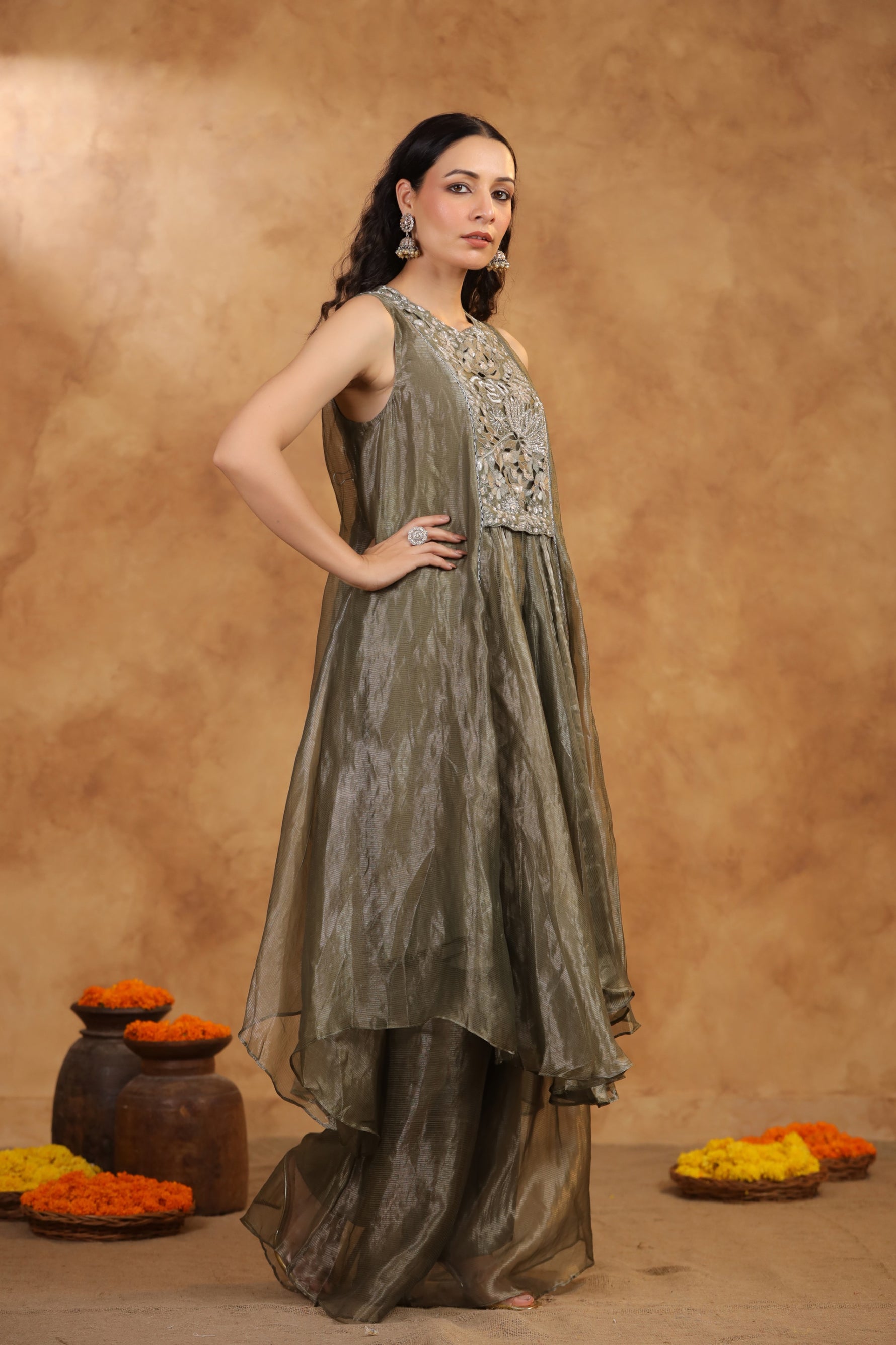 The Smoky Olive Shimmer Sharara Set is a luxurious celebration of understated opulence, crafted for evenings where elegance needs no introduction. Designed in a rich smoky olive shade, the ensemble is made from fluid organza that catches the light with a soft, metallic sheen — offering an effortlessly glamorous presence.