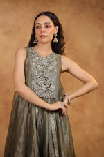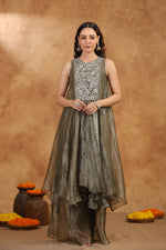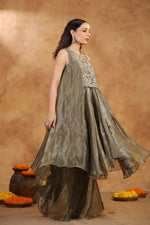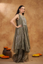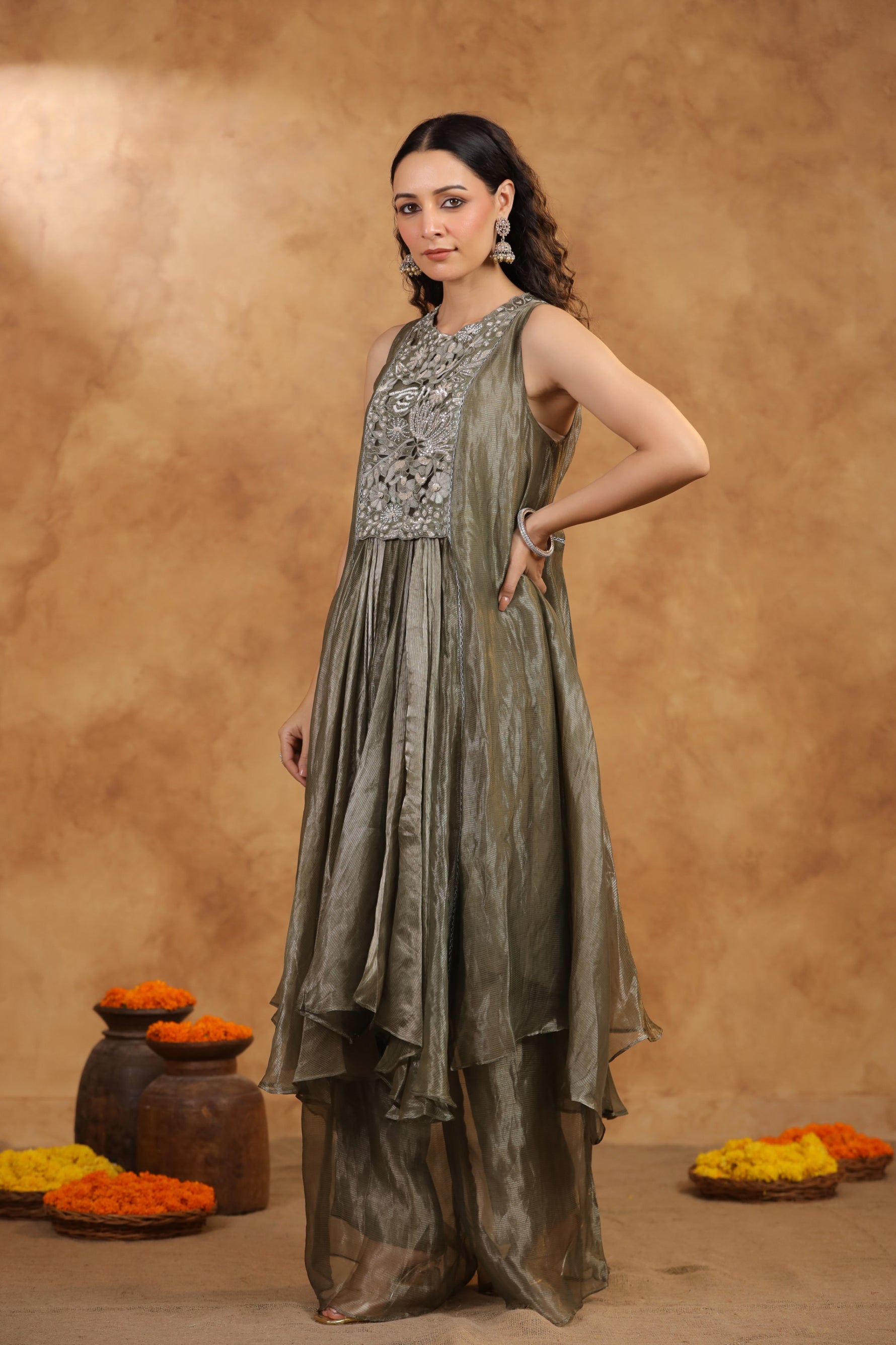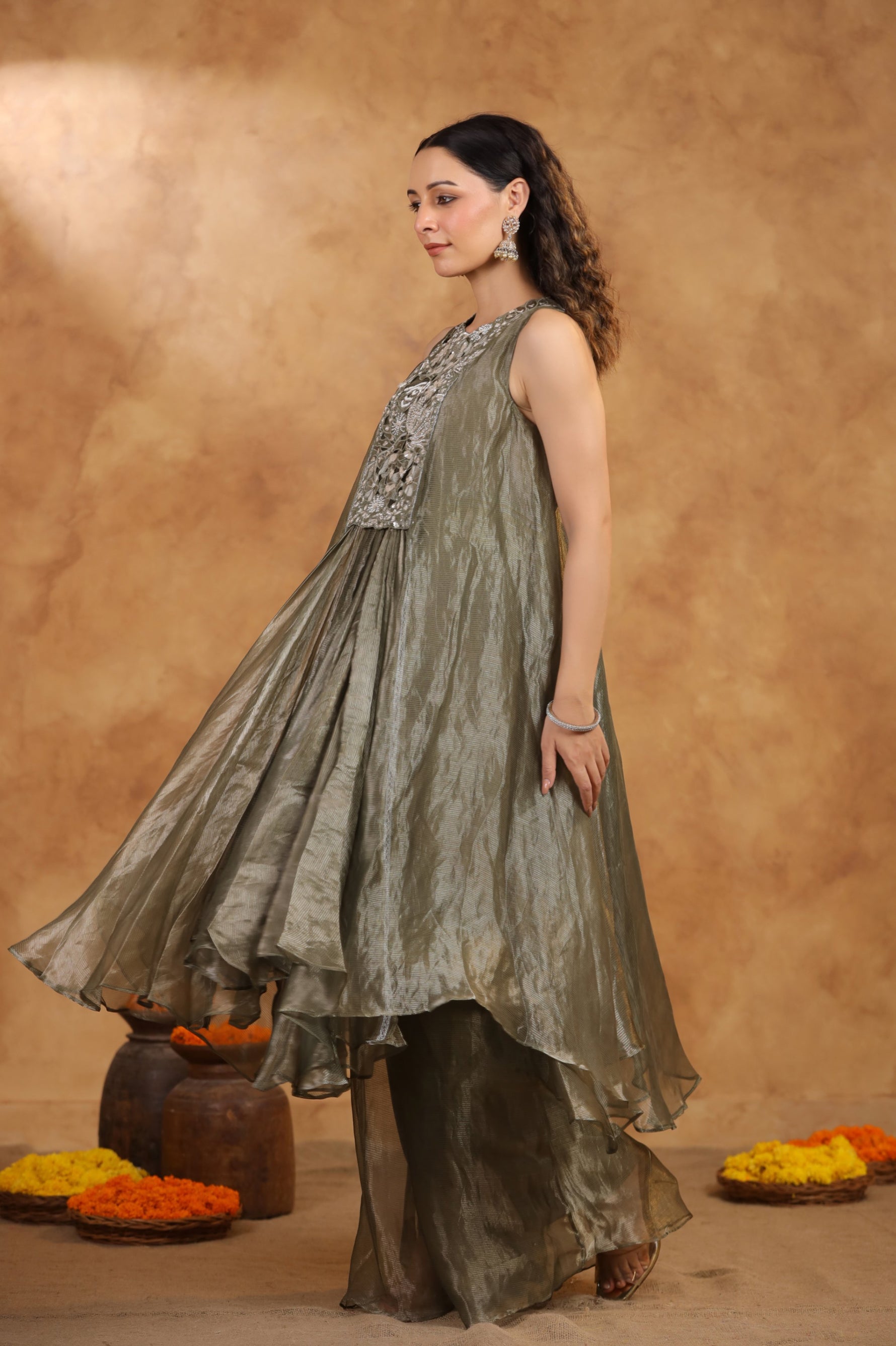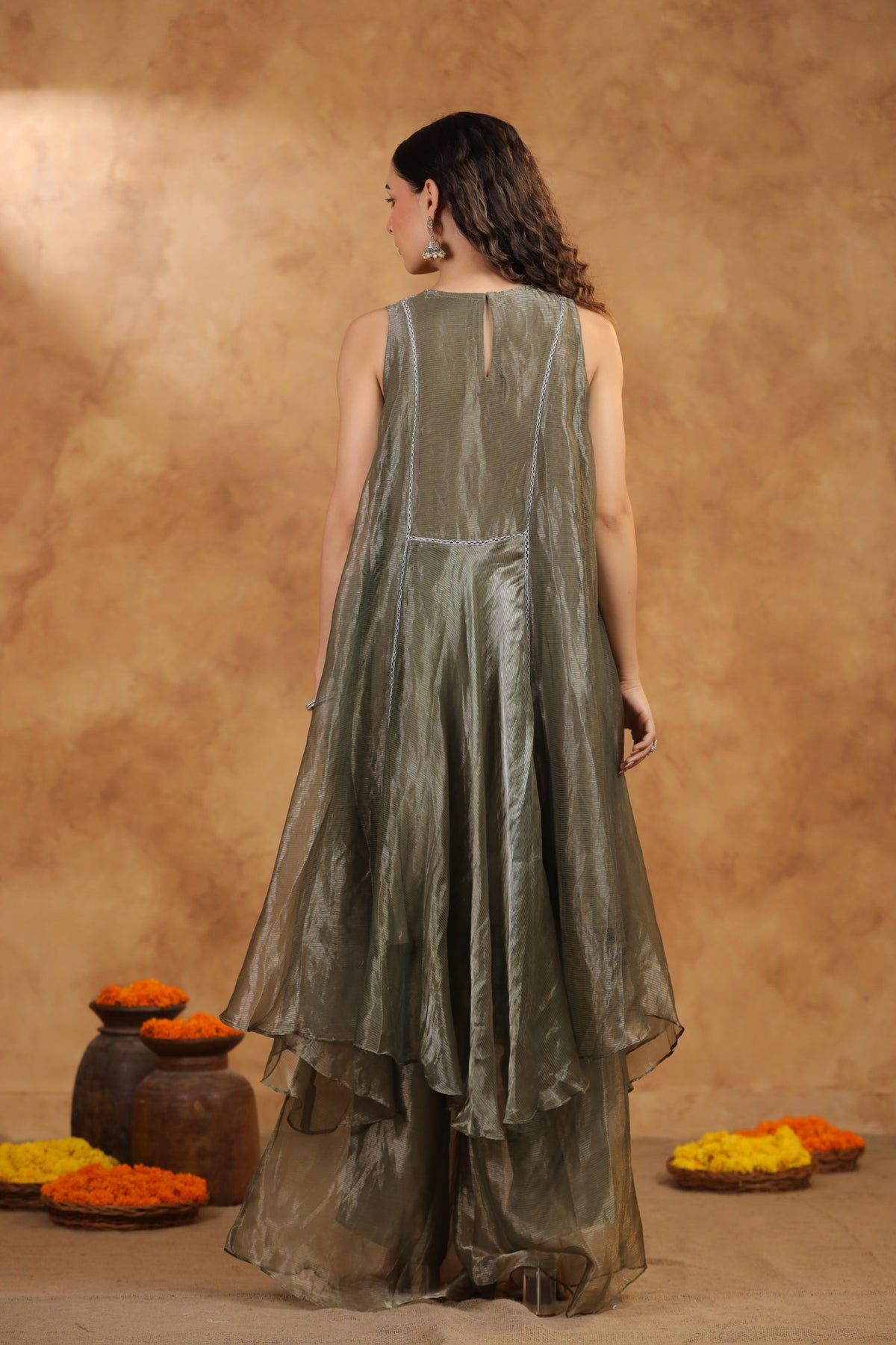 The Smoky Olive Shimmer Sharara Set is a luxurious celebration of understated opulence, crafted for evenings where elegance needs no introduction. Designed in a rich smoky olive shade, the ensemble is made from fluid organza that catches the light with a soft, metallic sheen — offering an effortlessly glamorous presence.