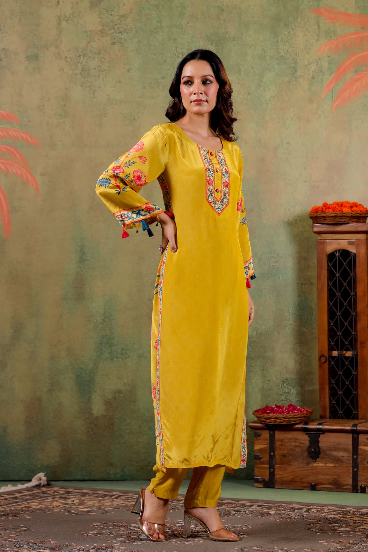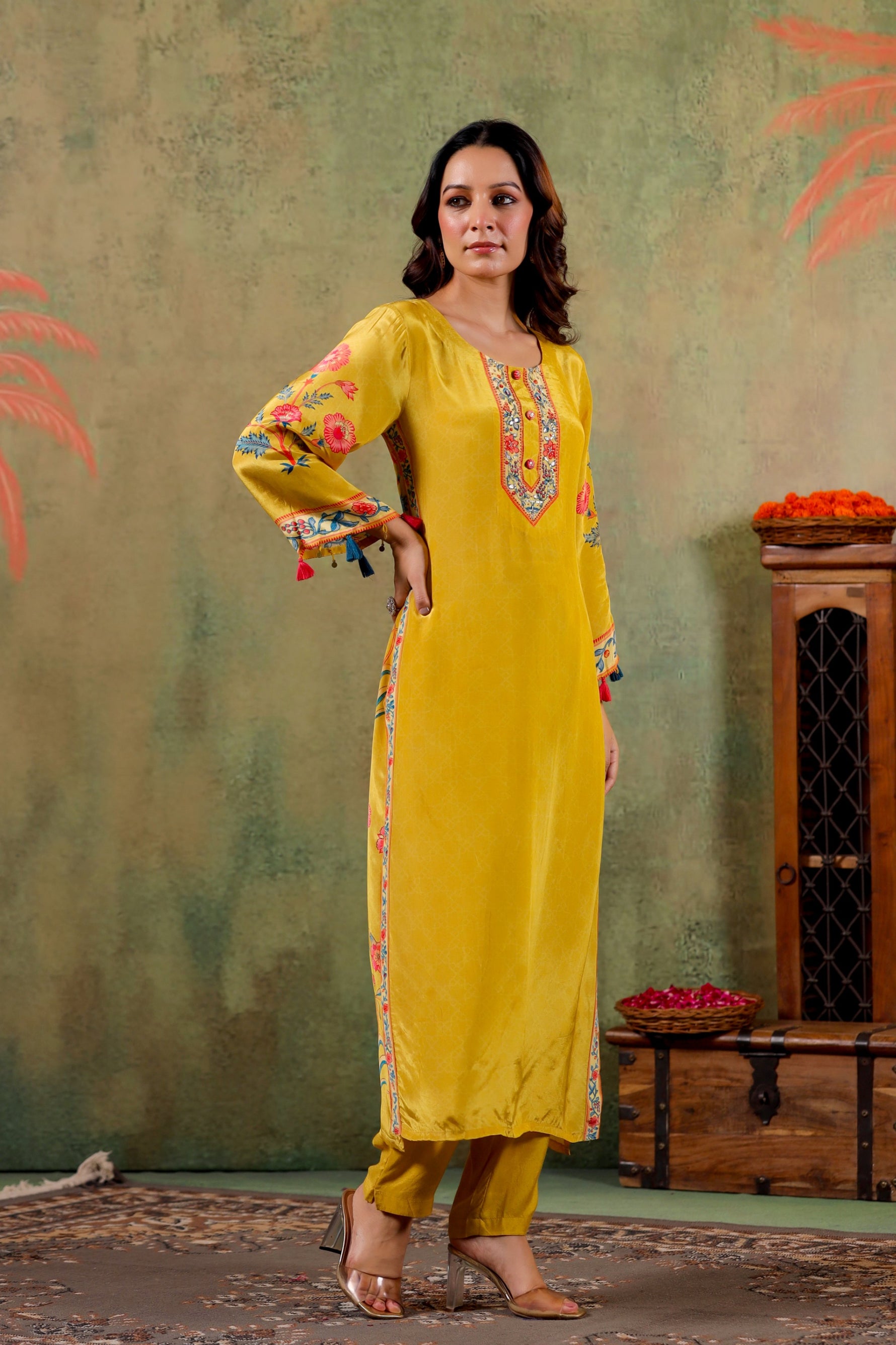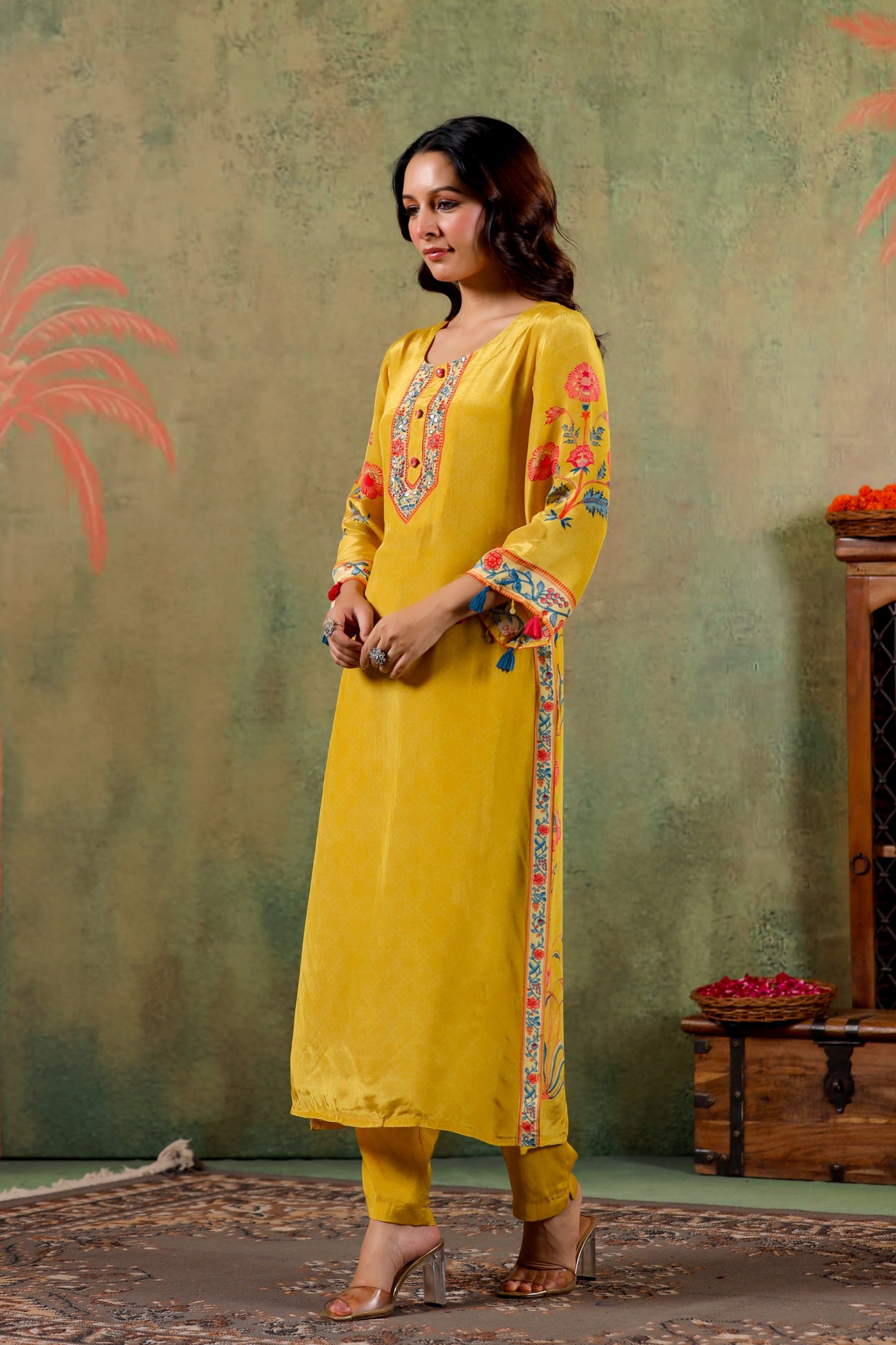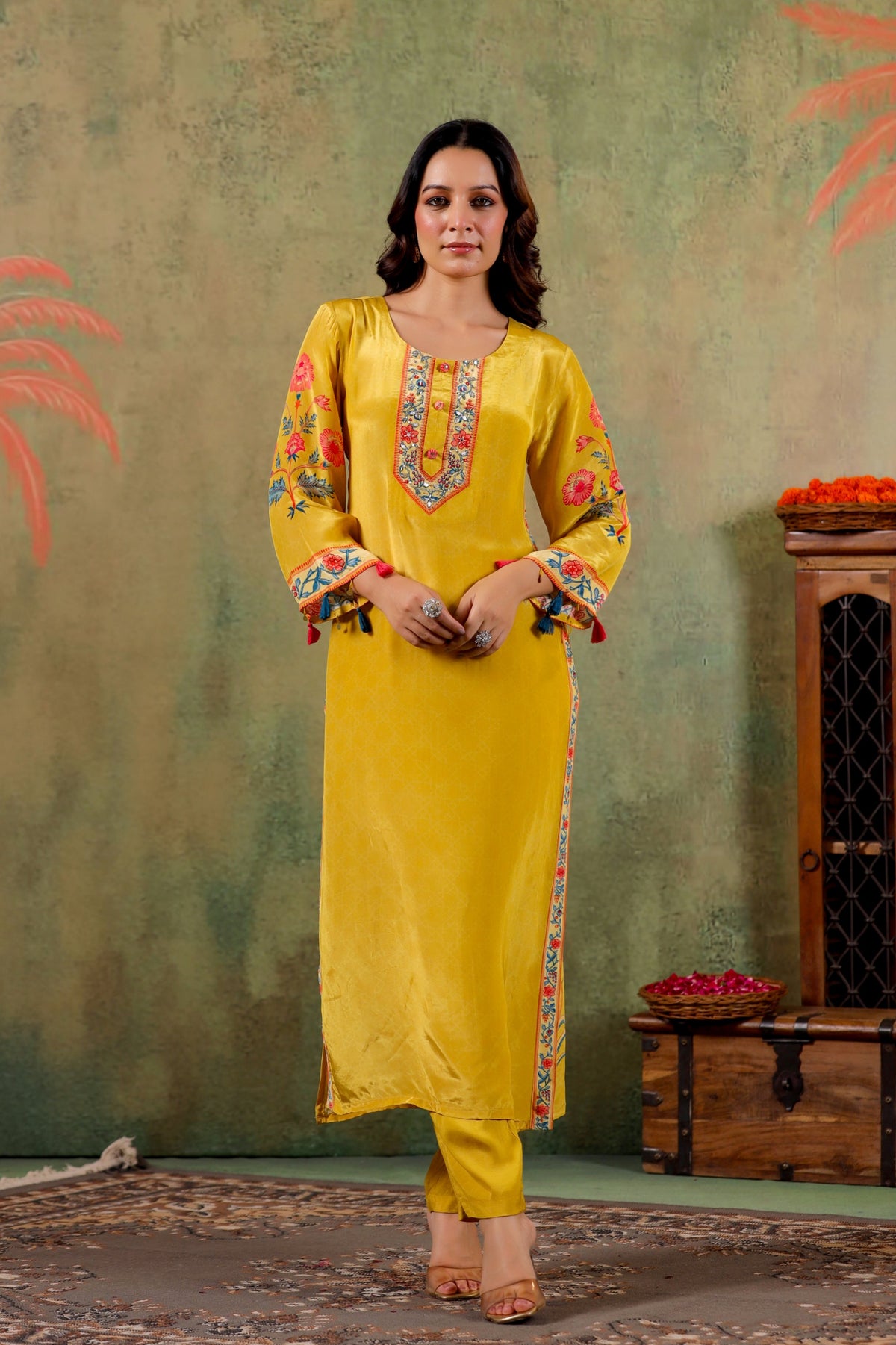 The Sunlit Blossom Embroidered Kurta Set is a radiant ode to festive charm, crafted in a warm mustard yellow silk fabric that instantly brightens any celebration. The kurta is adorned with exquisite multicolour floral embroidery along the neckline and sleeves, bringing rich handcrafted elegance and vibrant artistry to the ensemble.