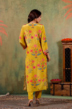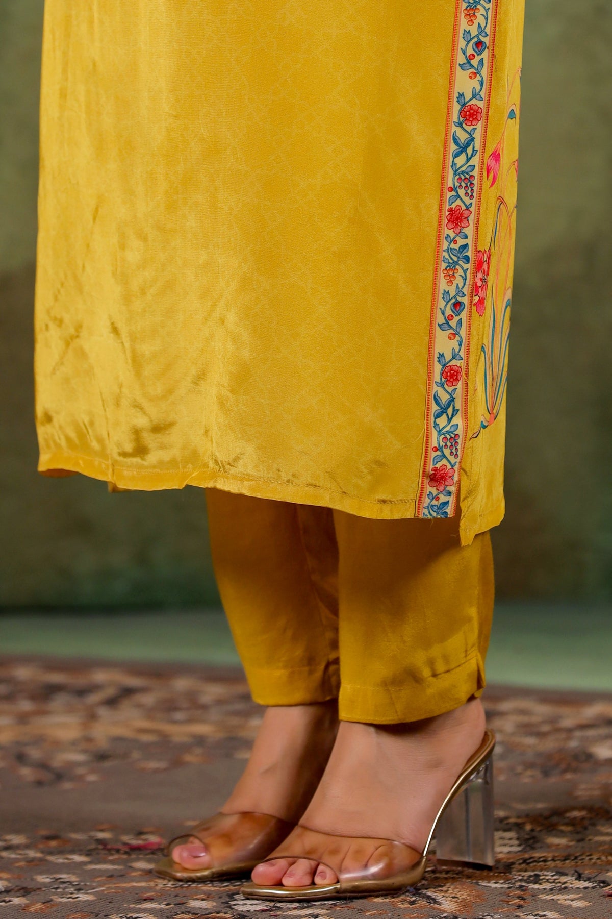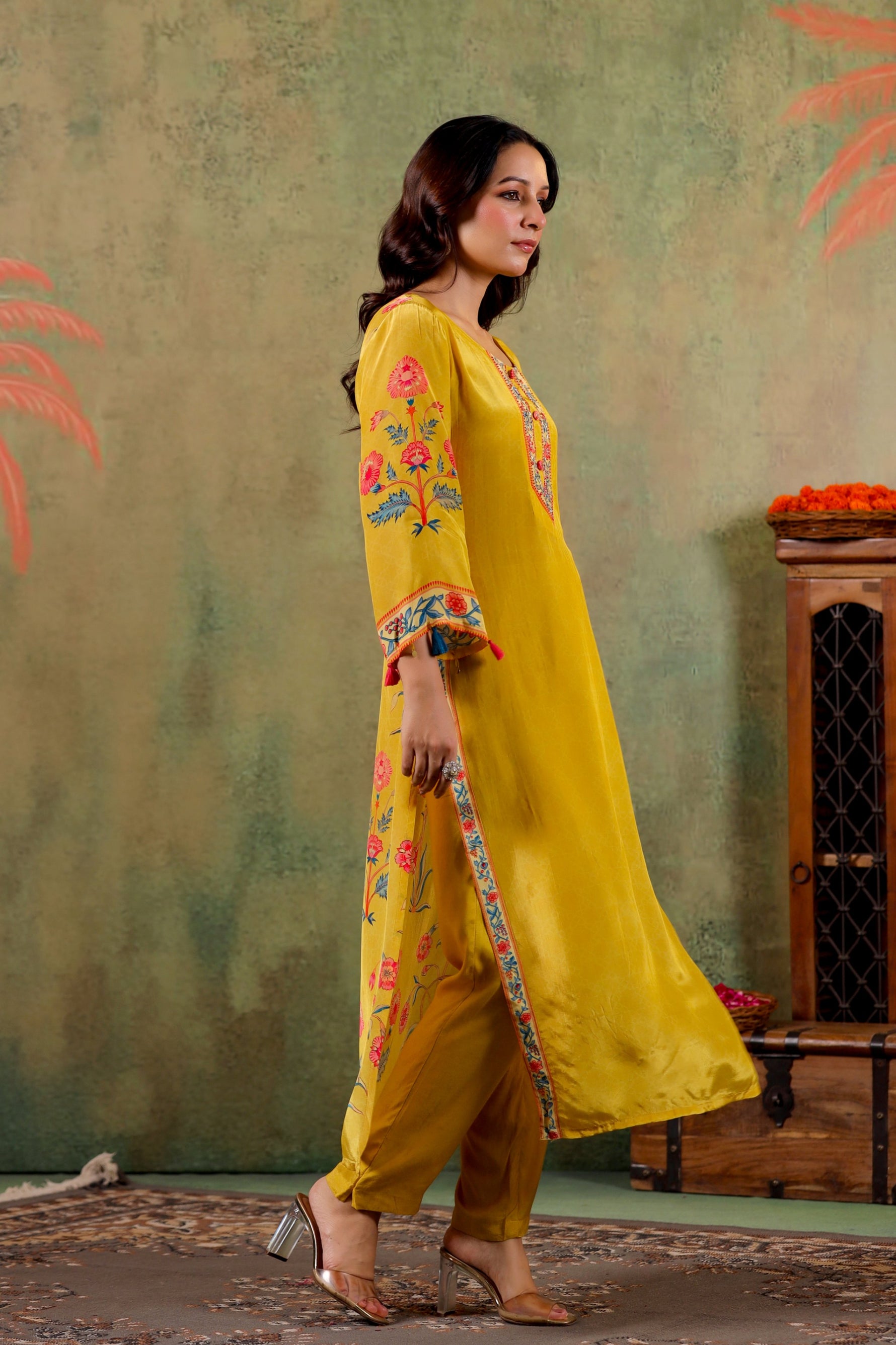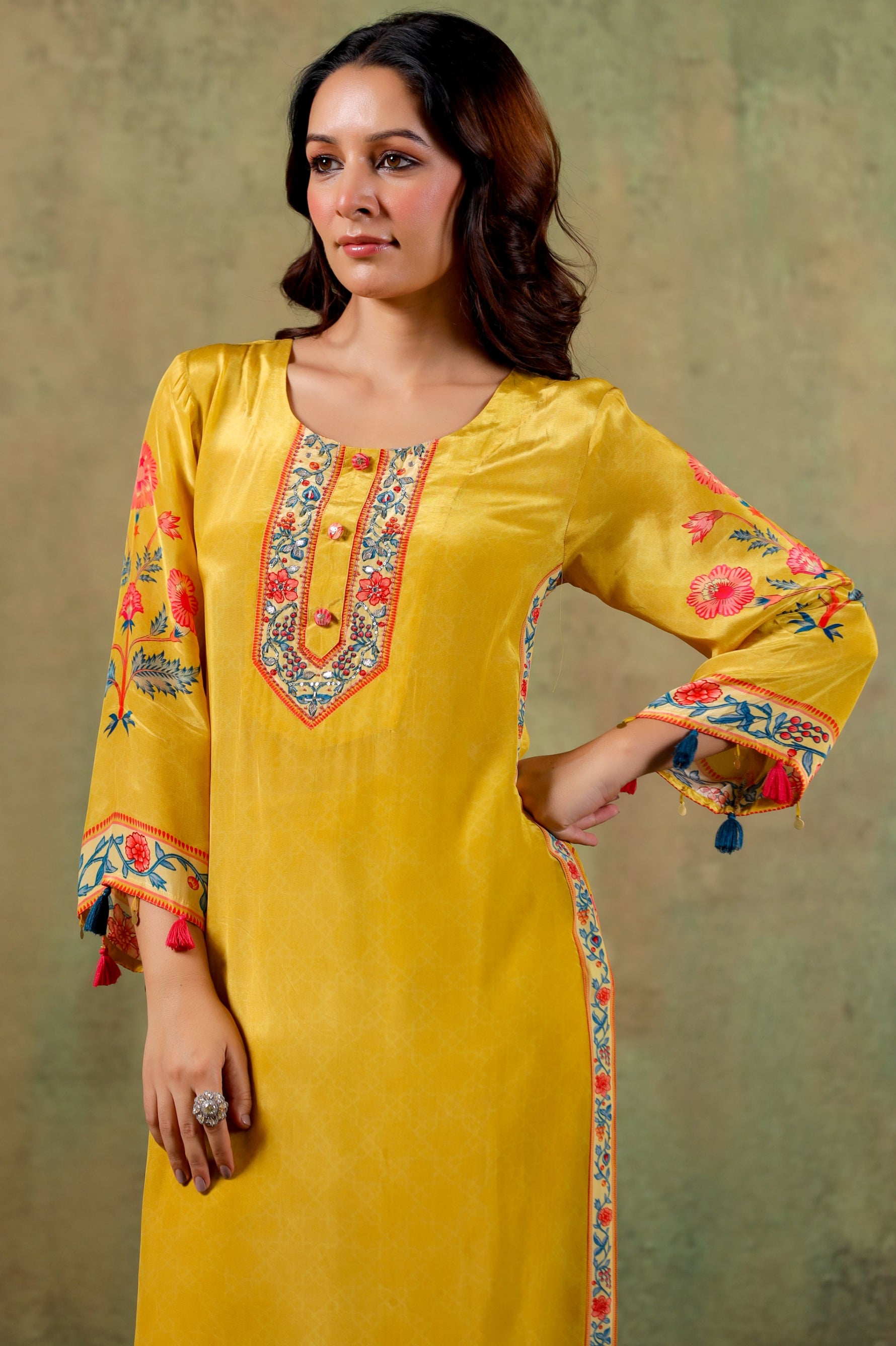 The Sunlit Blossom Embroidered Kurta Set is a radiant ode to festive charm, crafted in a warm mustard yellow silk fabric that instantly brightens any celebration. The kurta is adorned with exquisite multicolour floral embroidery along the neckline and sleeves, bringing rich handcrafted elegance and vibrant artistry to the ensemble.