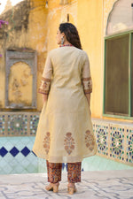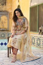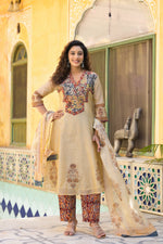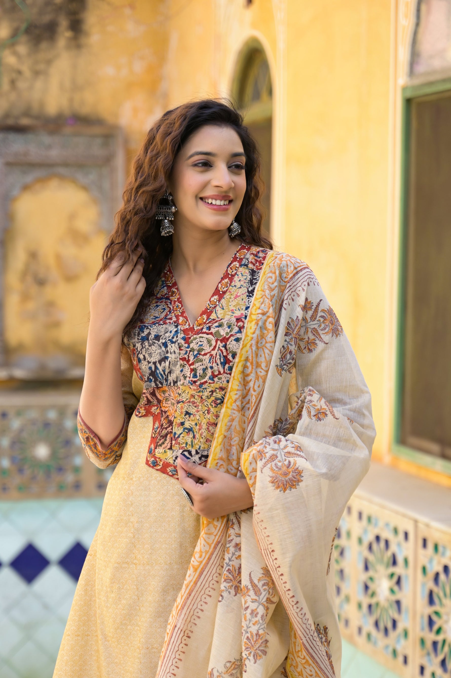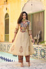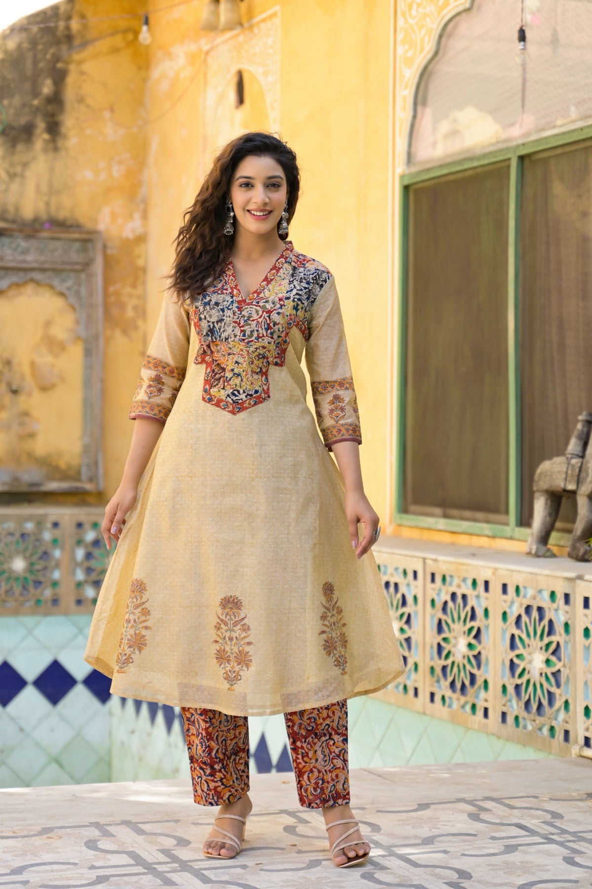 This ensemble features handcrafted embroidery and traditional prints. Slight variations in motif placement, embroidery depth, or print intensity are natural characteristics of artisanal craft. The beige tone may appear warmer or cooler depending on lighting and screen settings. Handle embroidered sections with care to preserve their detail and longevity.
