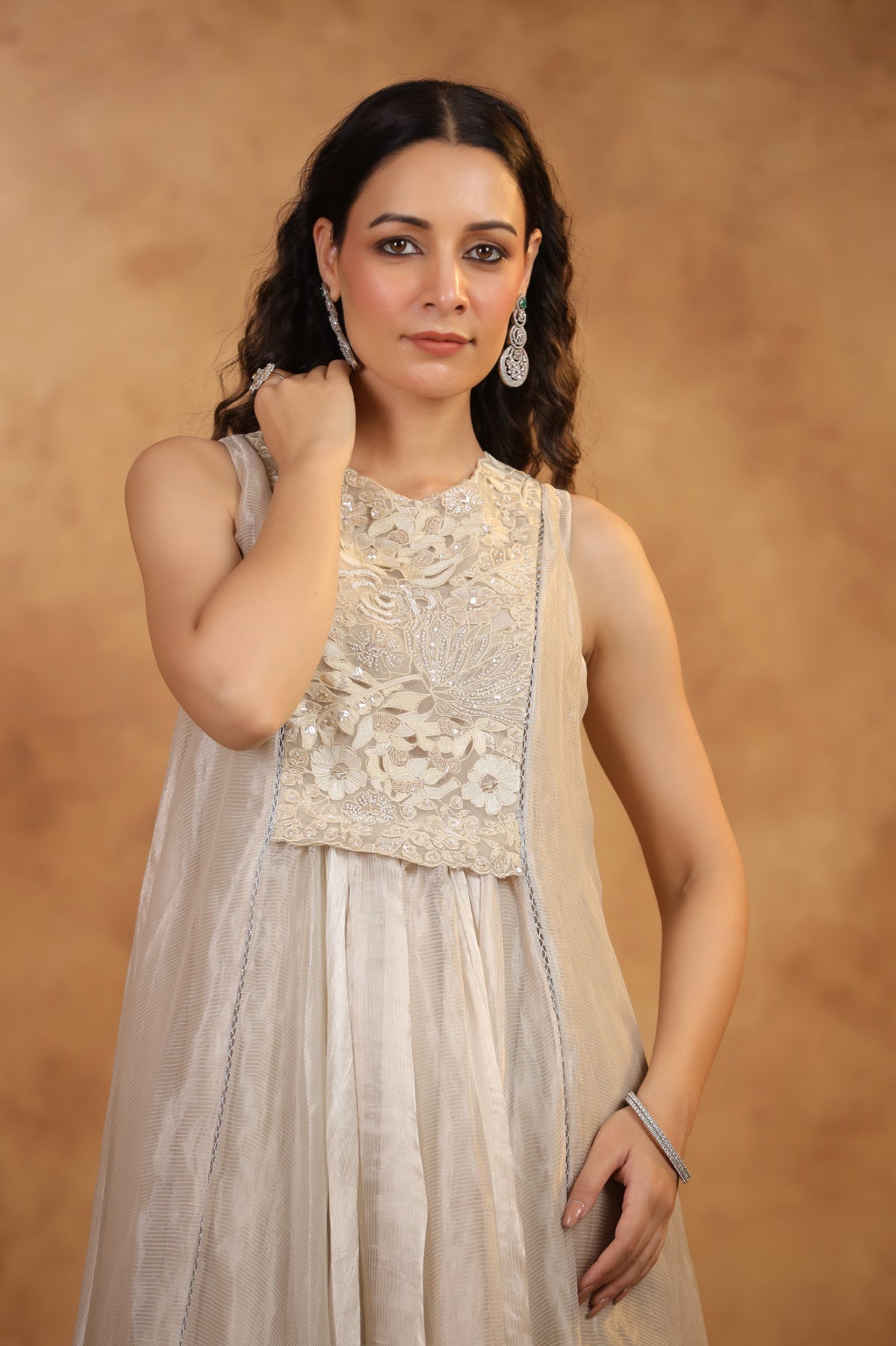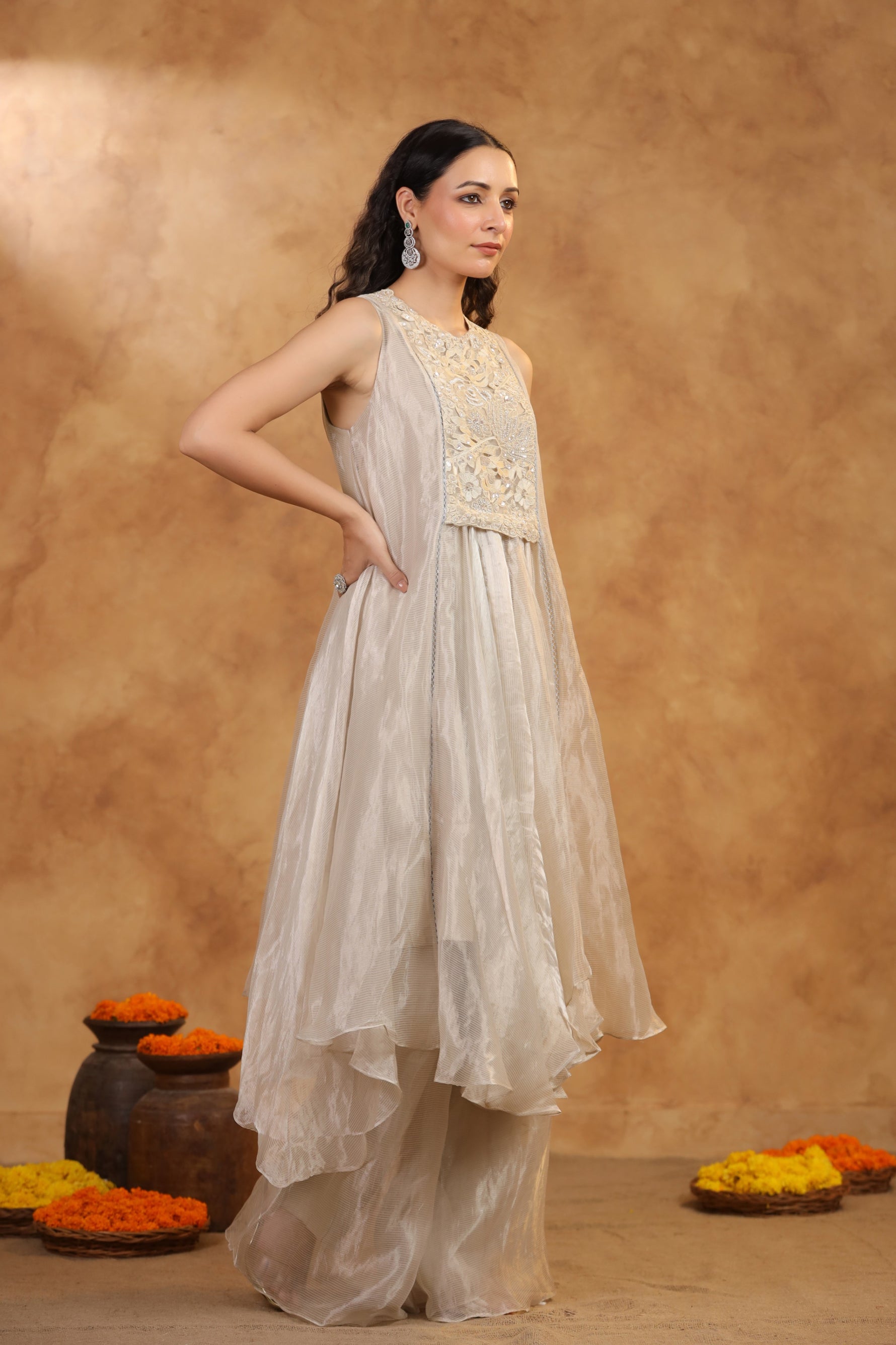 The Anarkali features a flared, layered design that enhances its dreamy movement while maintaining elegant structure. Paired with wide palazzo pants, the ensemble strikes a seamless balance between contemporary ease and traditional grace.