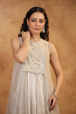 The Ivory Grace Anarkali Ensemble is a vision of understated luxury, crafted from a sumptuous silk-organza blend that creates a soft, ethereal flow with every step. The sleeveless bodice is beautifully adorned with delicate floral embroidery and subtle sequin detailing, adding a refined sparkle perfect for festive and evening celebrations.