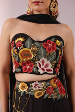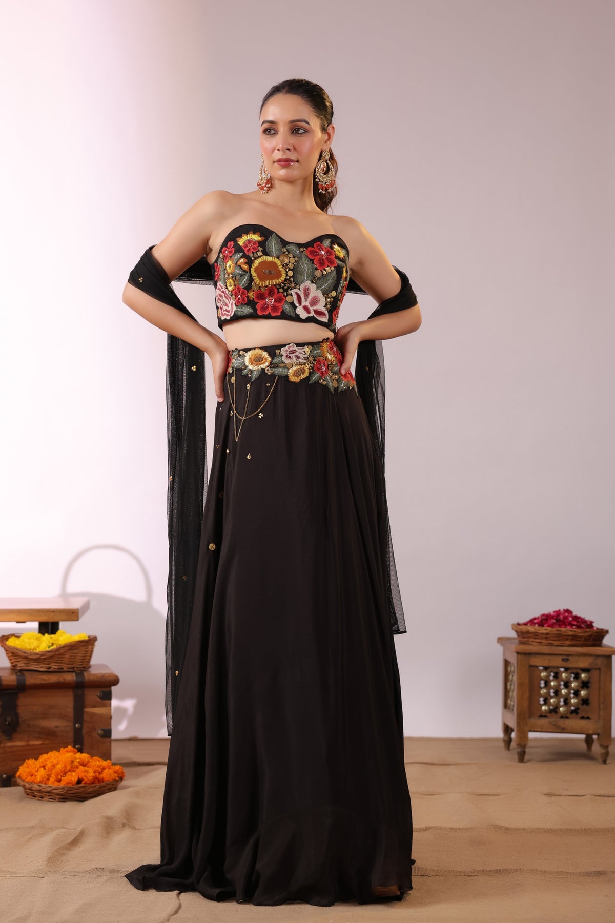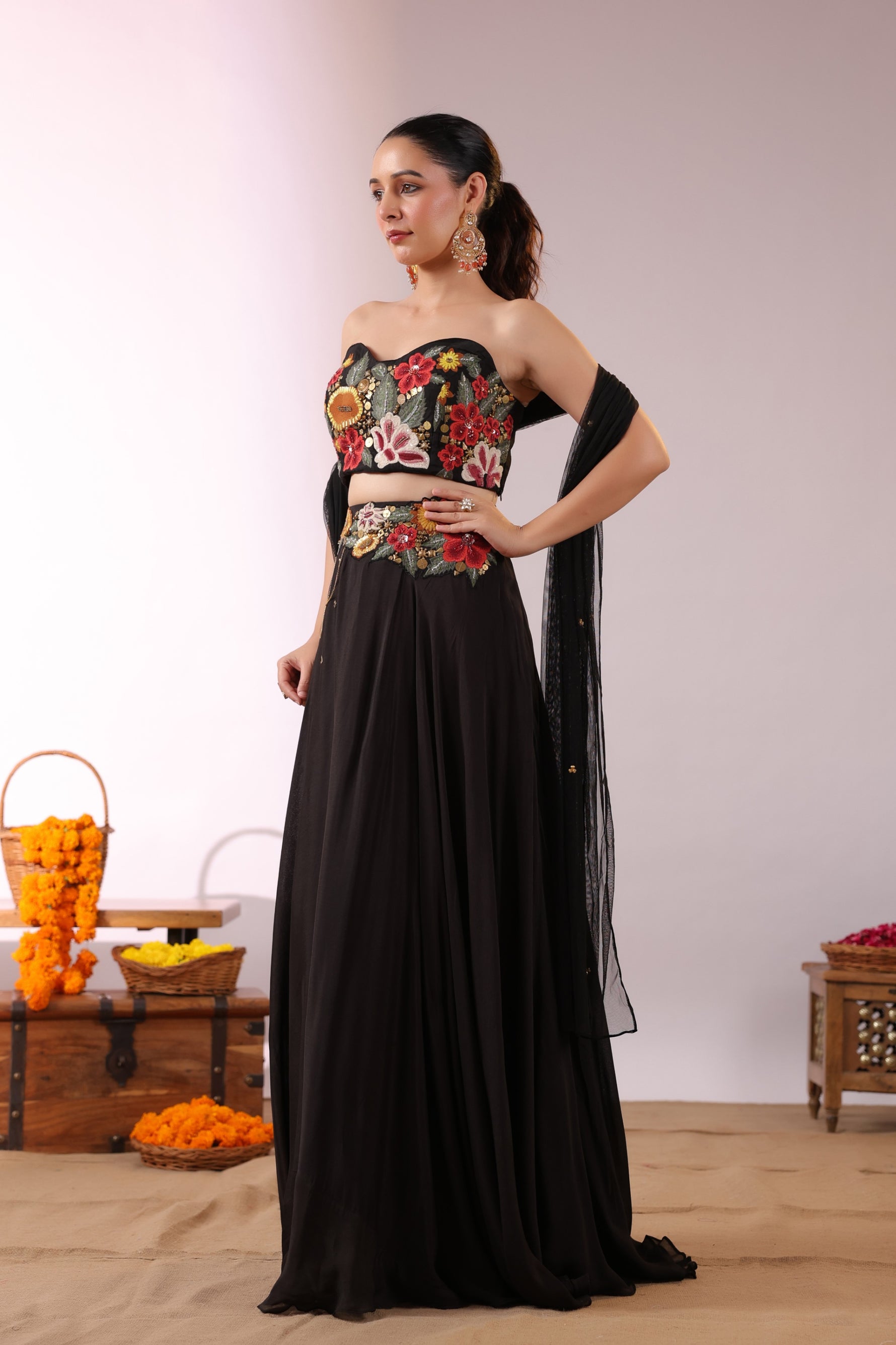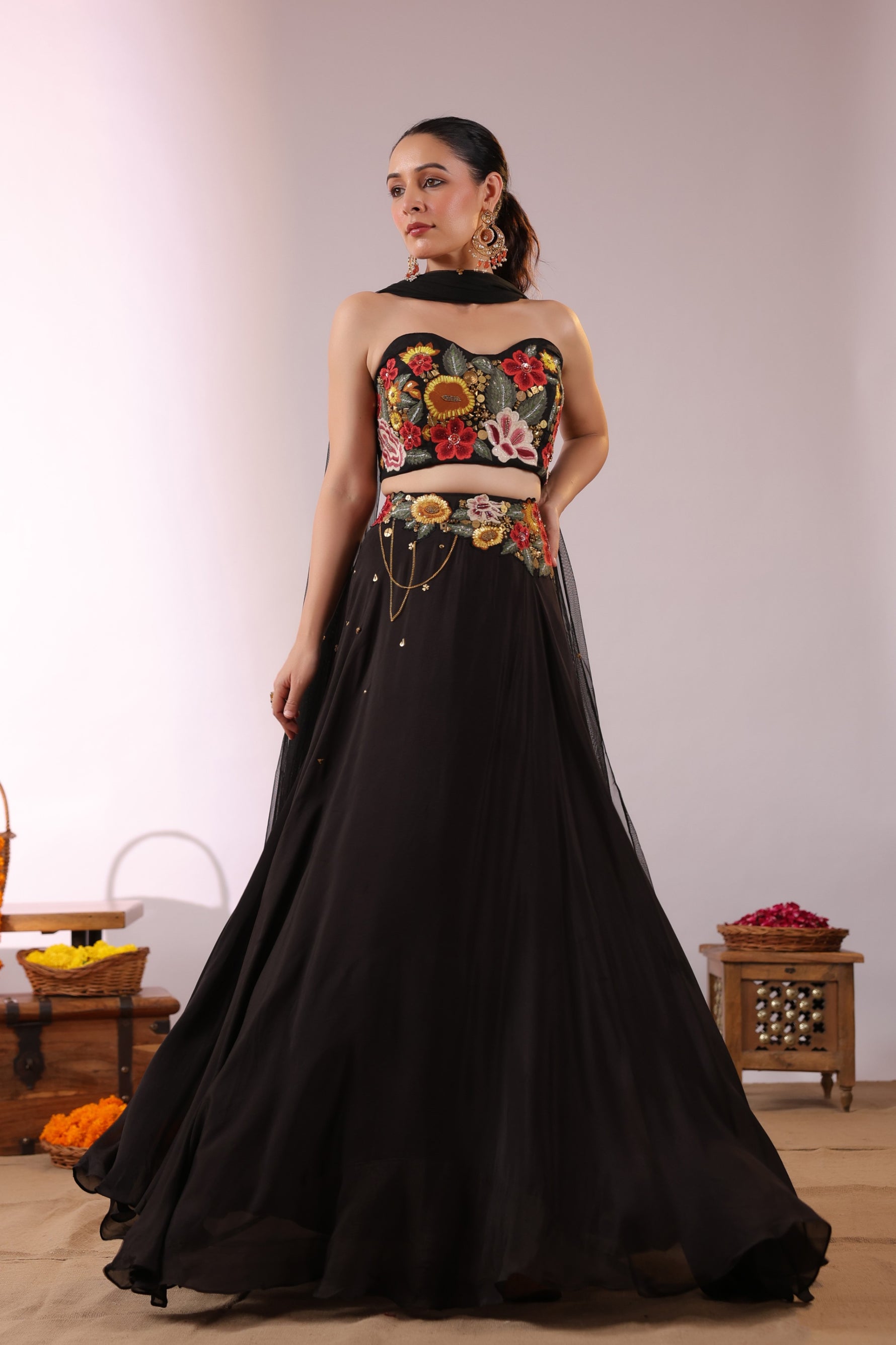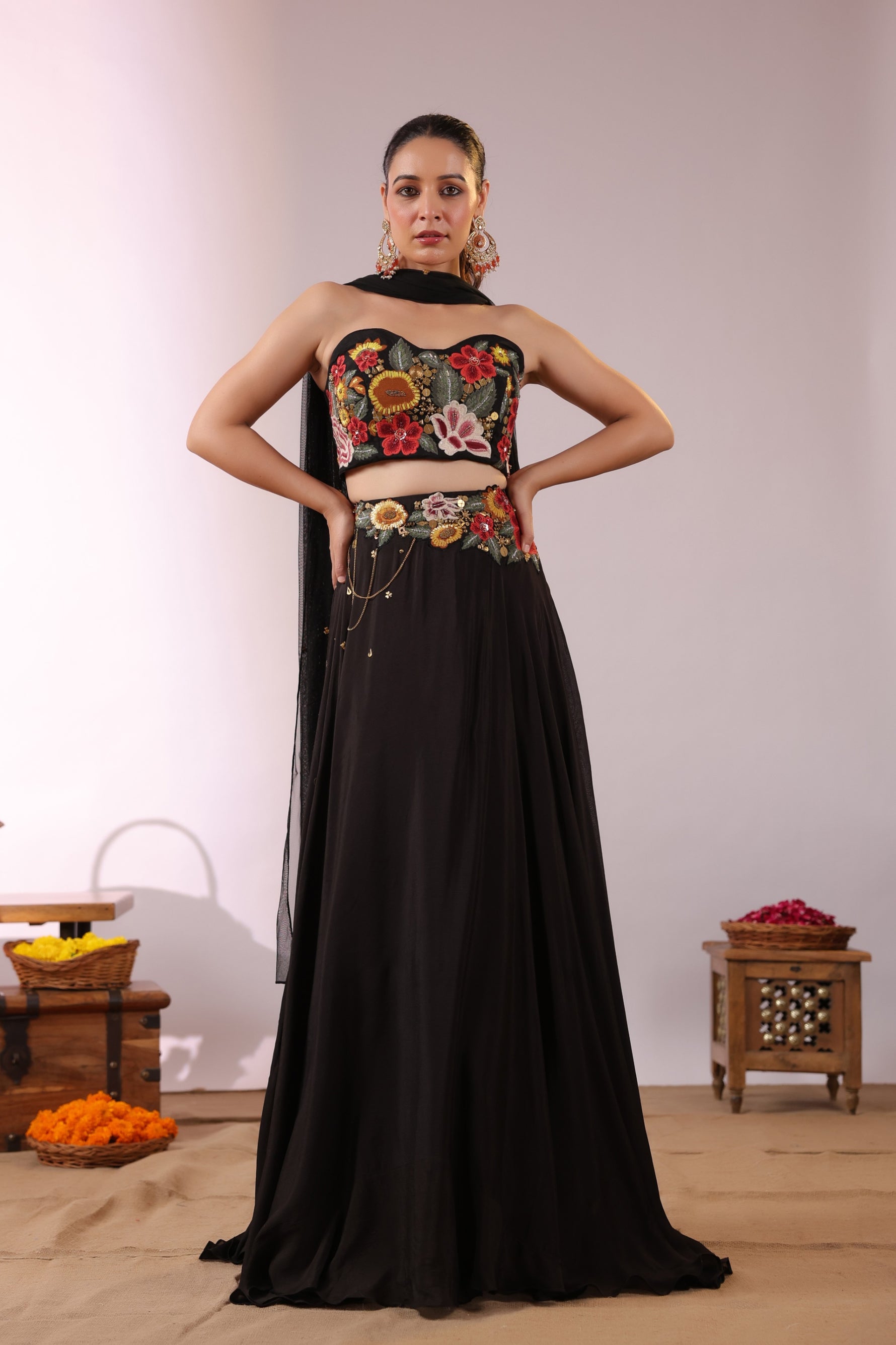 The Midnight Bloom Ensemble captures bold elegance with a touch of enchanting femininity. The strapless black crop top is brought to life with vivid 3D floral embroidery in striking shades of red, yellow, and green, creating a dramatic yet sophisticated statement.