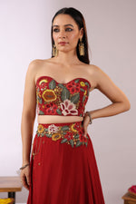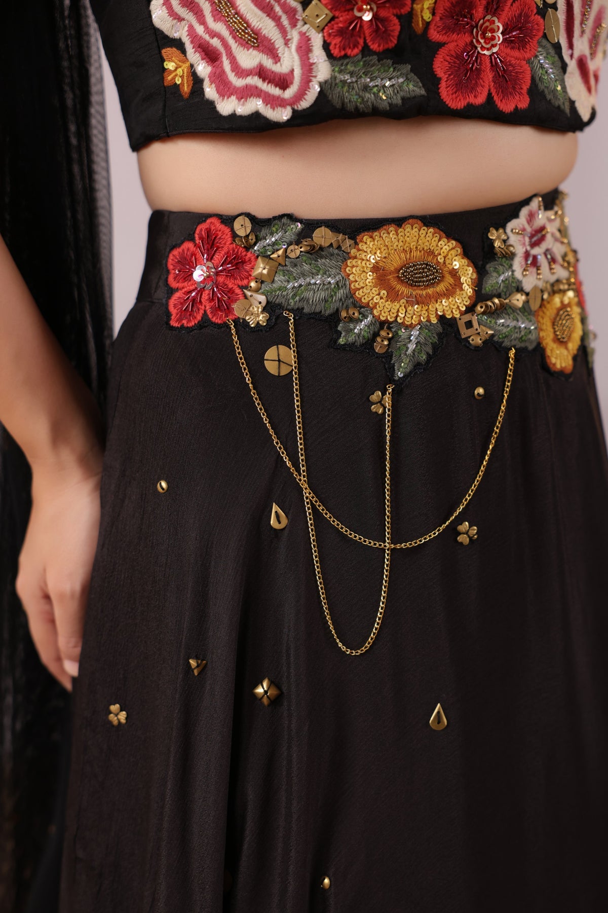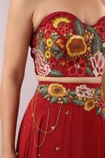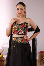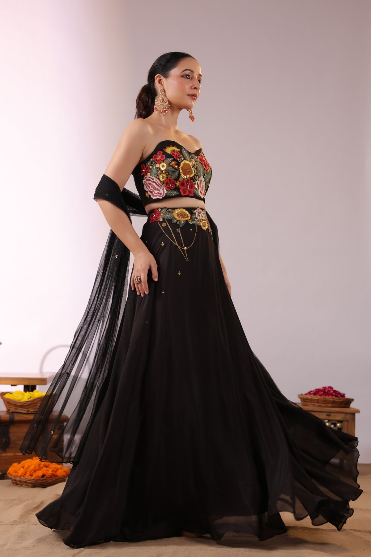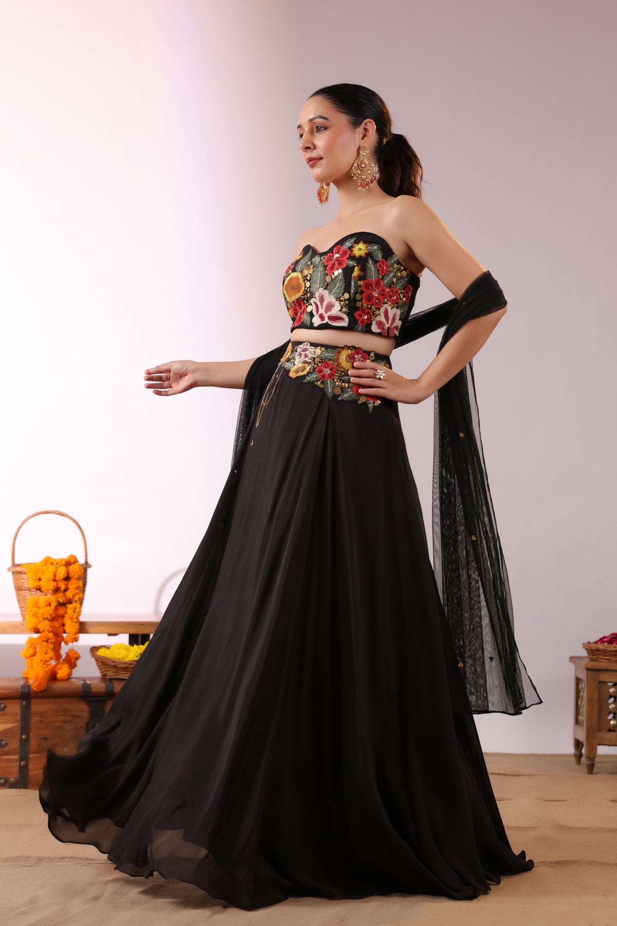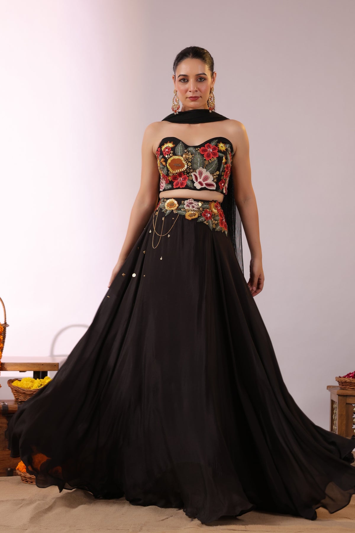 The Midnight Bloom Ensemble captures bold elegance with a touch of enchanting femininity. The strapless black crop top is brought to life with vivid 3D floral embroidery in striking shades of red, yellow, and green, creating a dramatic yet sophisticated statement.