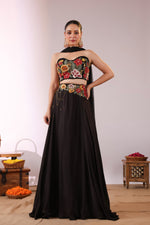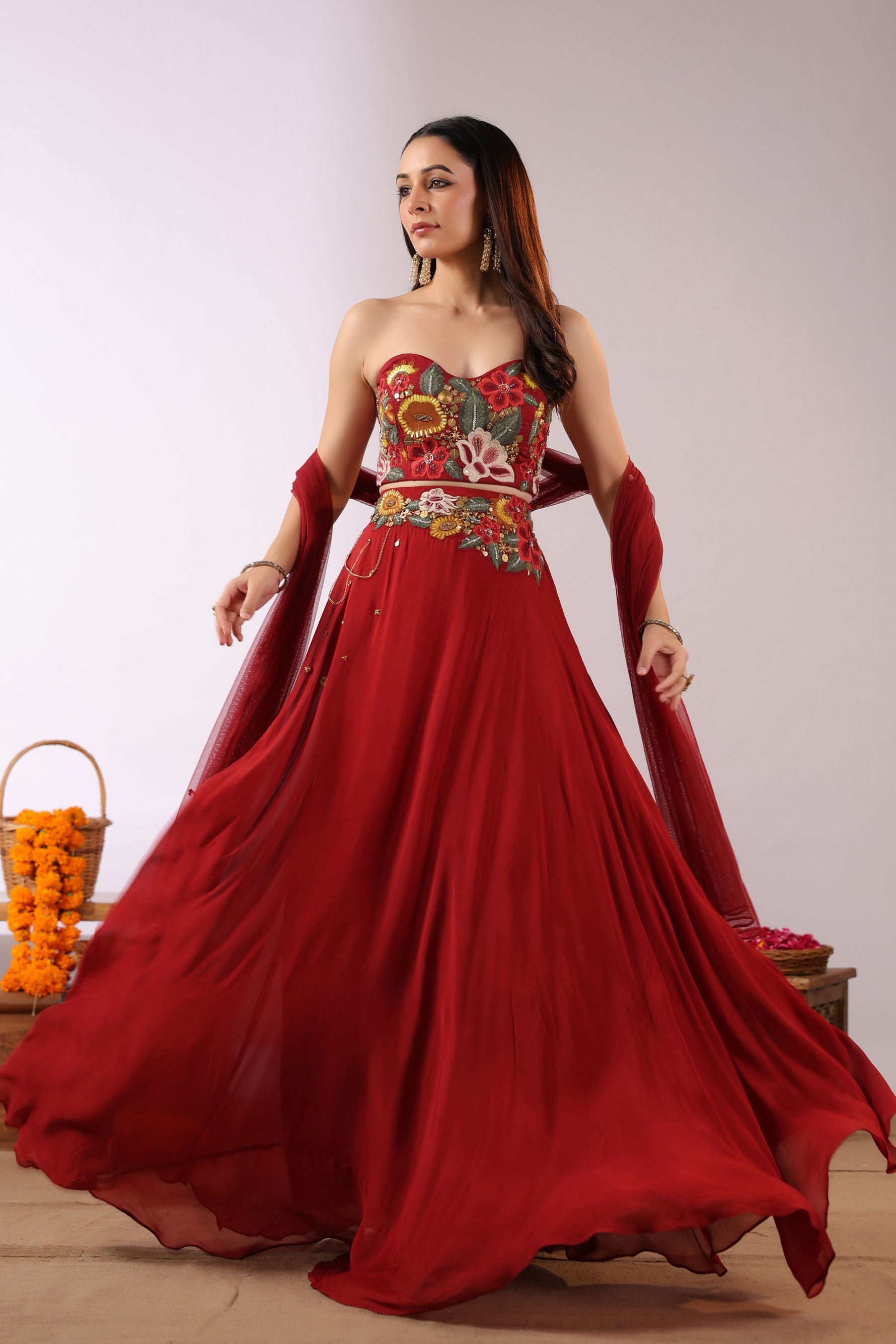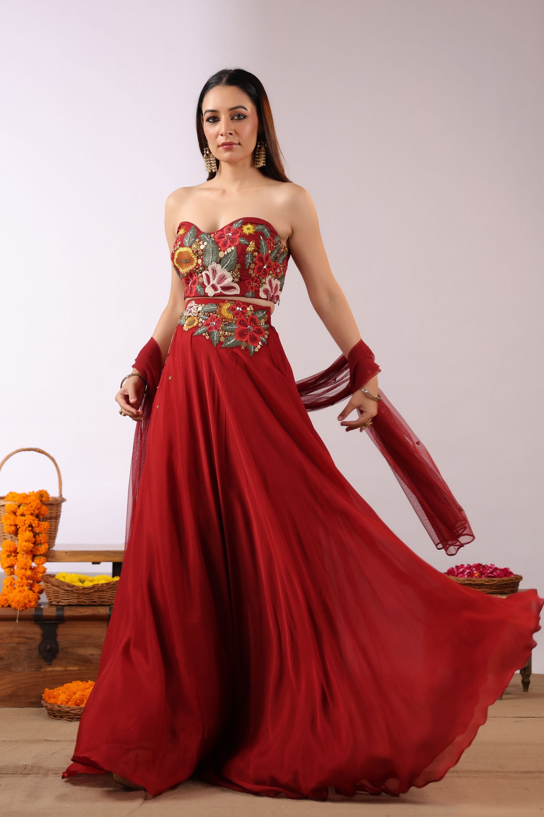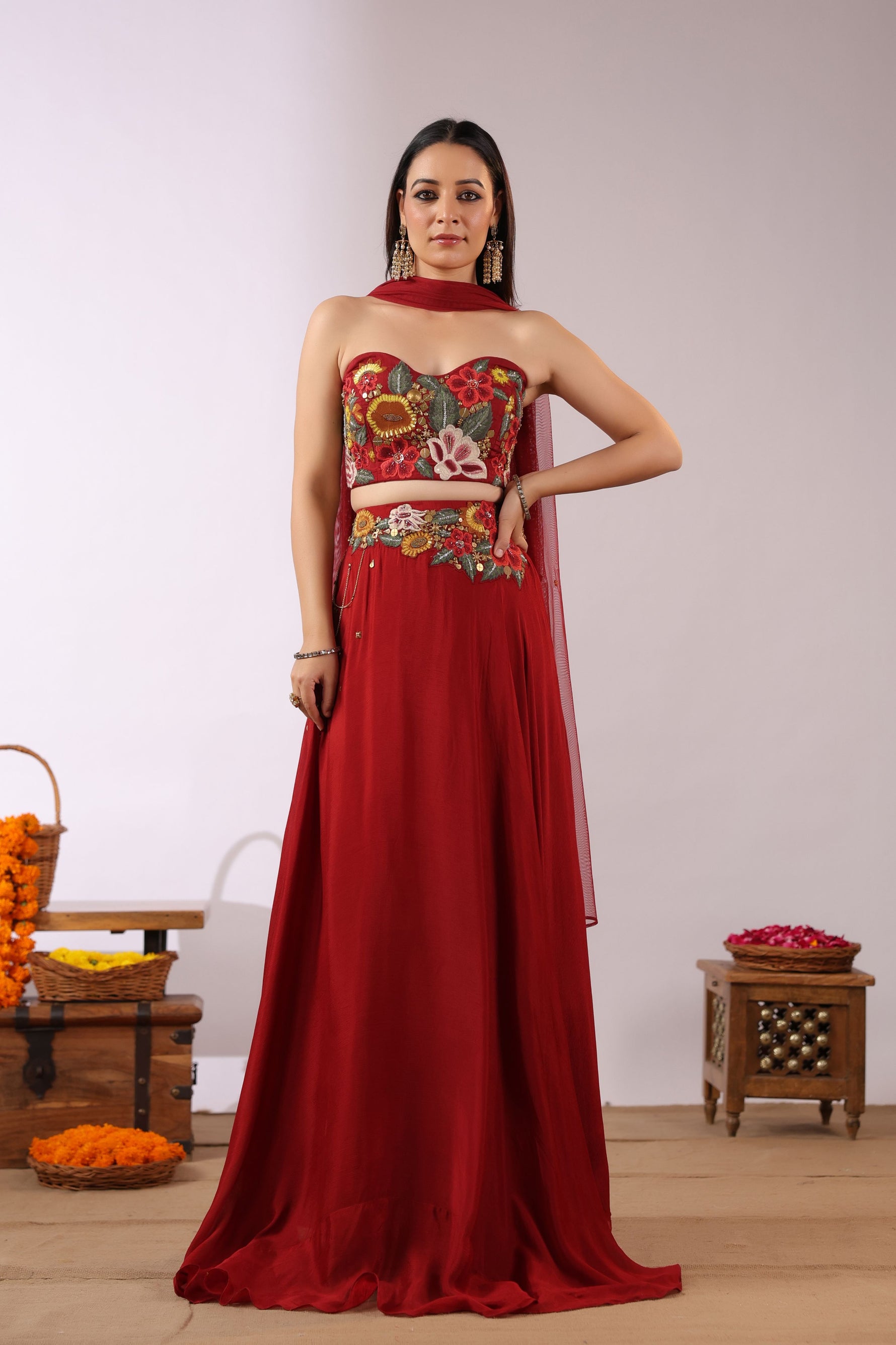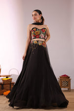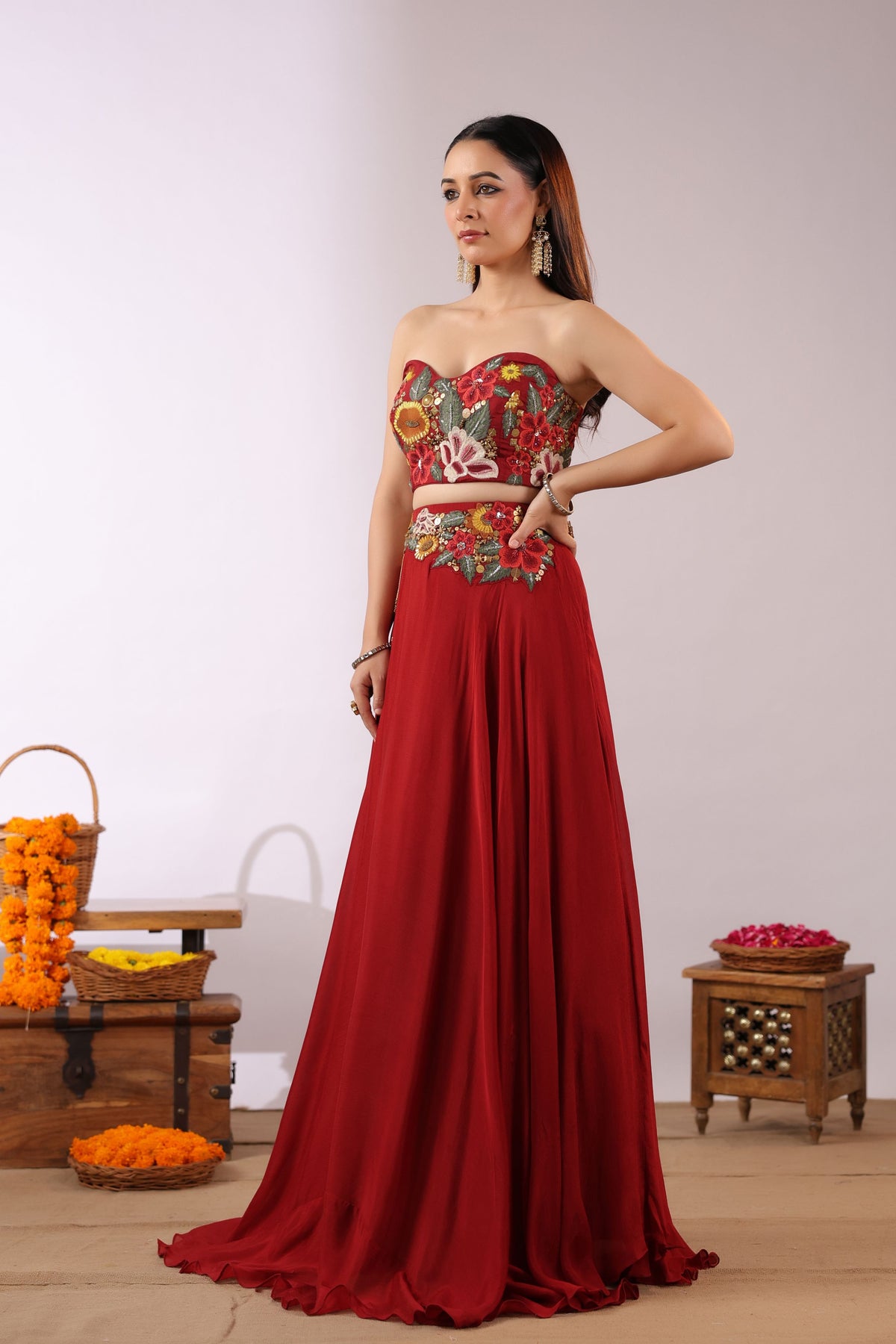 The Midnight Bloom Ensemble captures bold elegance with a touch of enchanting femininity. The strapless black crop top is brought to life with vivid 3D floral embroidery in striking shades of red, yellow, and green, creating a dramatic yet sophisticated statement.