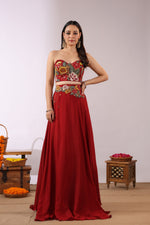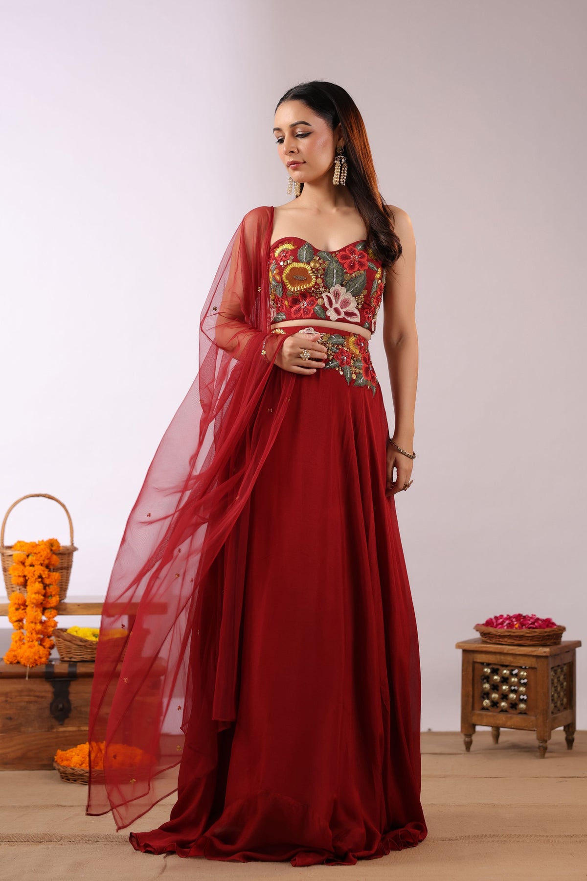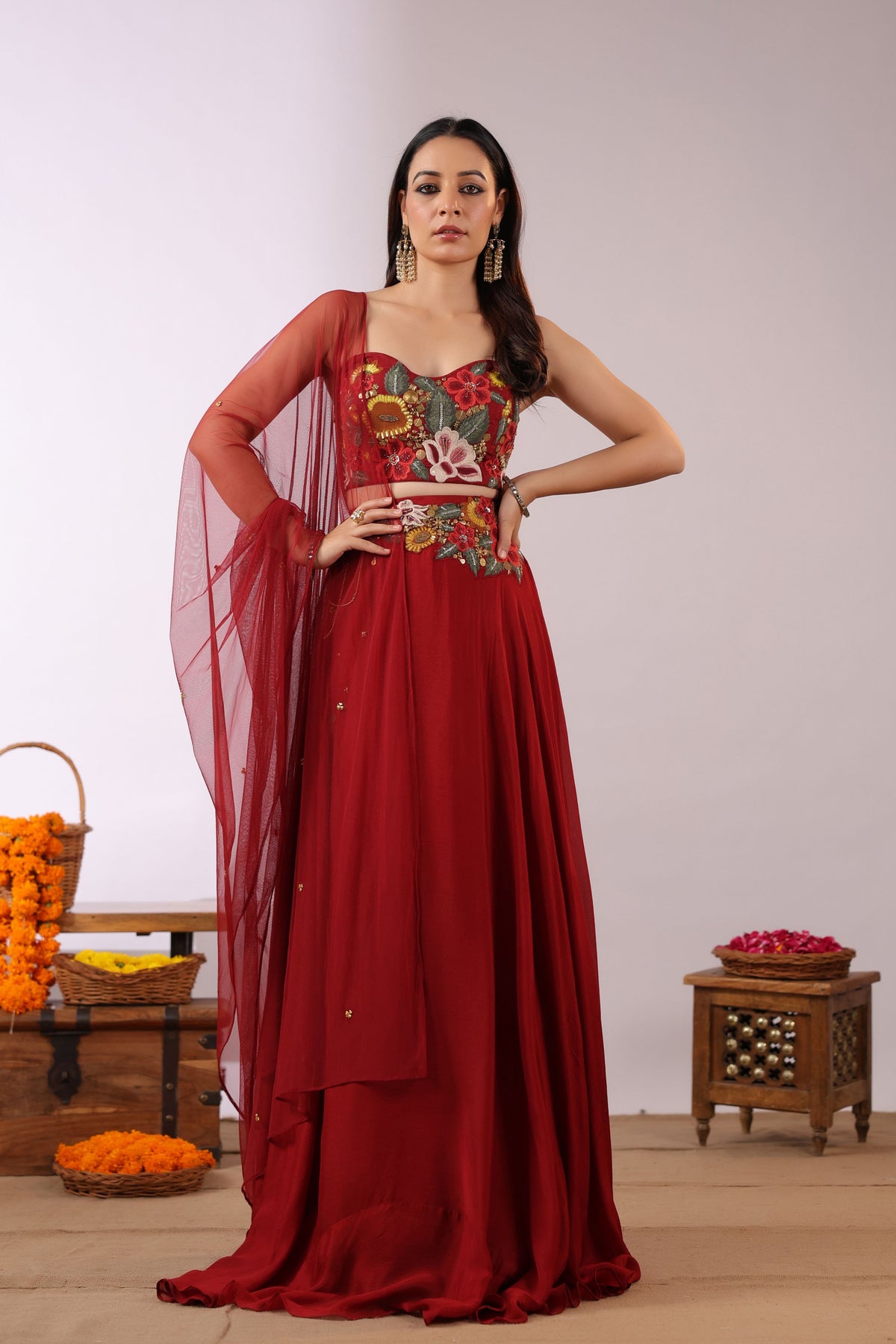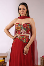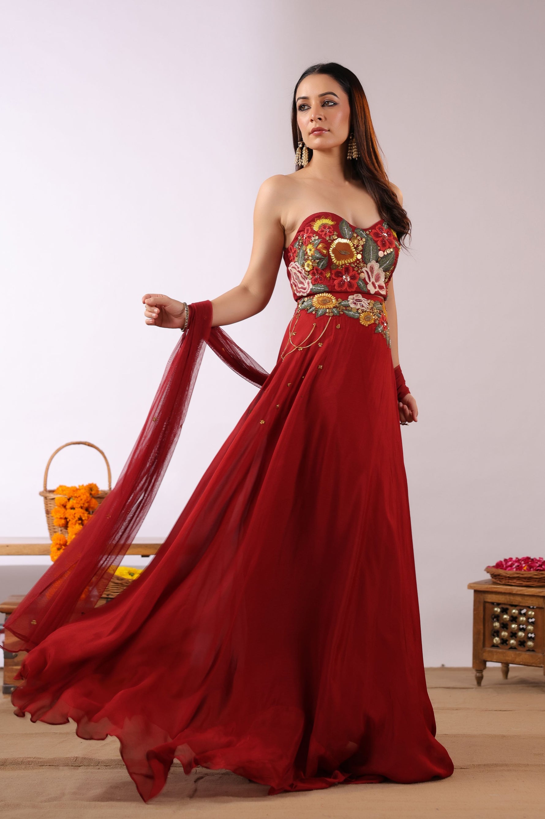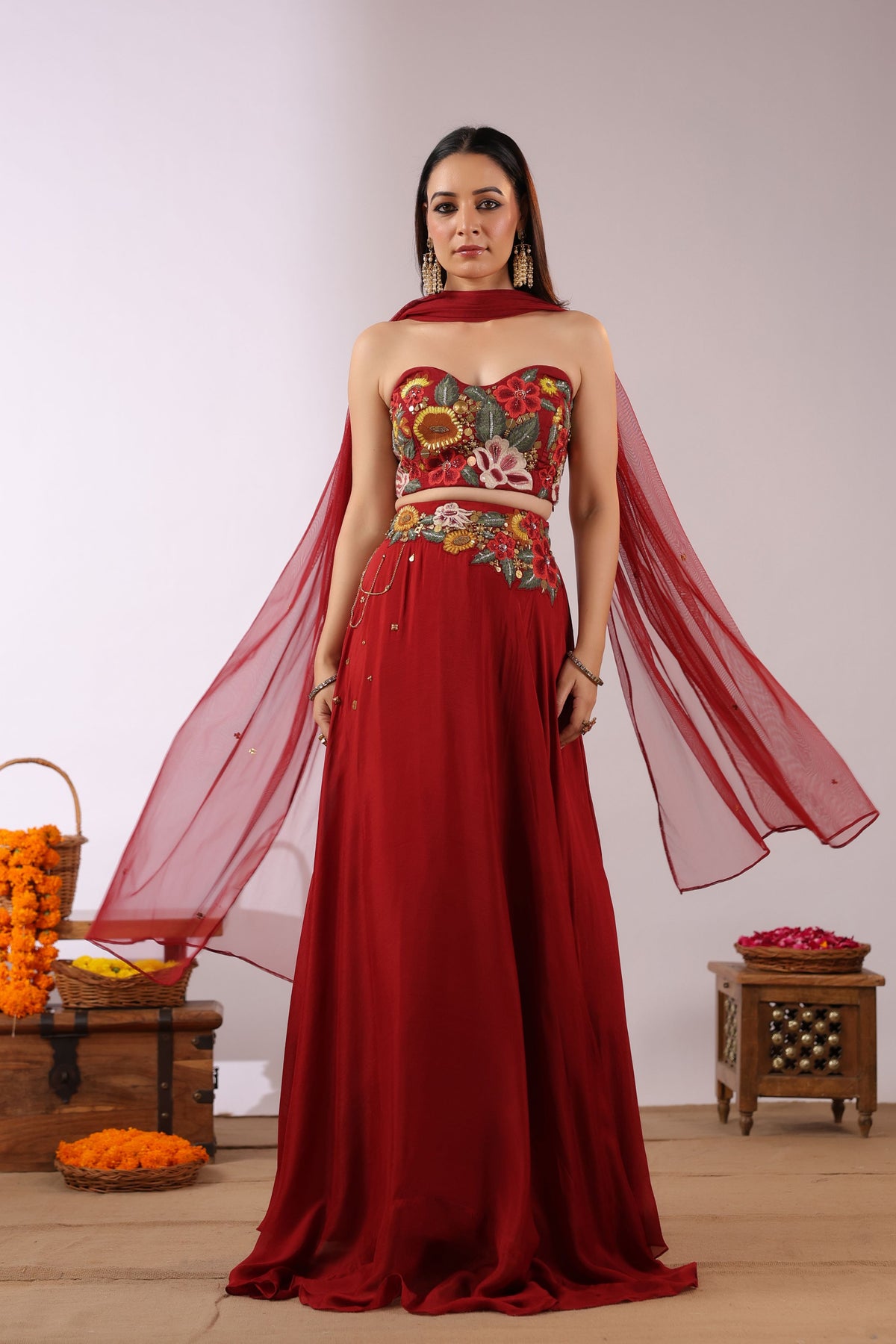 The Midnight Bloom Ensemble captures bold elegance with a touch of enchanting femininity. The strapless black crop top is brought to life with vivid 3D floral embroidery in striking shades of red, yellow, and green, creating a dramatic yet sophisticated statement.