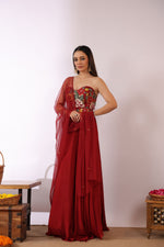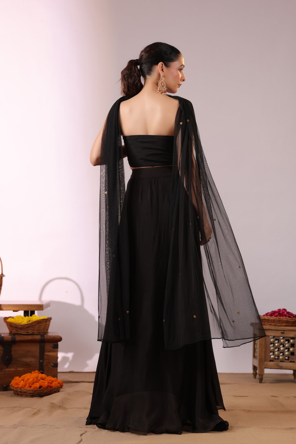 A soft black dupatta completes the look, offering balance and grace. Perfect for cocktail nights, festive soirées, or wedding receptions, this outfit blends contemporary glamour with artisanal craftsmanship effortlessly.