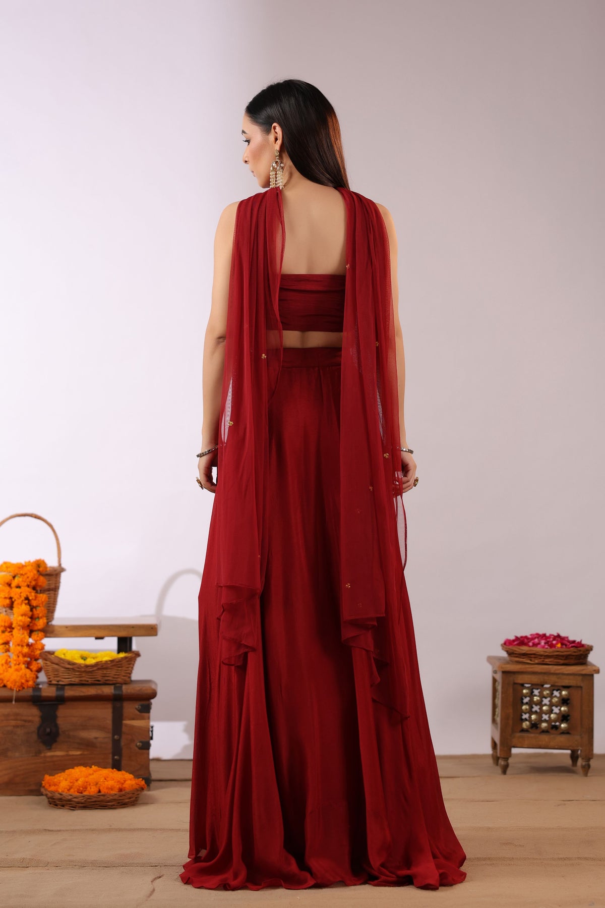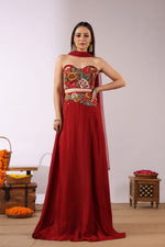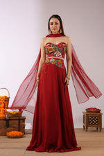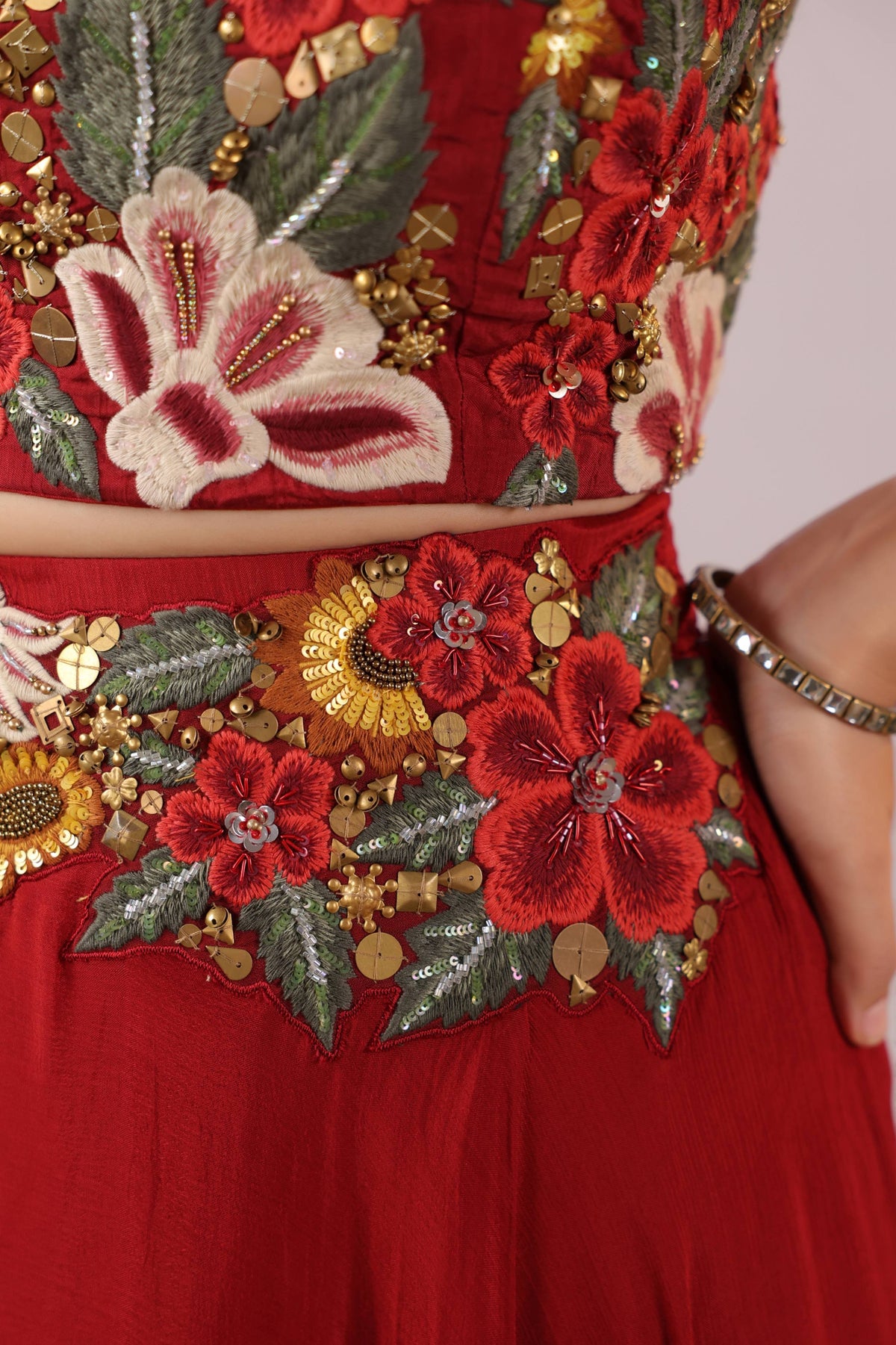 The high-waisted flared skirt mirrors the same vibrant motifs, embellished with delicate detailing that enhances movement and artistry. Crafted from a soft, flowy fabric, the ensemble glides beautifully with every step. Subtle sheer detailing around the waist introduces a sensuous, modern edge without compromising refinement.