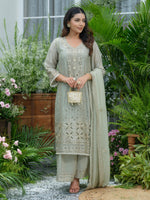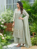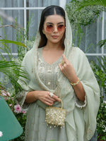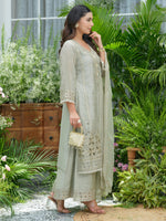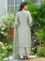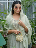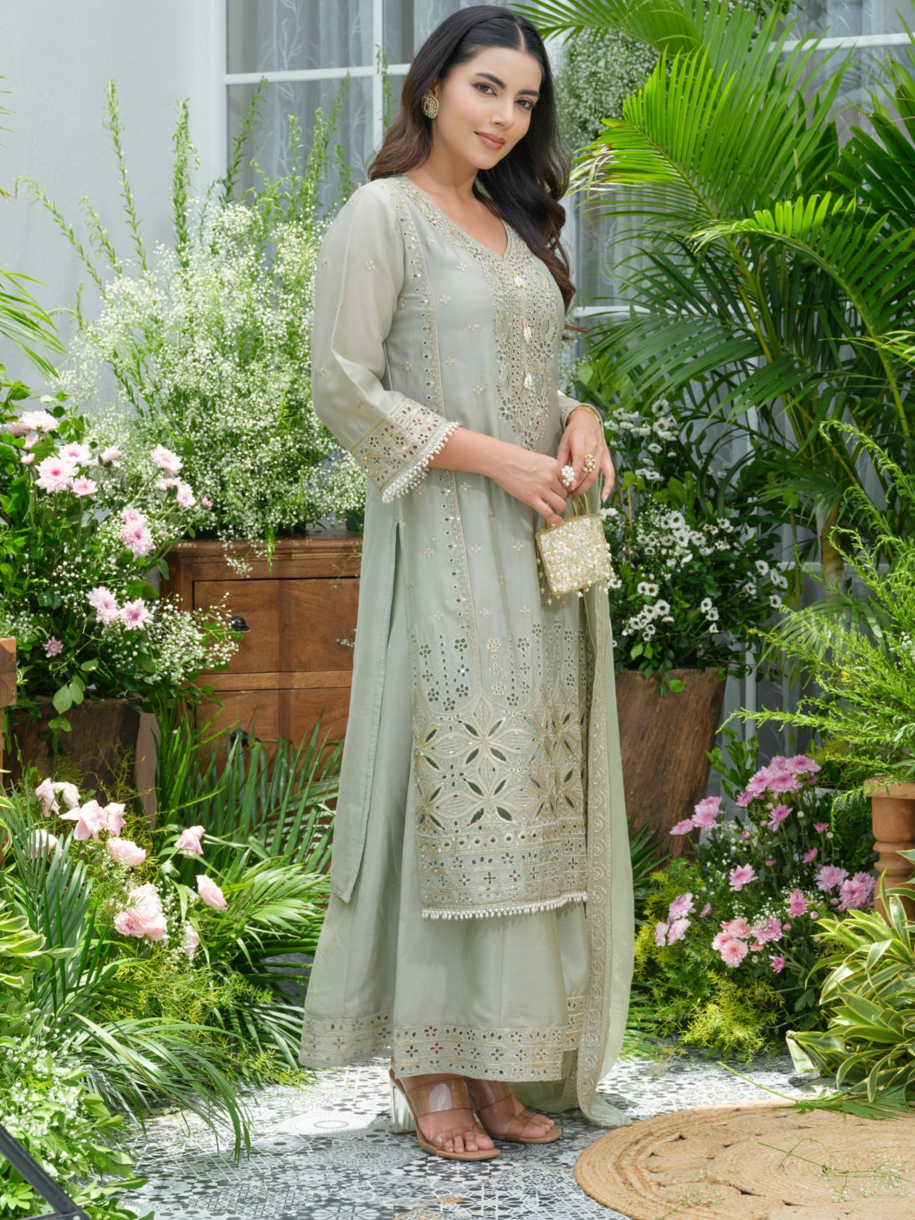 The Sage Bloom Mirror Work Ensemble is a breathtaking ode to serene elegance, crafted in a soothing sage green shade that instantly radiates calm sophistication. The kurta is adorned with intricate mirror and thread embroidery, creating a soft festive shimmer that feels both delicate and luxurious.