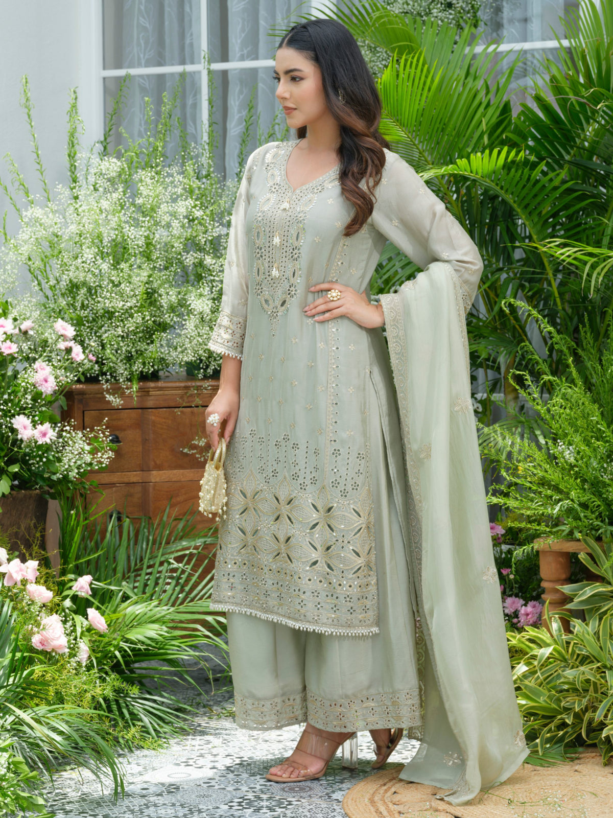 The coordinated dupatta, finished with embroidered borders, completes the ensemble with an ethereal charm that flows gracefully with every step. Lightweight, airy, and visually captivating, this three-piece set is perfect for day weddings, festive gatherings, and elegant soirées where understated luxury speaks volumes.