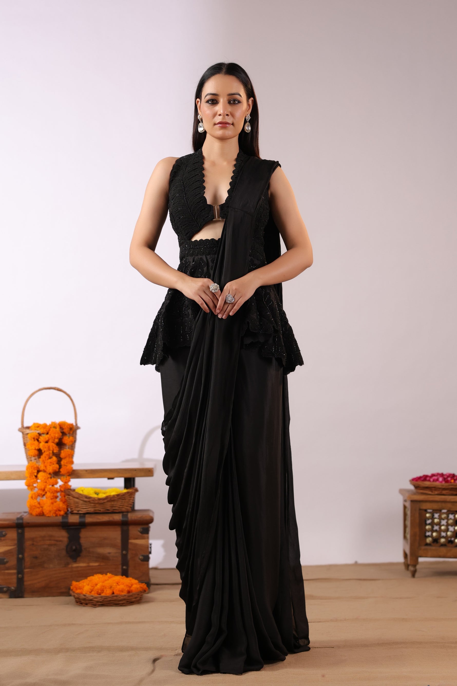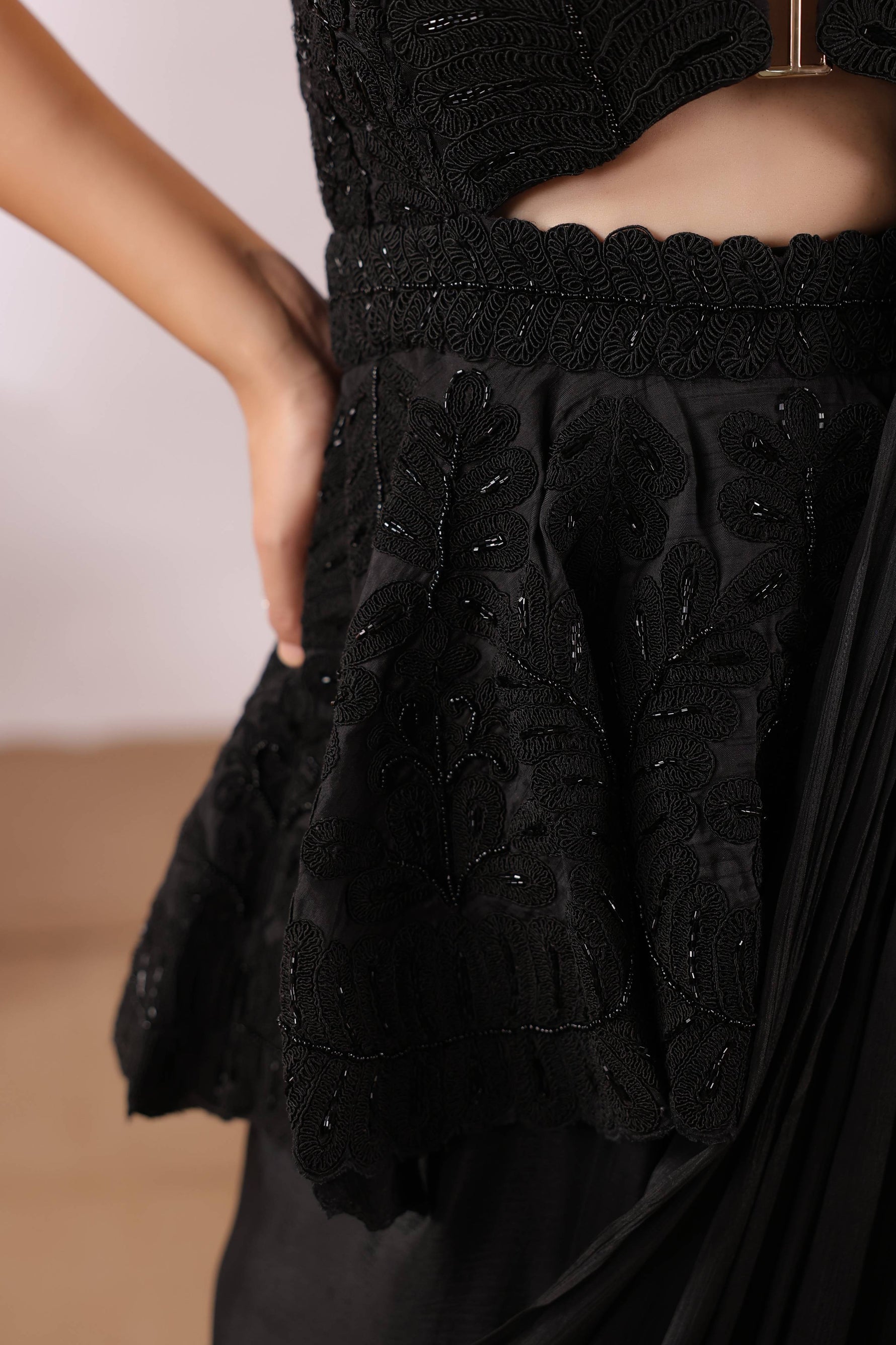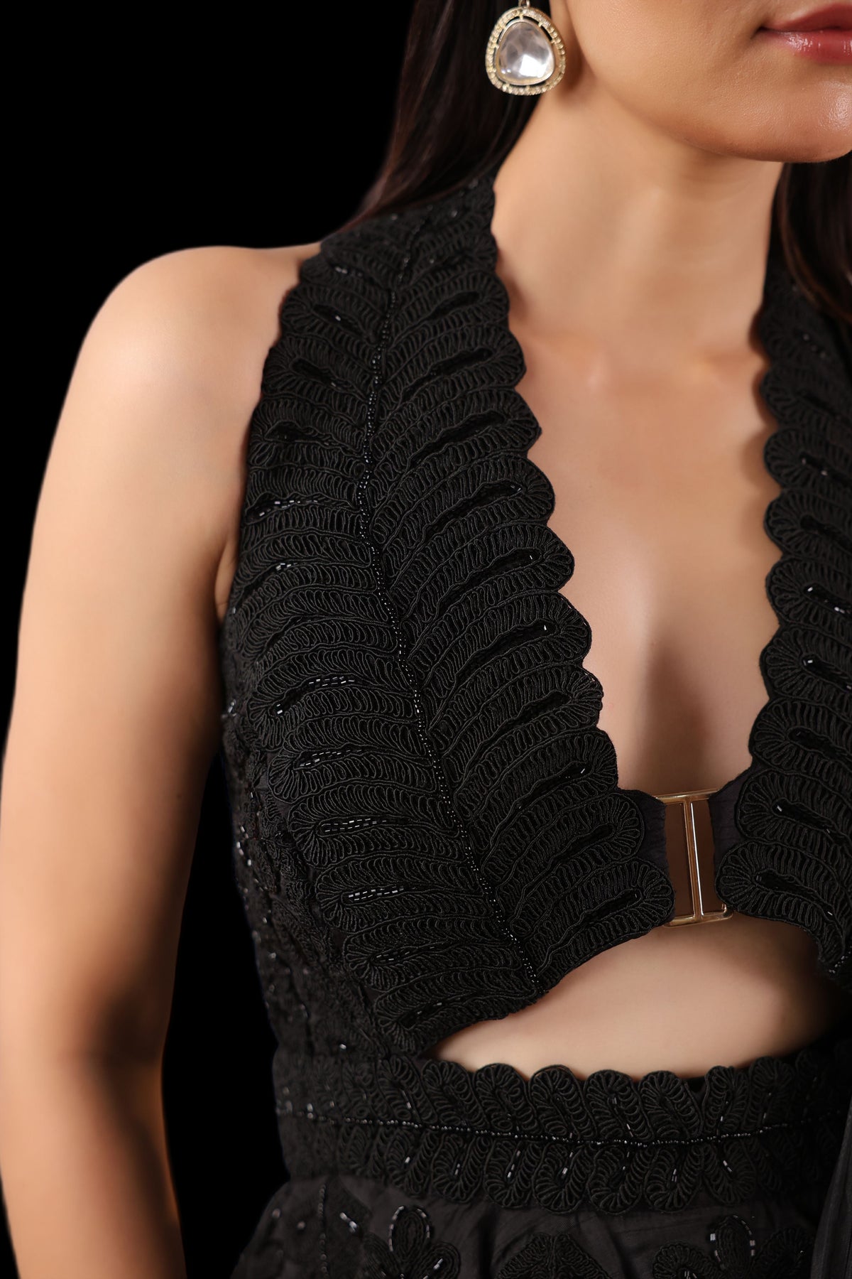 Serve unapologetic glamour with this all-black statement set, crafted for women who walk into a room and instantly own it. The intricately handcrafted halter blouse features scalloped edges, tonal bead embroidery, and a bold cut-out waist that adds modern drama while still keeping things tastefully refined. A structured front clasp closure completes the silhouette with sleek precision.