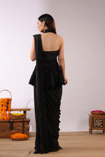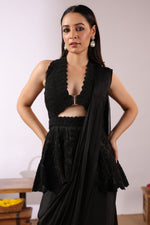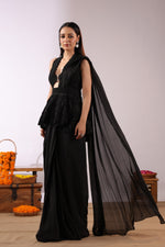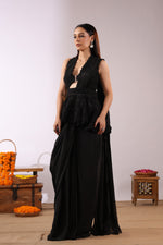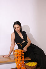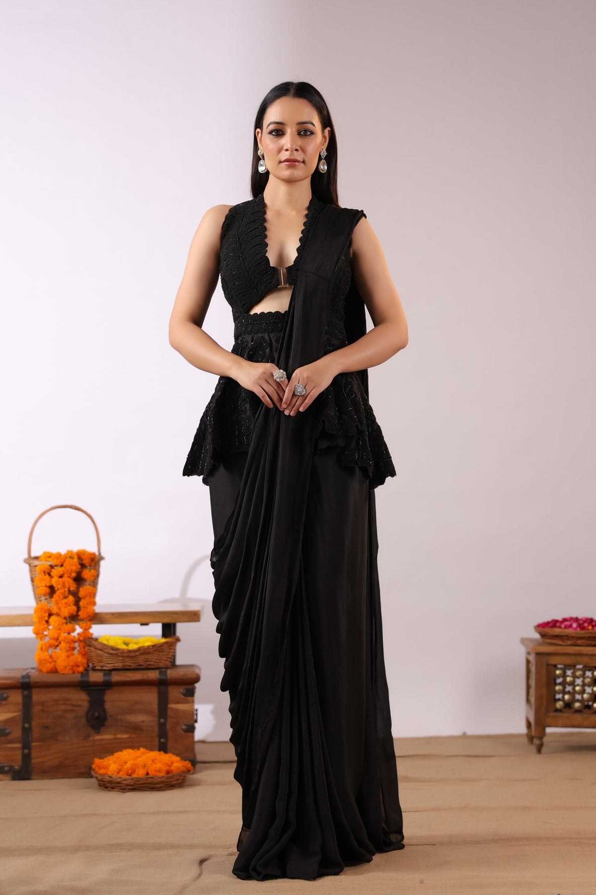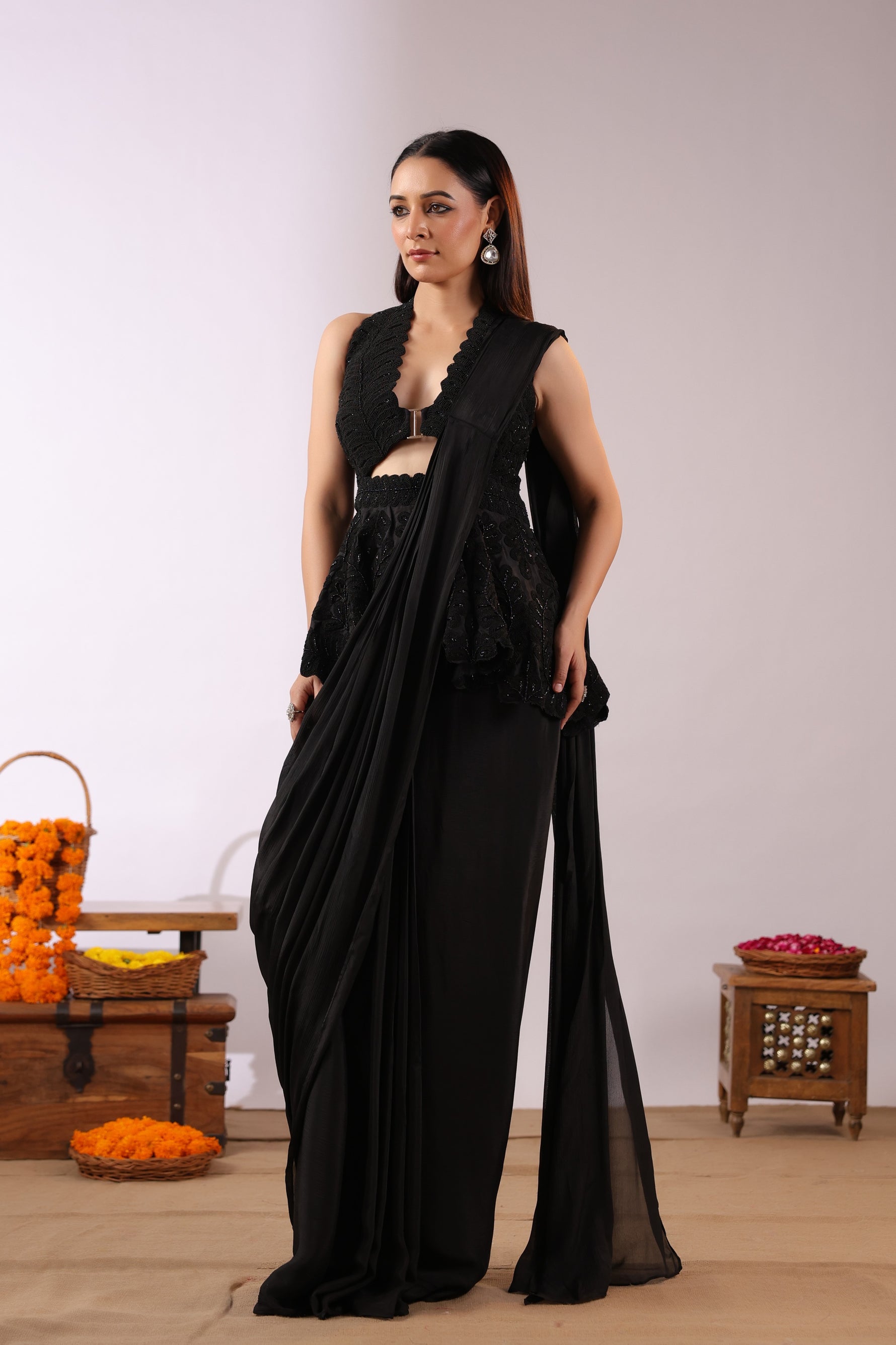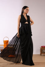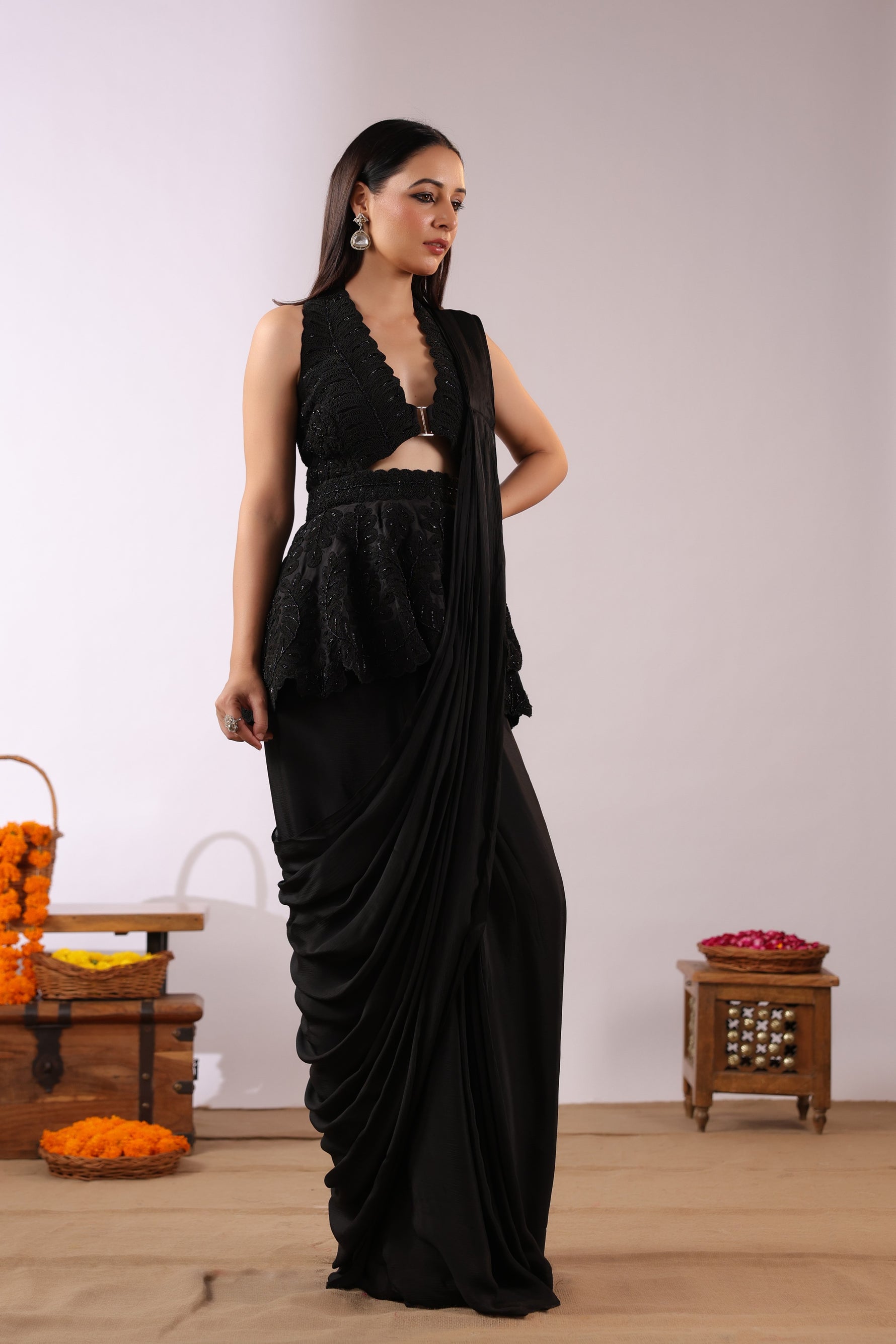 Serve unapologetic glamour with this all-black statement set, crafted for women who walk into a room and instantly own it. The intricately handcrafted halter blouse features scalloped edges, tonal bead embroidery, and a bold cut-out waist that adds modern drama while still keeping things tastefully refined. A structured front clasp closure completes the silhouette with sleek precision.