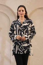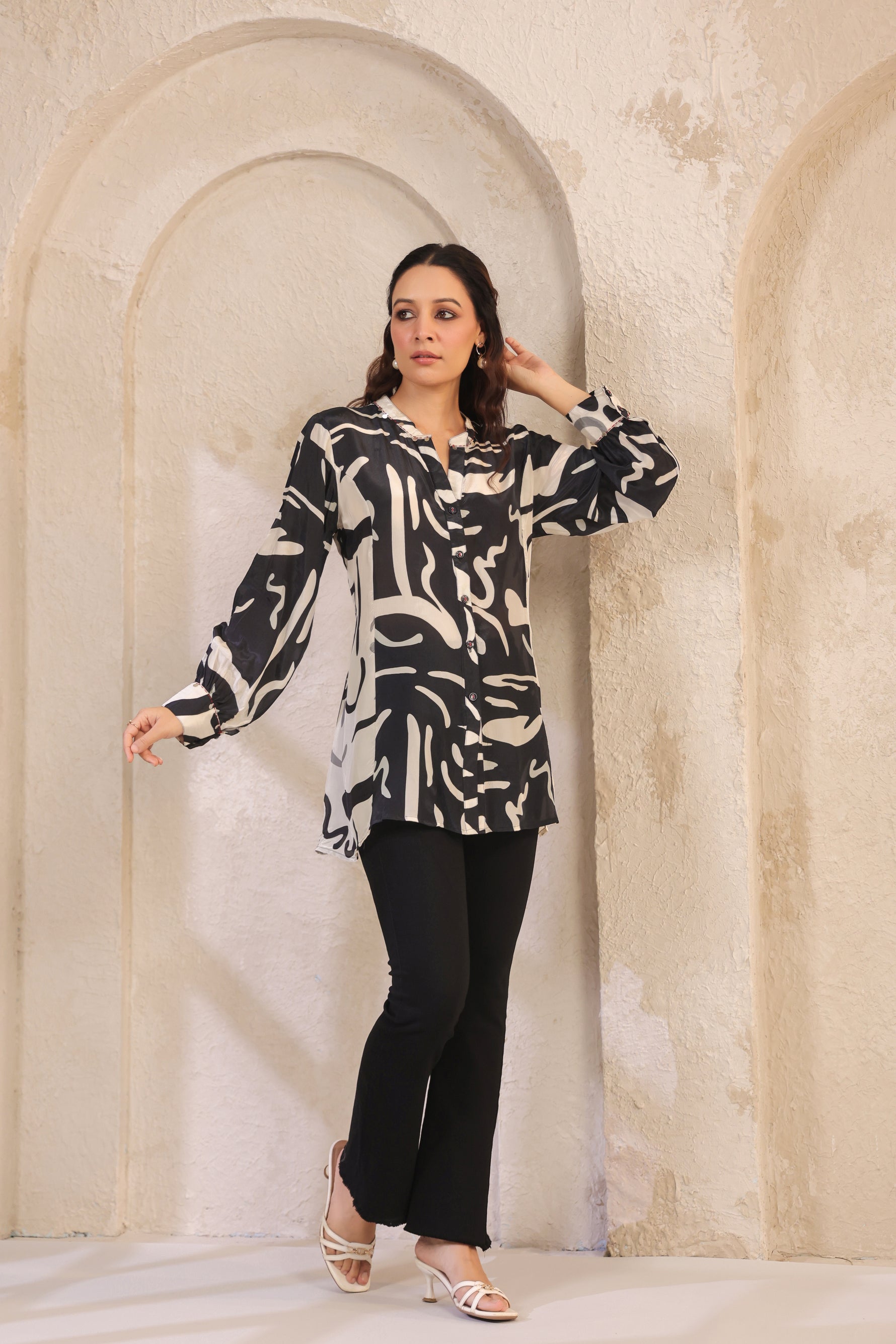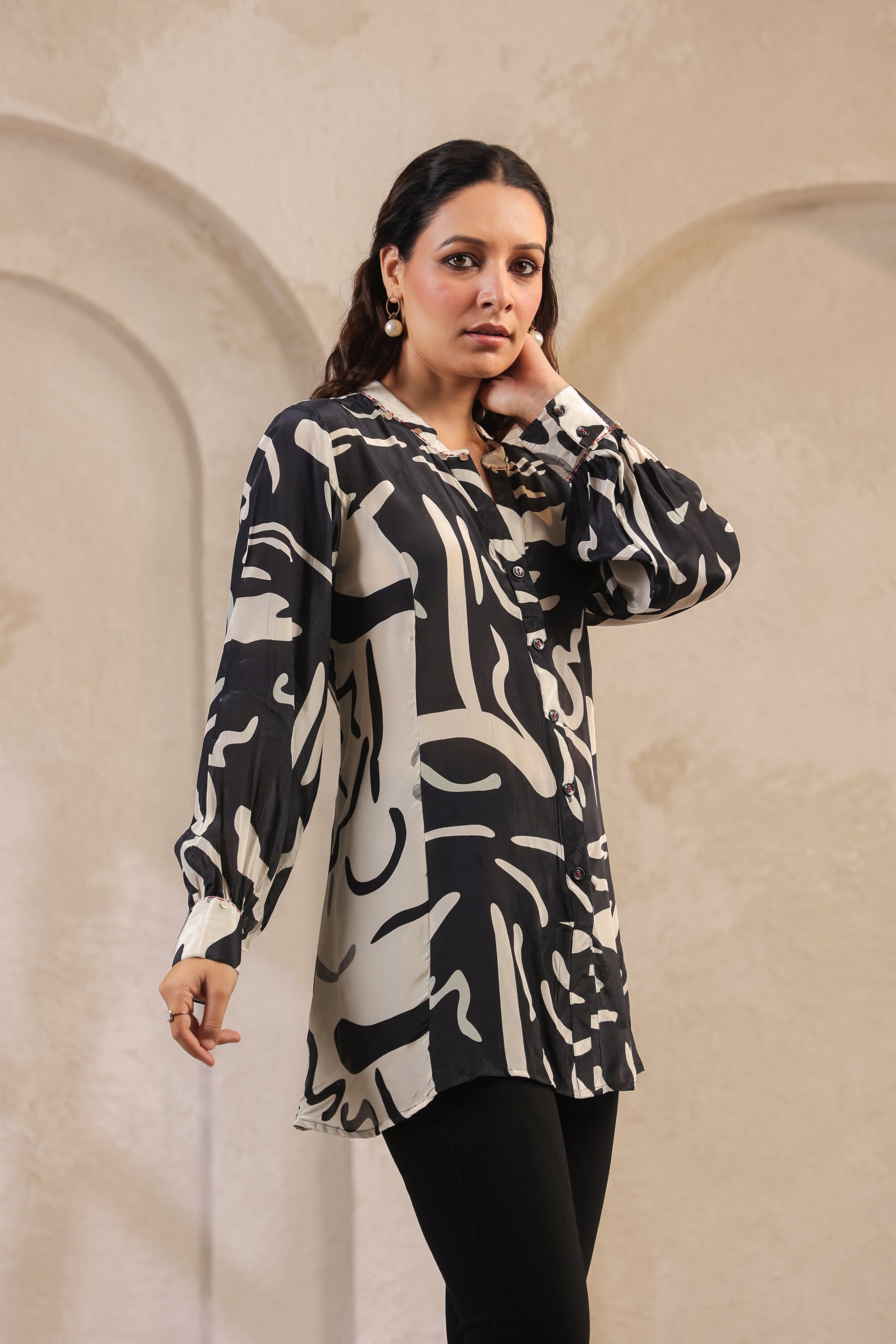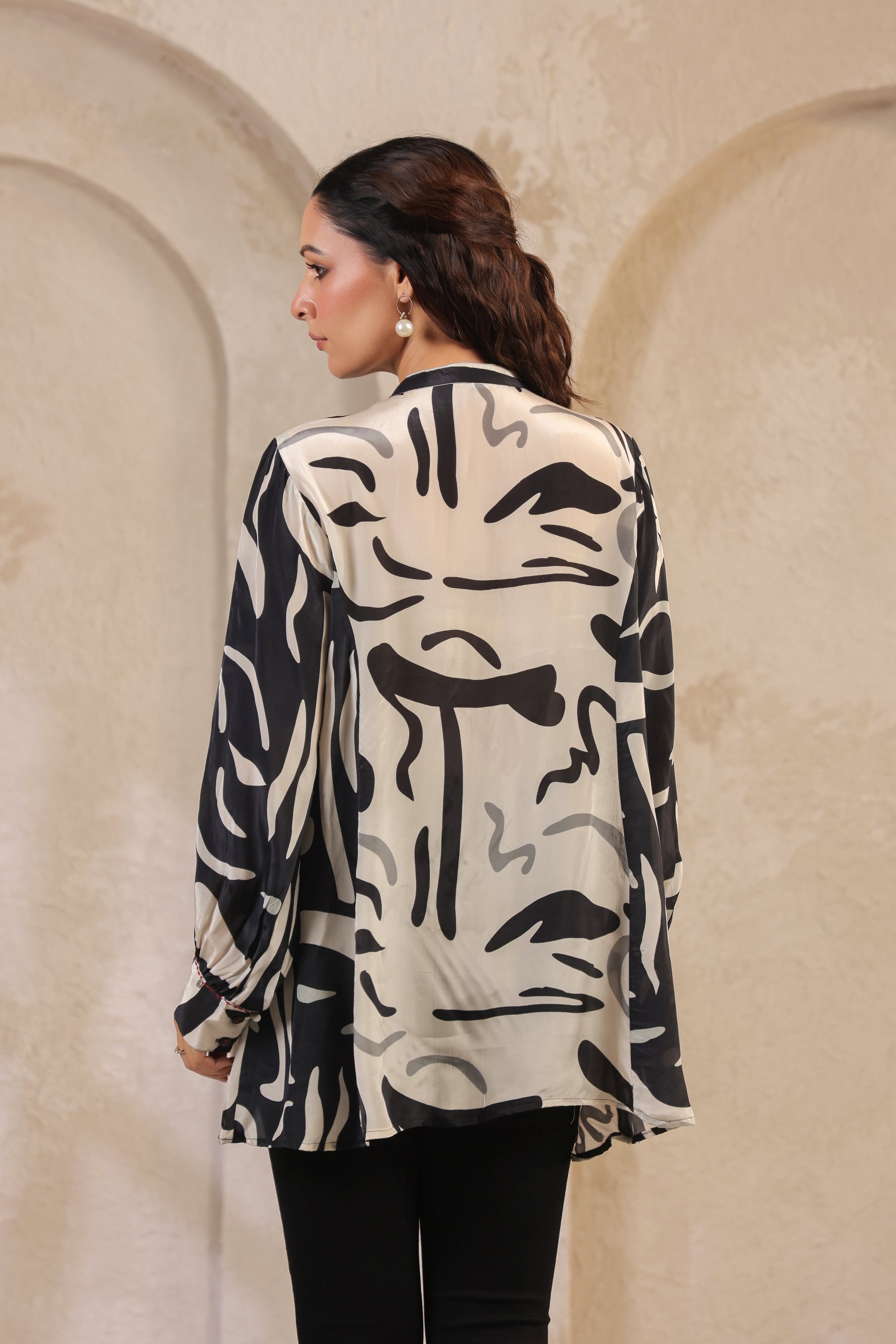 Lightweight, breathable, and super flattering thanks to its relaxed-fit silhouette, this piece moves seamlessly from boardroom formals to chic casual outings. A true statement top for anyone who loves modern artistry wrapped in classic elegance.