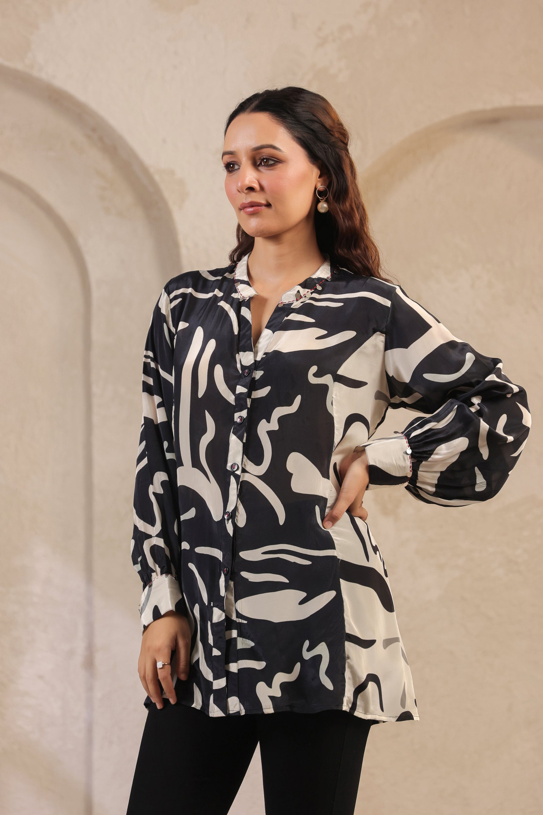 Make an entrance without saying a word — this satin top is all about bold sophistication. The striking abstract swirl pattern in contrasting black and ivory gives it an artistic, high-impact look while still feeling timeless. Crafted from luxe satin, it falls with a smooth, fluid drape that feels as elegant as it looks.