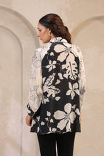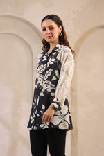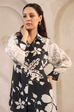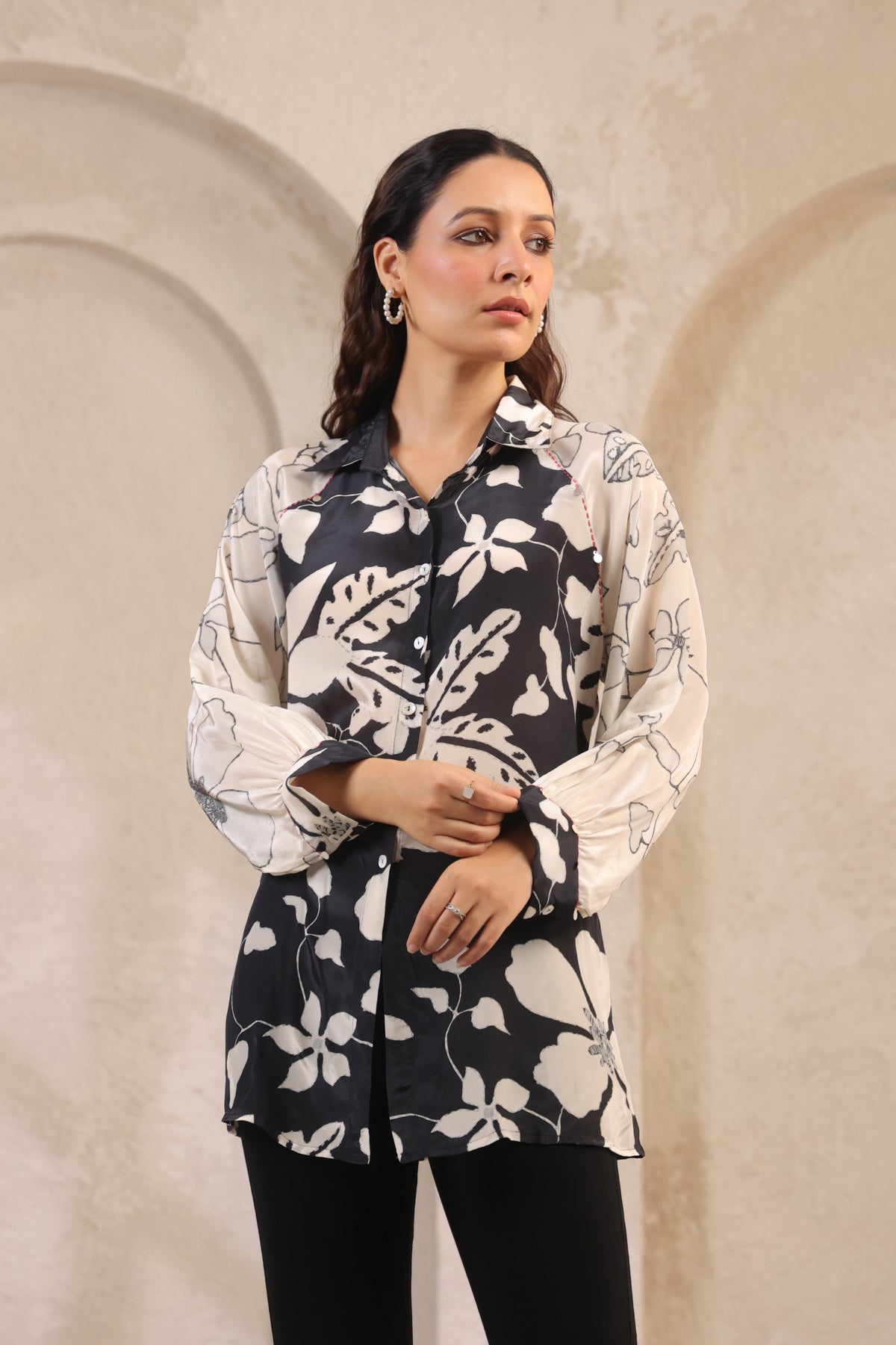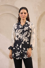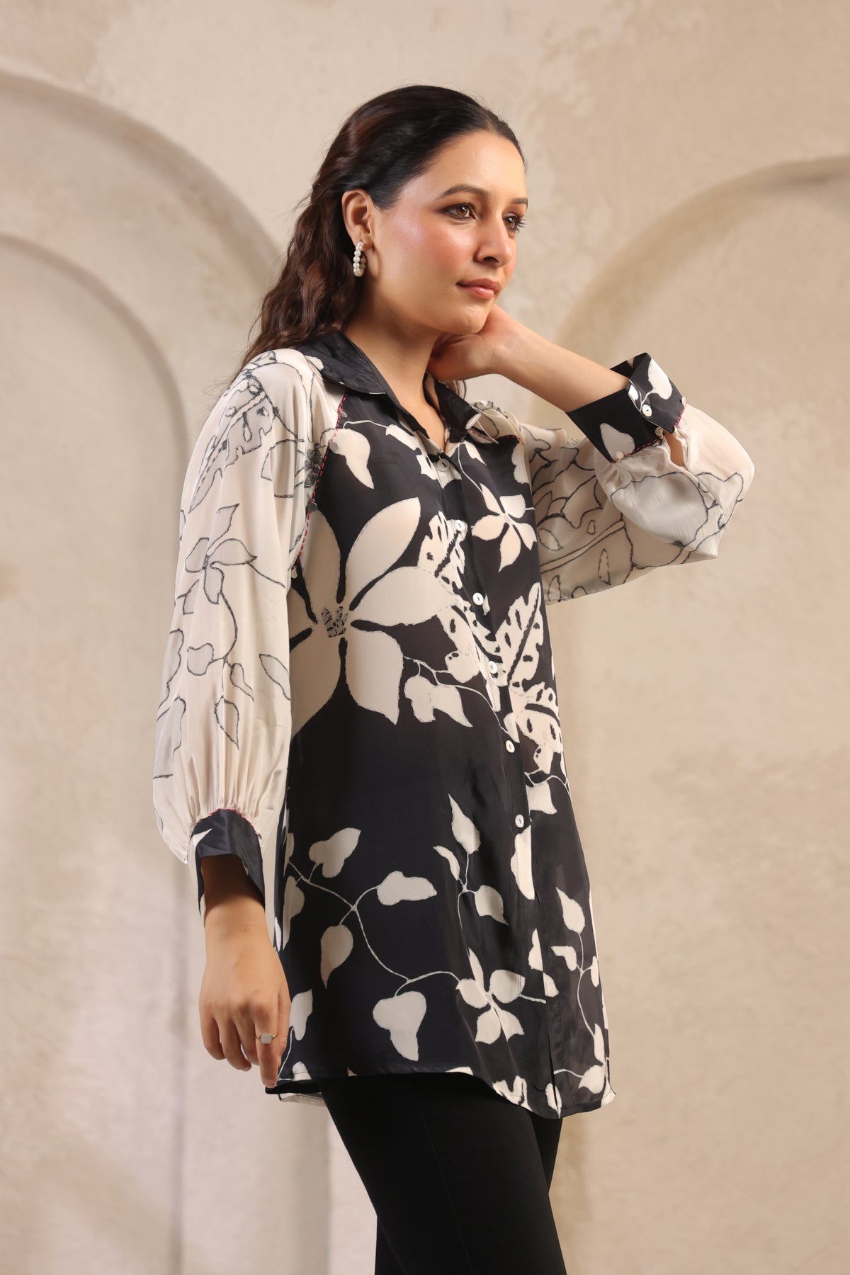 A button-down front paired with a crisp collared neckline creates a refined, structured silhouette. The contrast sleeves take the charm up a notch — featuring delicate sketch-style floral detailing that adds an artistic twist. Full sleeves with gathered cuffs bring a polished yet laid-back vibe, making this piece effortlessly chic.