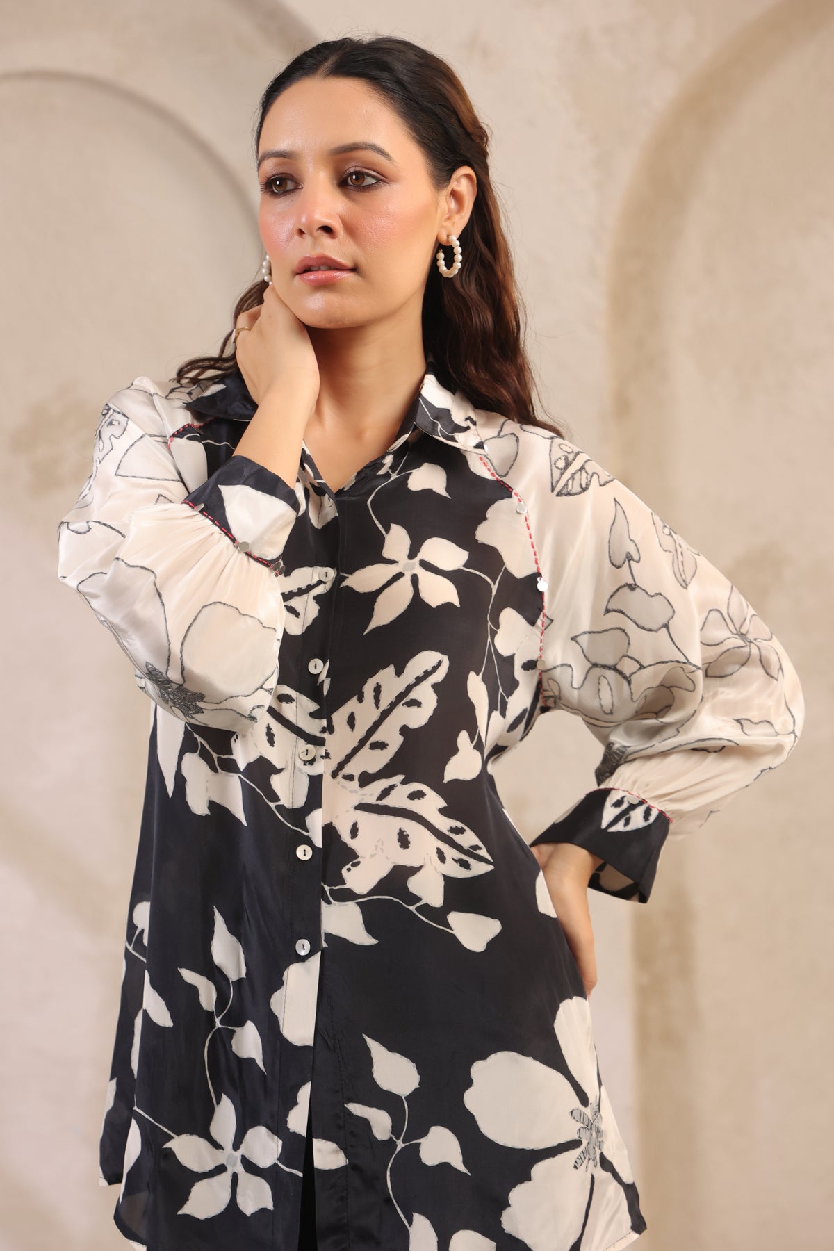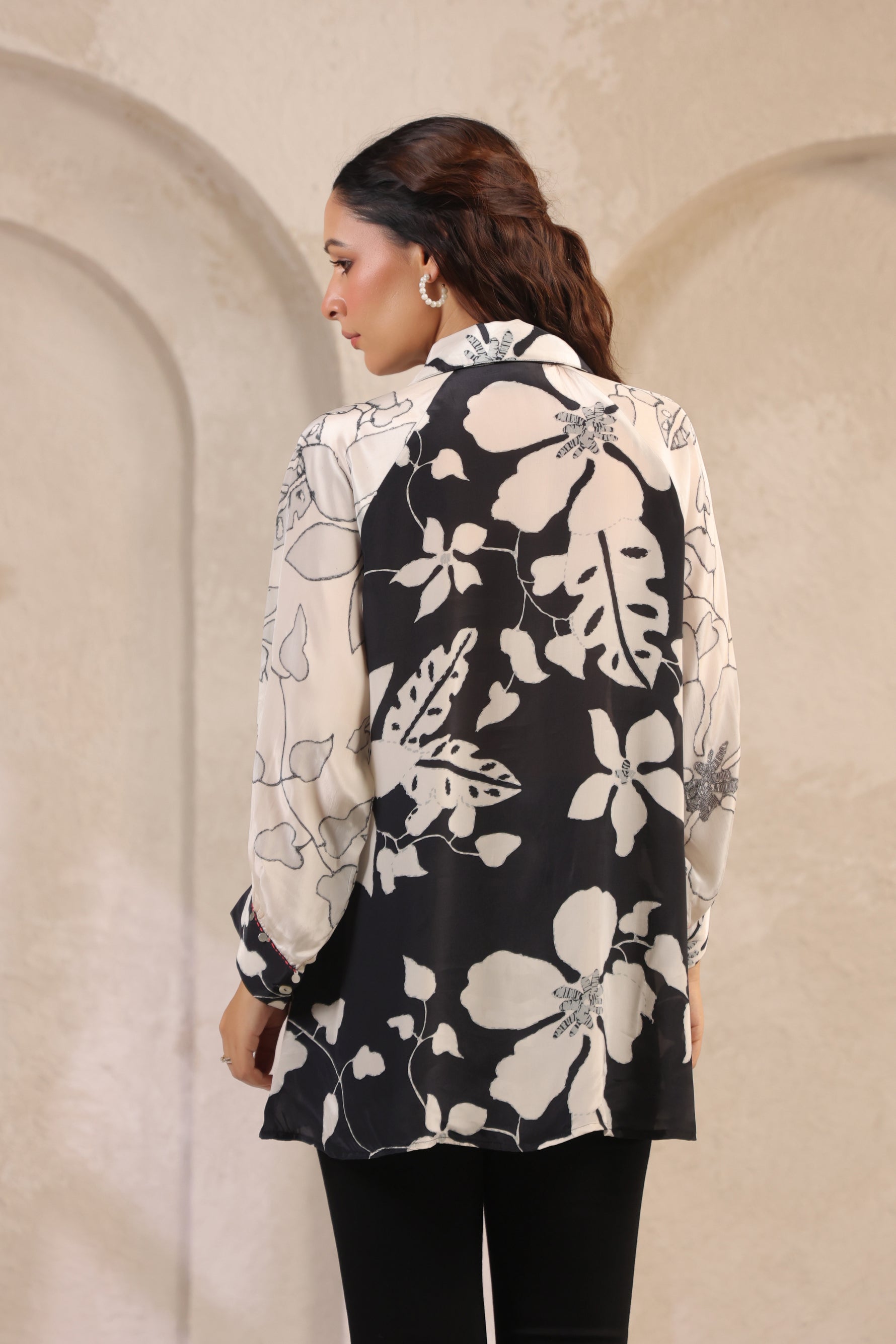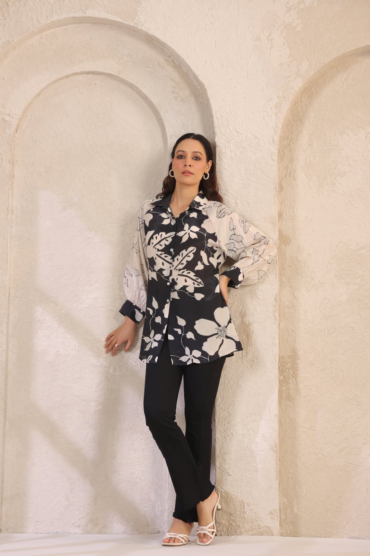 Elegance hits a whole new level with this black-and-ivory floral shirt, designed for anyone who loves timeless sophistication with a modern edge. The premium satin-touch fabric gives a soft, glossy finish that feels luxe against the skin.