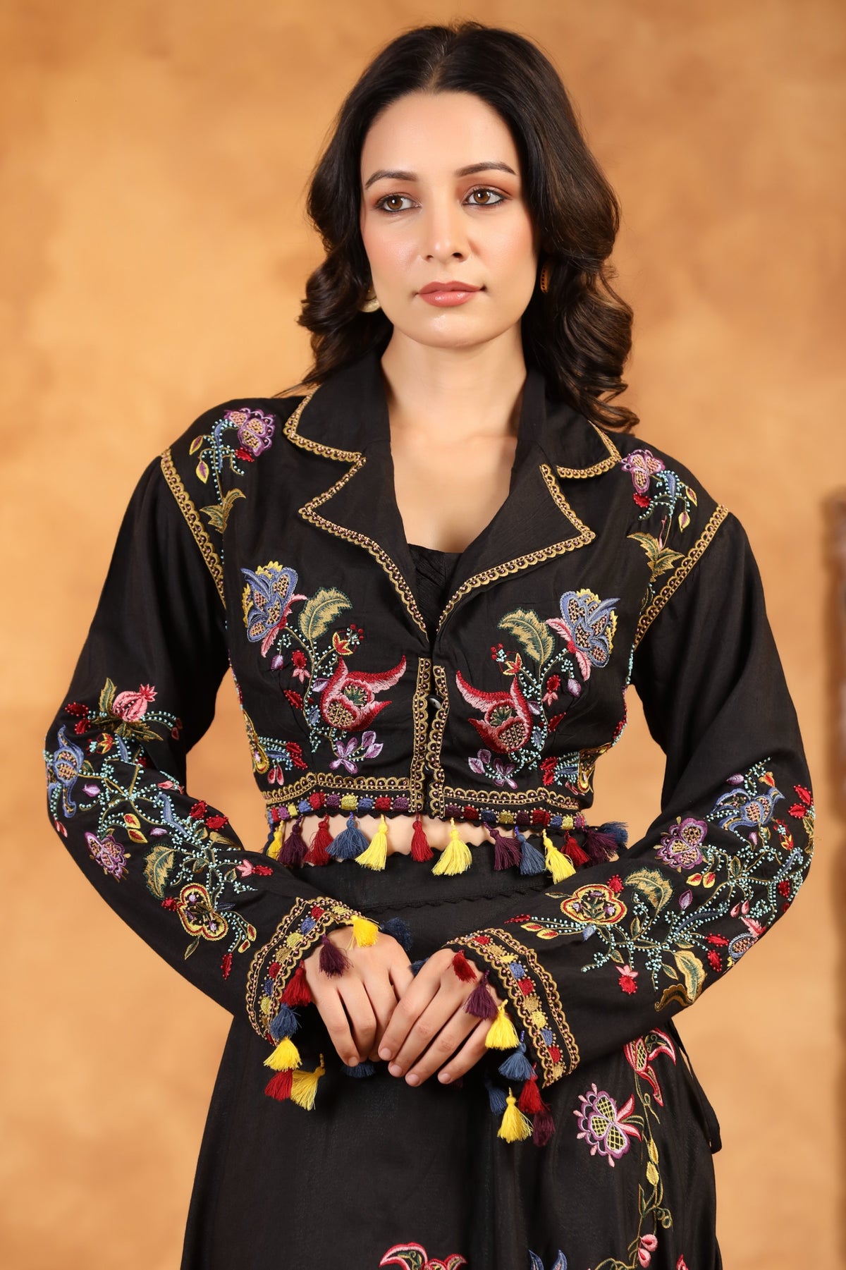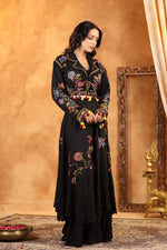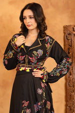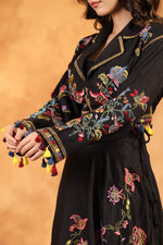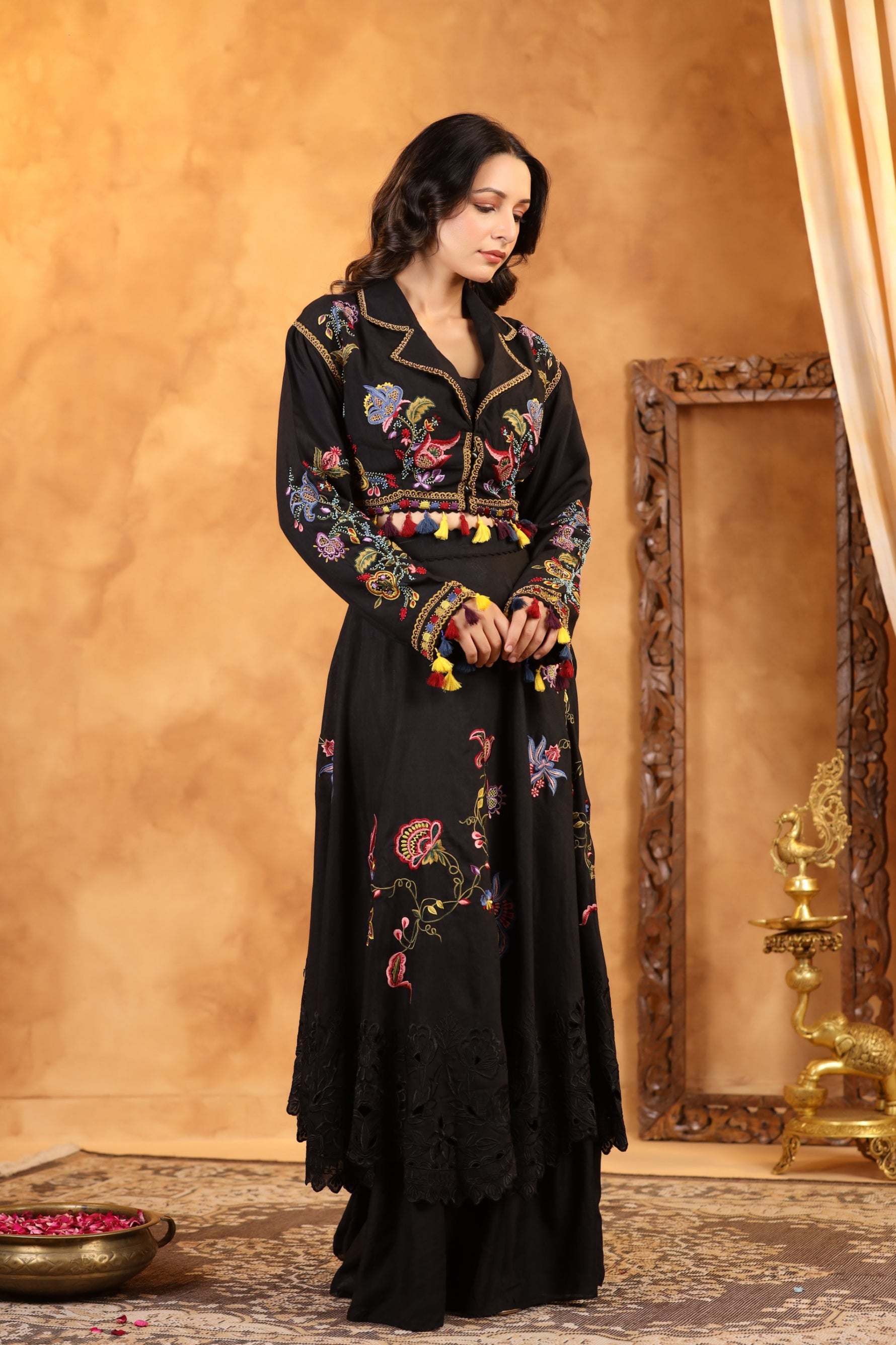 The Noir Enchanté Embroidered Co-ord Set is a captivating blend of vintage romance and contemporary elegance. Crafted in a deep, enchanting black, the ensemble features a beautifully embroidered cropped jacket adorned with multicoloured floral threadwork and playful tassel accents that add movement and charm.