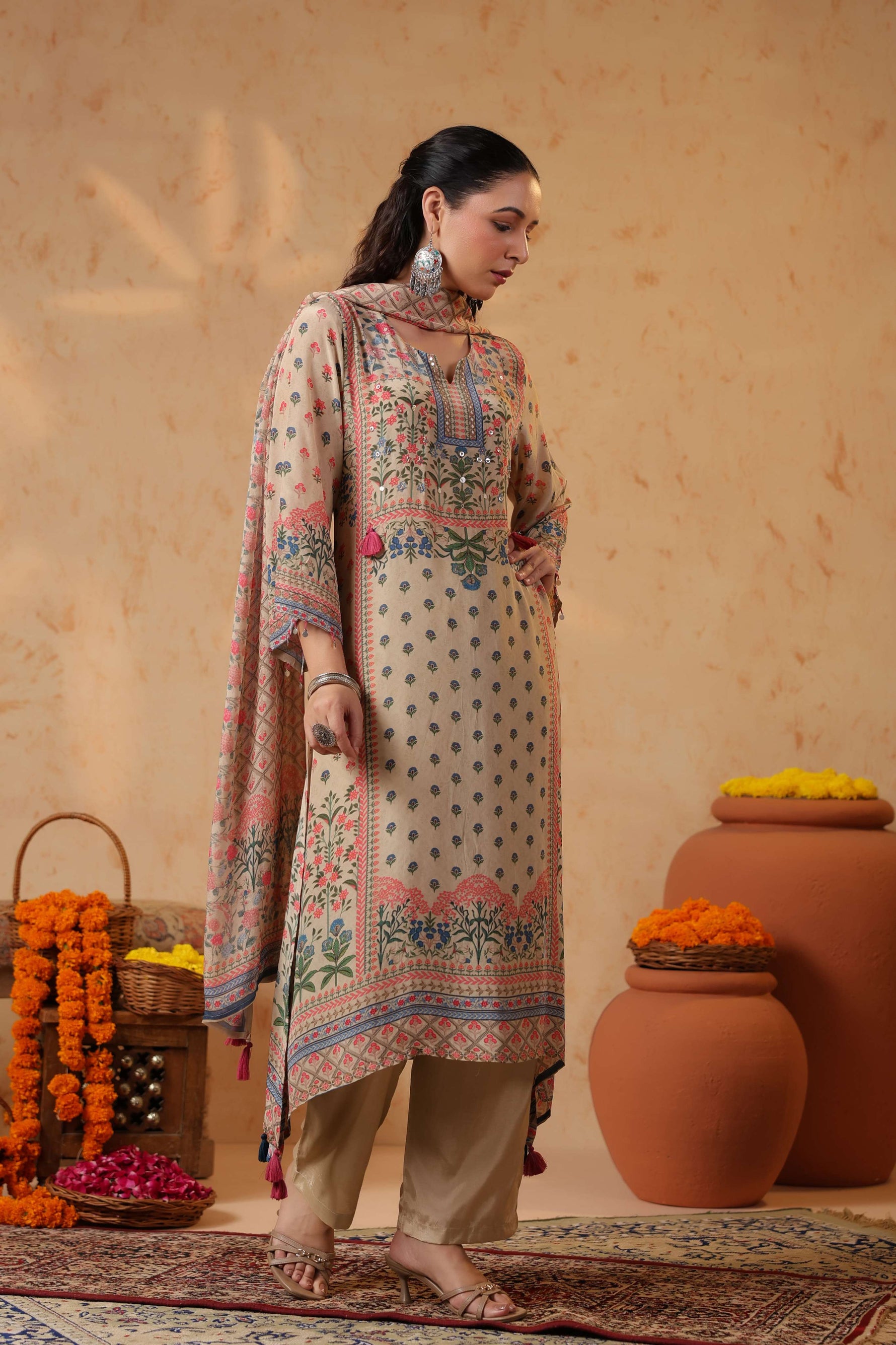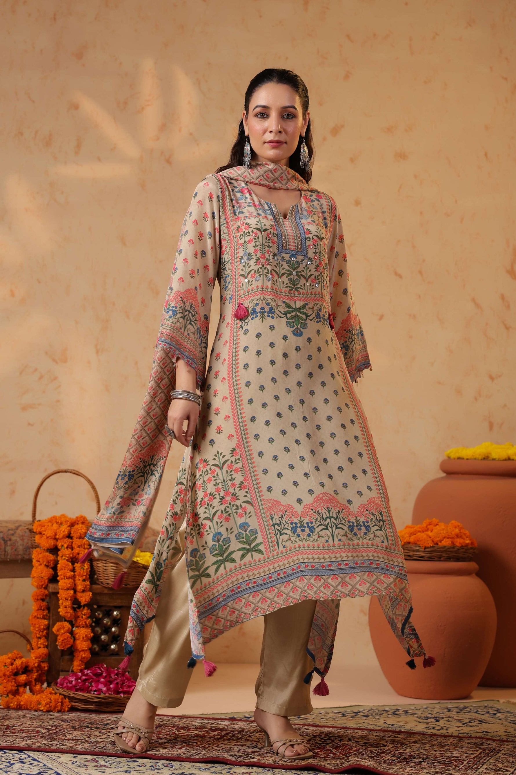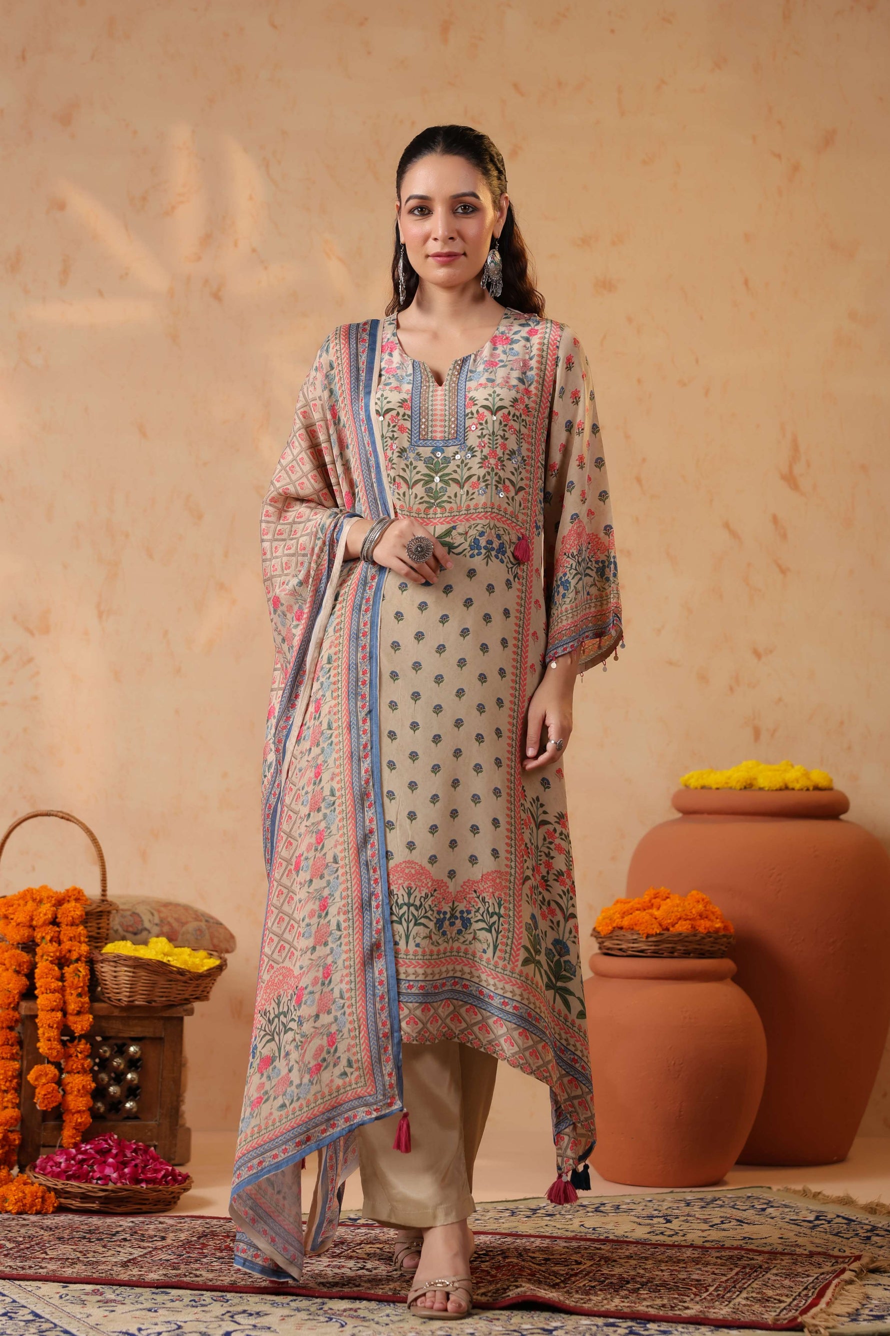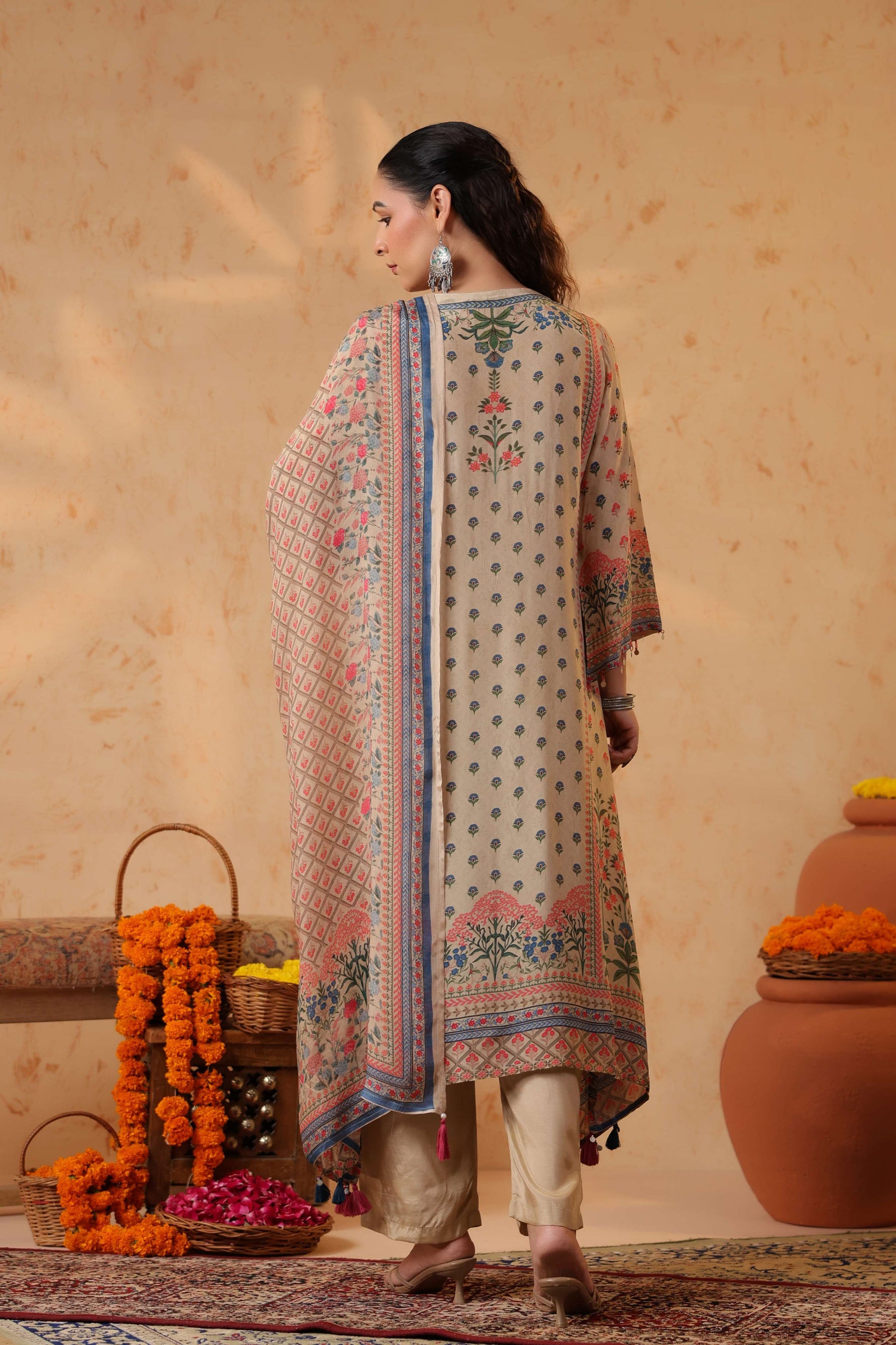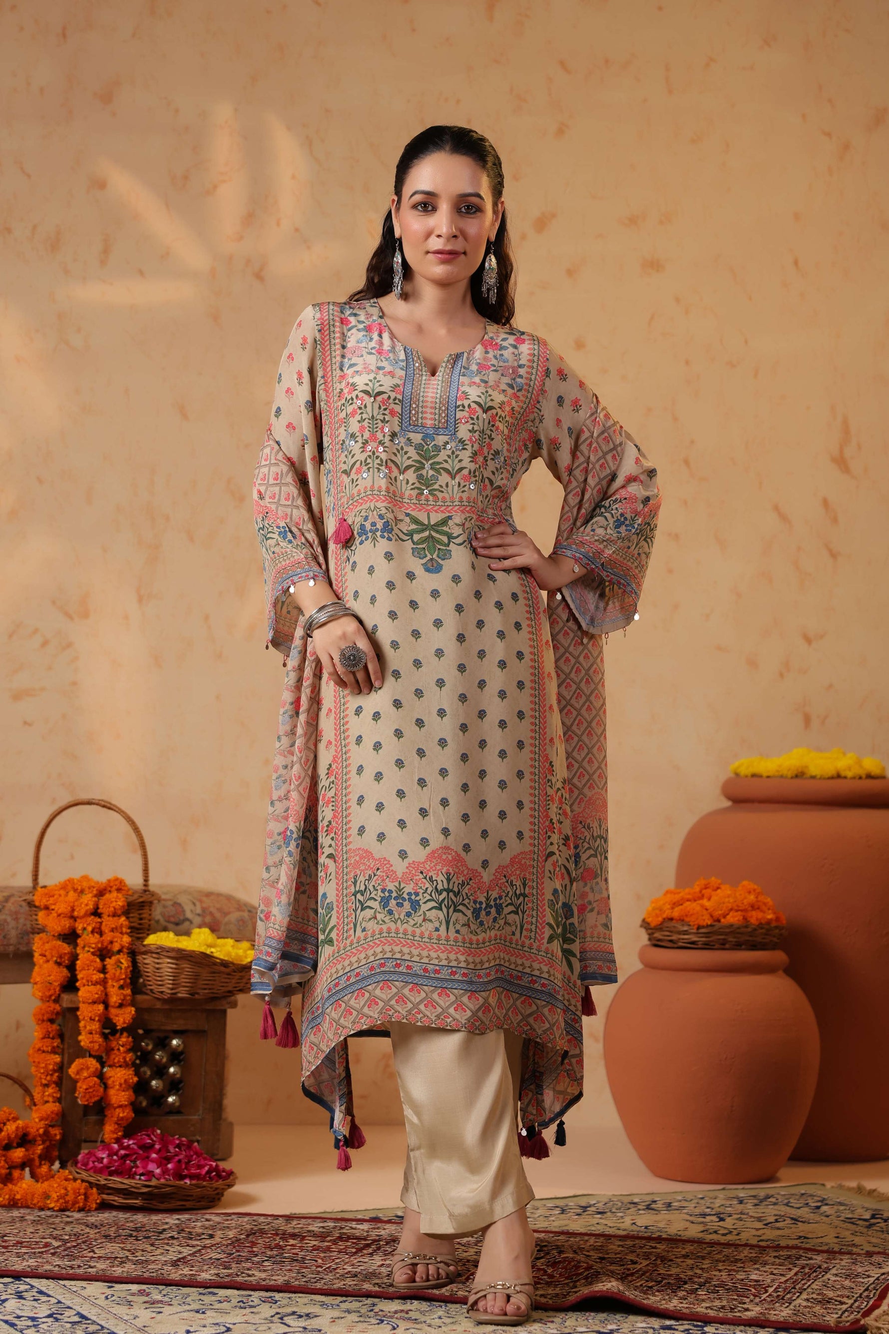 Full sleeves adorned with printed borders enhance the traditional appeal, balancing the design with subtle detailing. Paired with solid cream straight pants, the silhouette stays clean, graceful, and universally flattering.