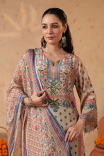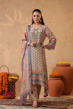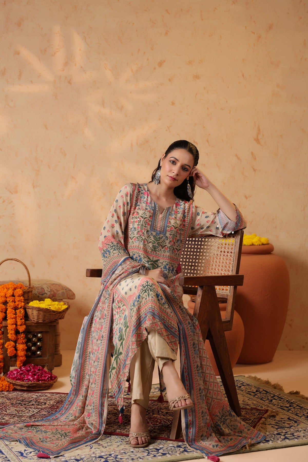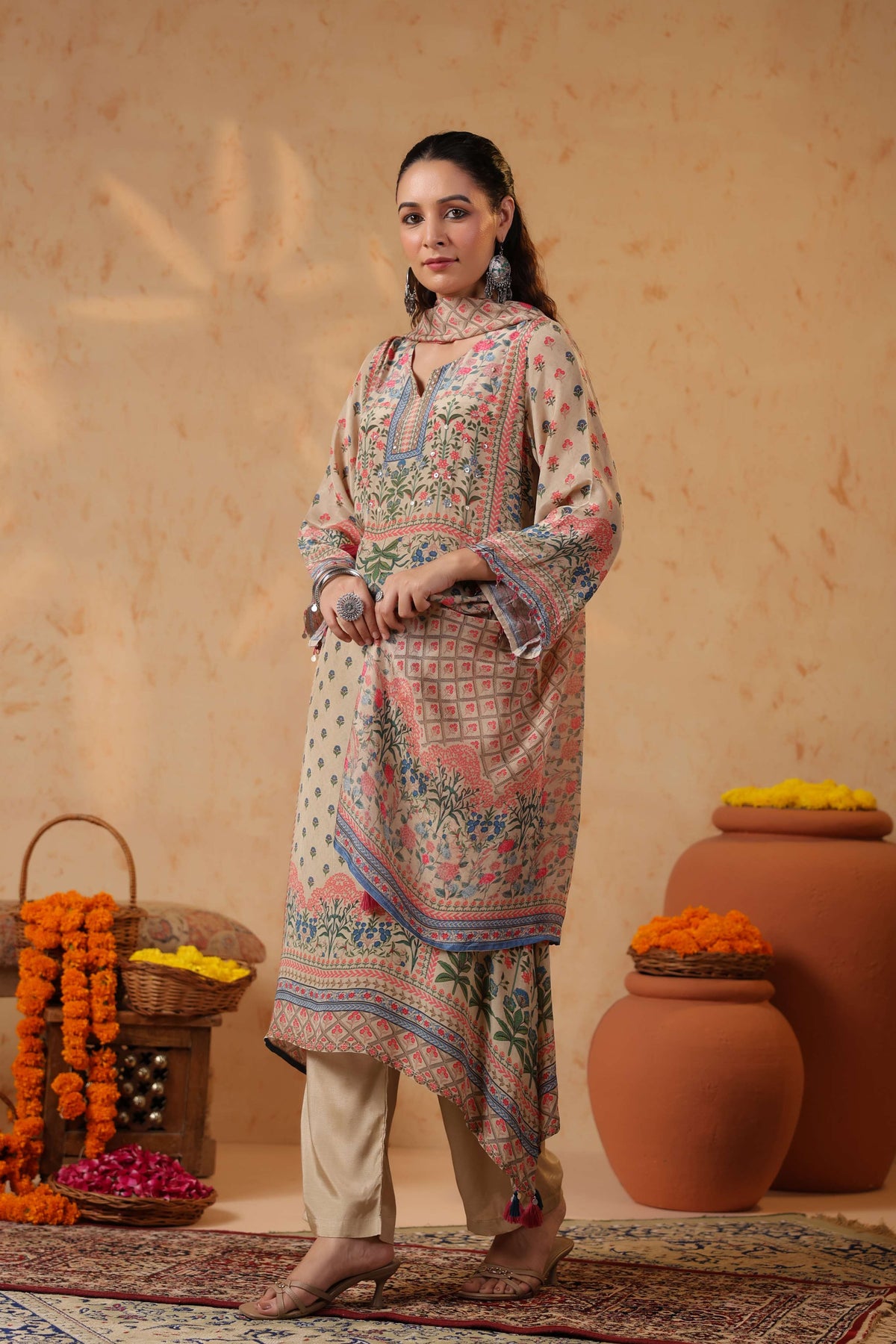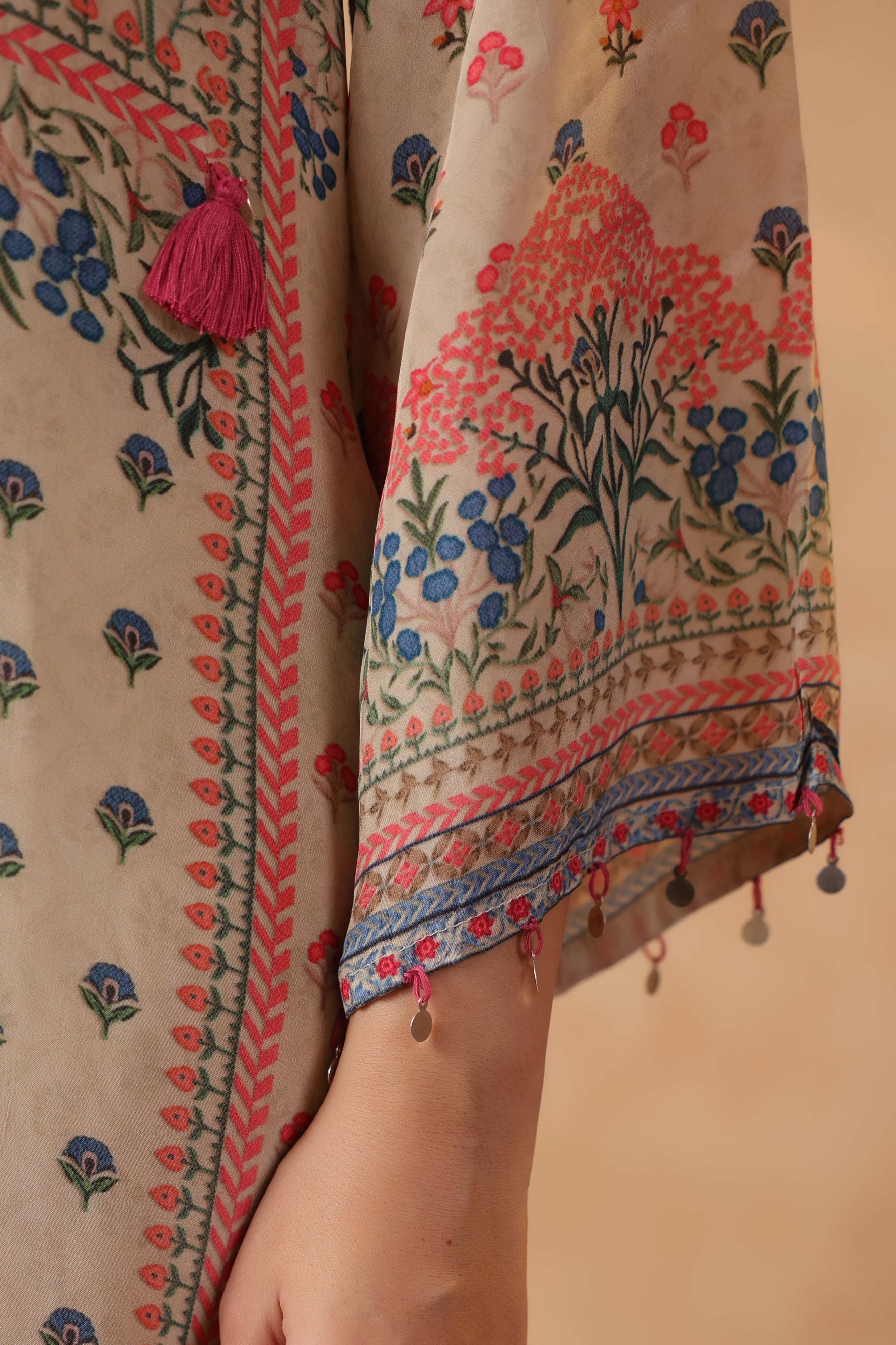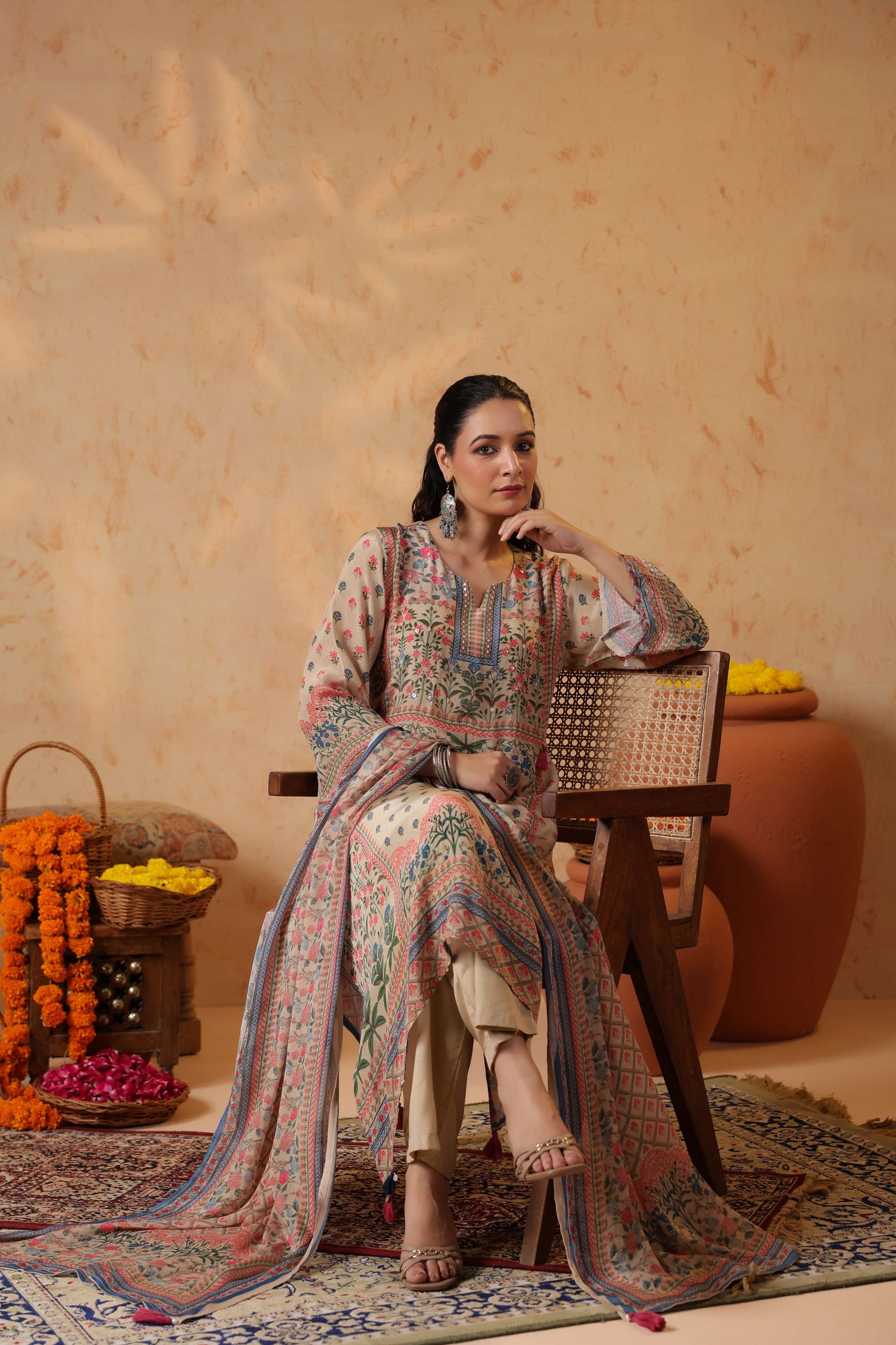 Full sleeves adorned with printed borders enhance the traditional appeal, balancing the design with subtle detailing. Paired with solid cream straight pants, the silhouette stays clean, graceful, and universally flattering.
