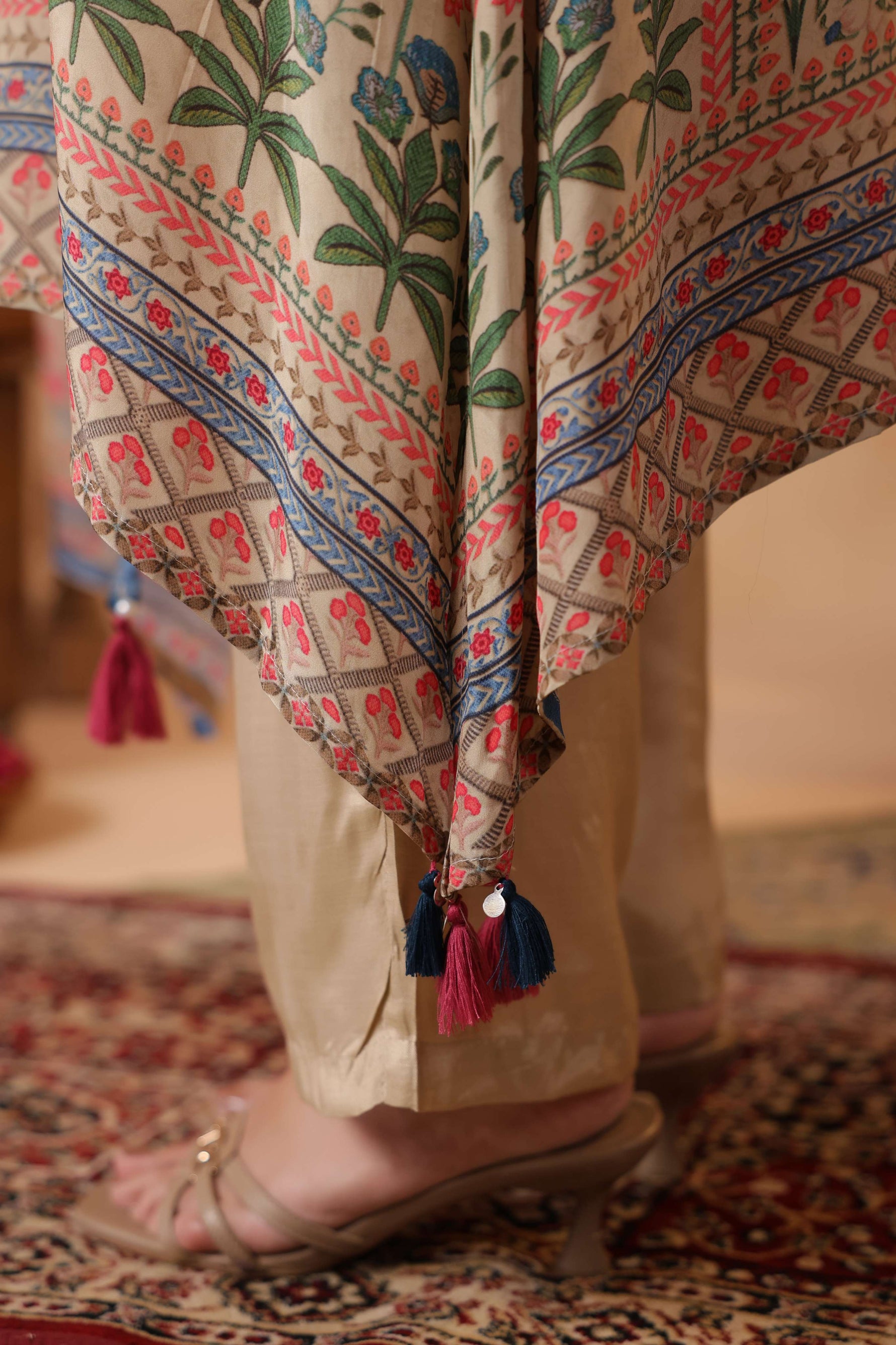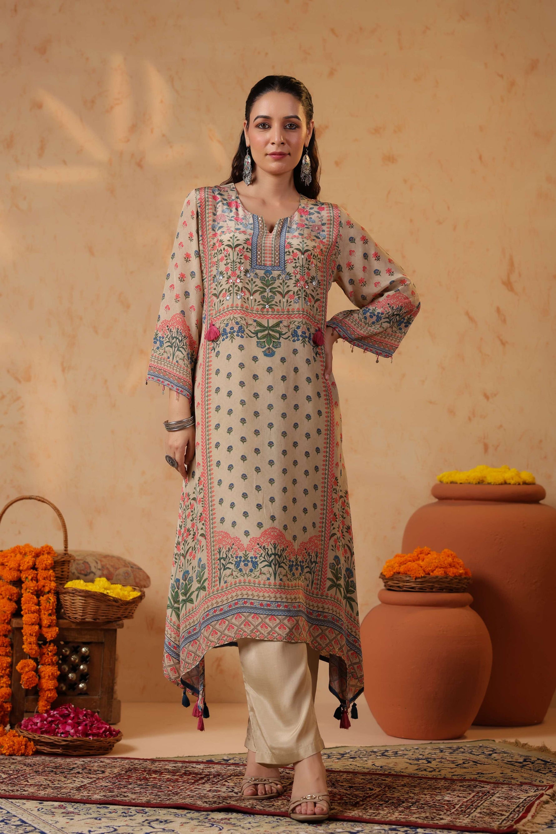 The kurta showcases intricate block-inspired floral and geometric motifs, giving it a timeless, handcrafted charm. A beautifully detailed neckline with contrast embroidery adds structure and sophistication, while the flowing asymmetrical hemline — finished with playful tassel accents — brings movement and ethnic elegance to every step.