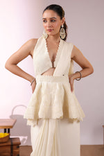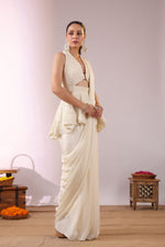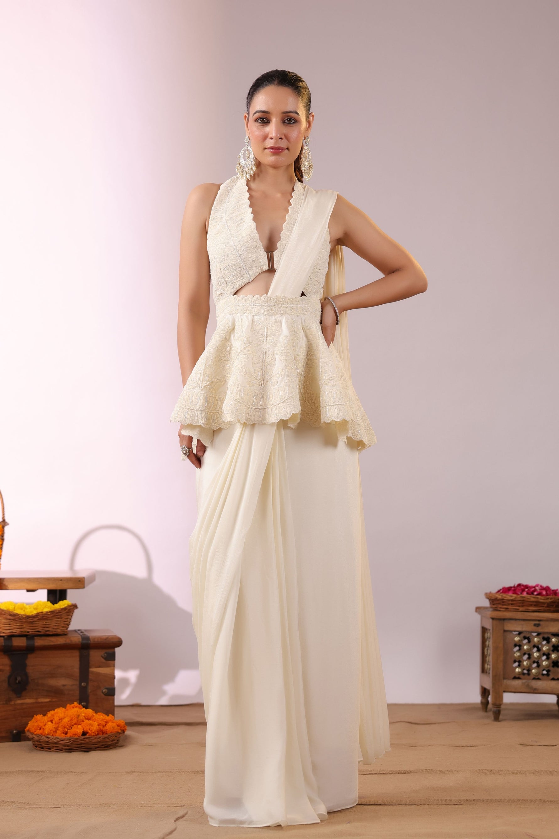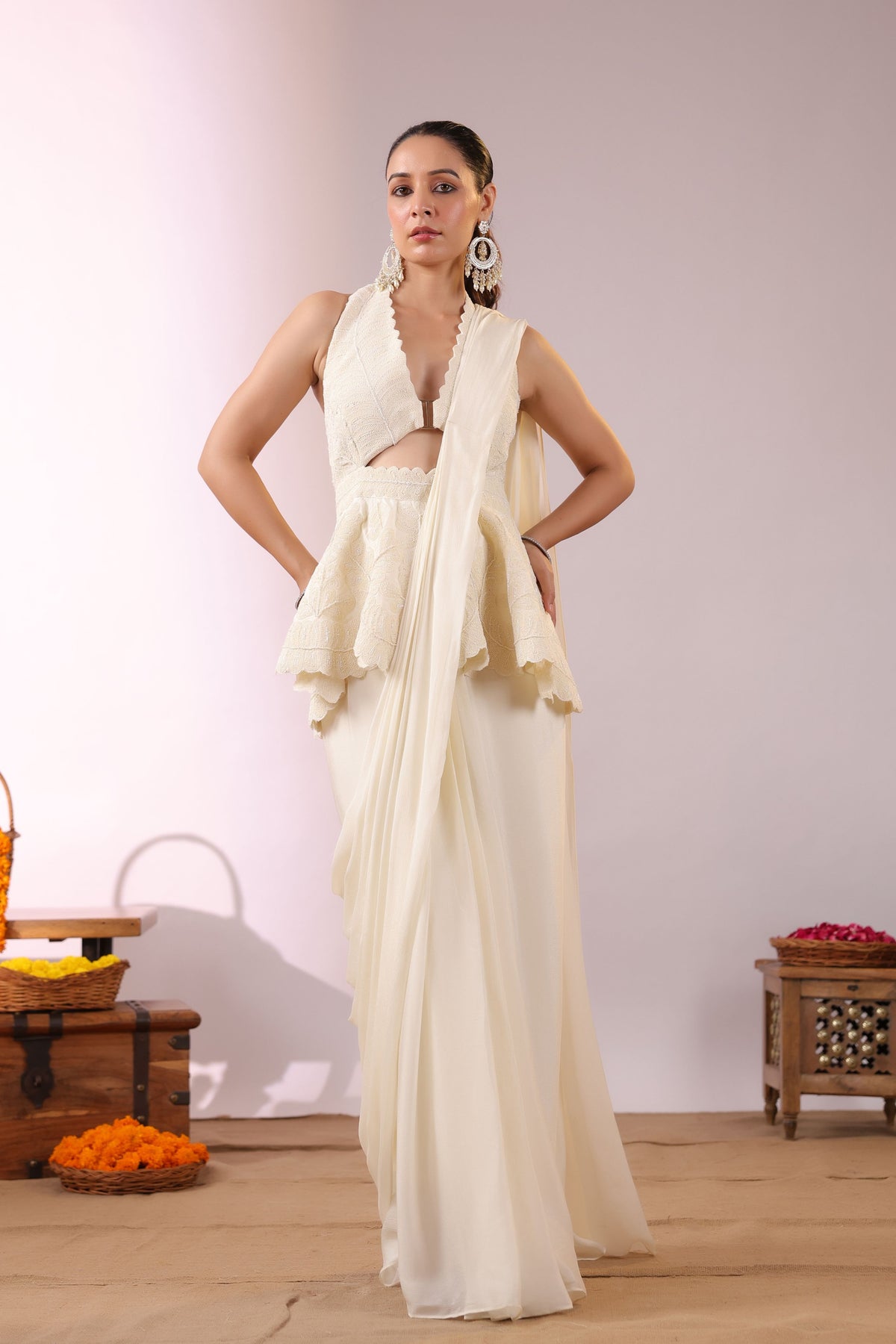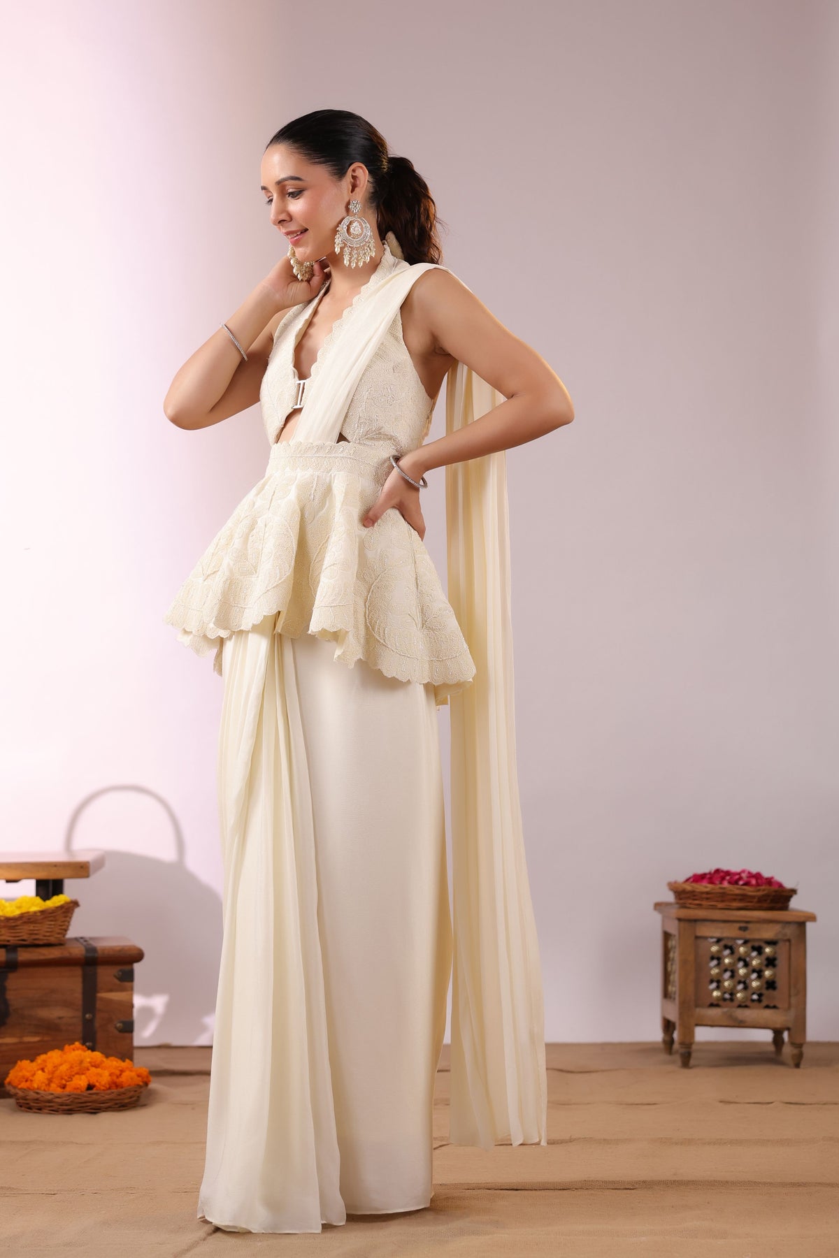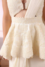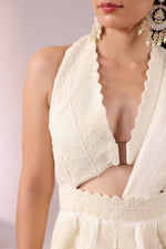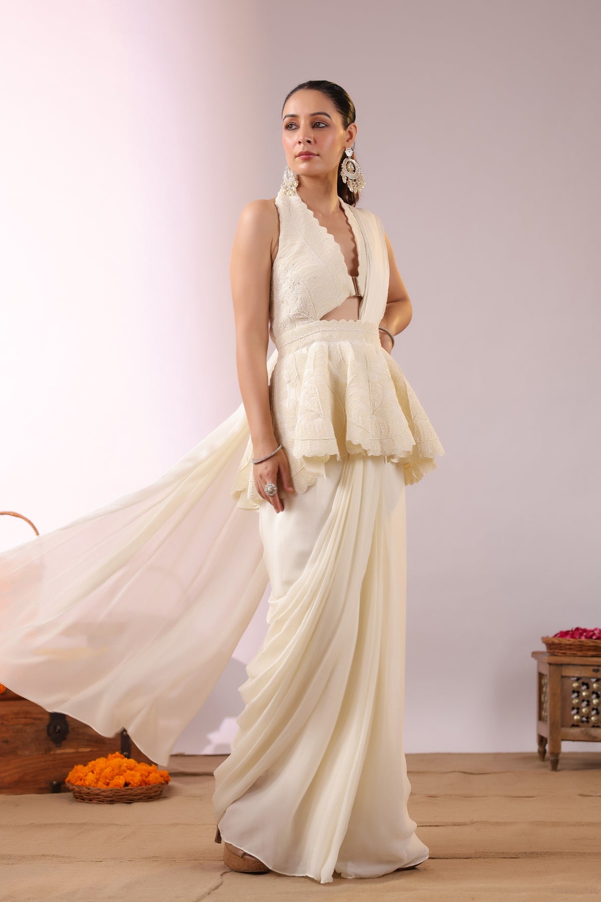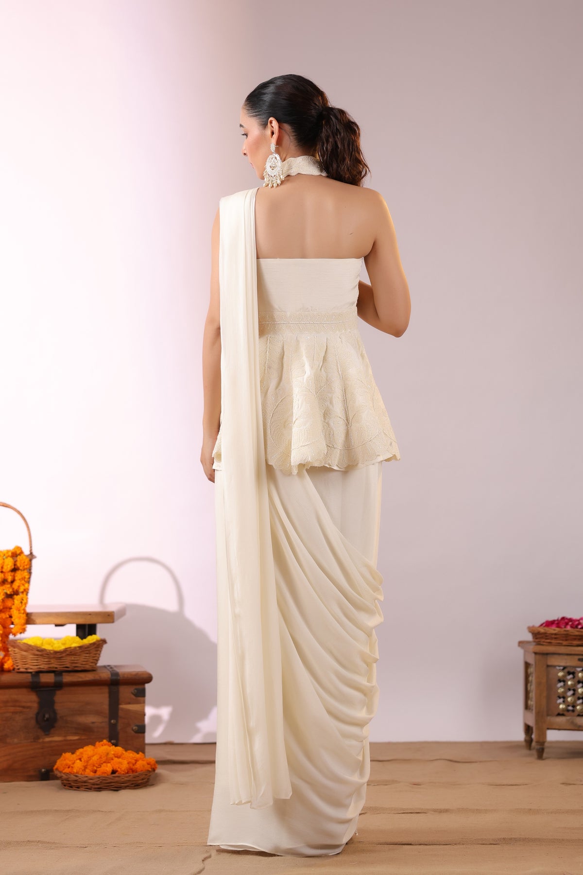 A masterpiece in ivory, the White Midnight Muse Drape Set is crafted for those who prefer their elegance soft, sculpted, and irresistibly refined. The halter-neck blouse features delicate scalloped edges and intricate thread embroidery throughout, giving it a dreamy, heirloom feel.
