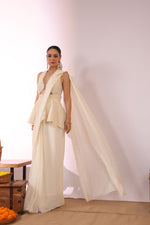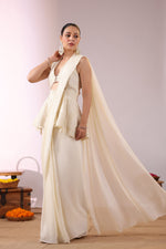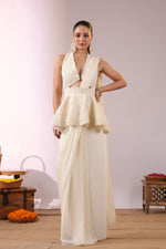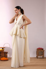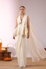 The White Midnight Muse Drape Set is your go-to when you want to channel serene luxury with a modern silhouette. With its embroidered halter blouse, sculpted peplum shape, and fluid draped bottoms, it creates a complete couture-level look in seconds. The ivory palette keeps it timeless, while the cut-out and clasp detailing add just the right touch of contemporary edge. Ideal for special evenings where you want to glow softly yet command the room with effortless grace.